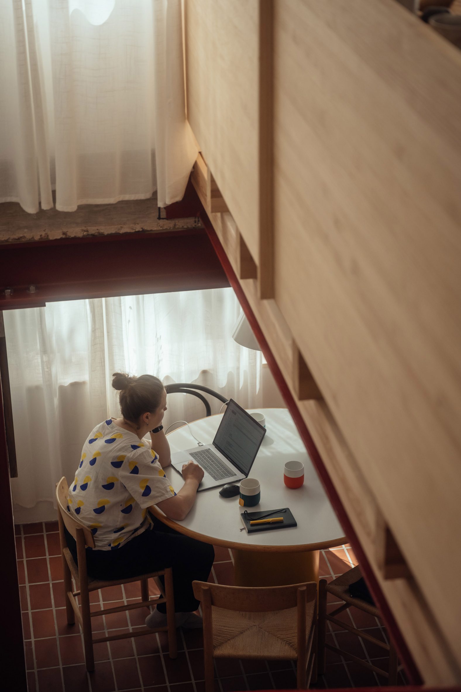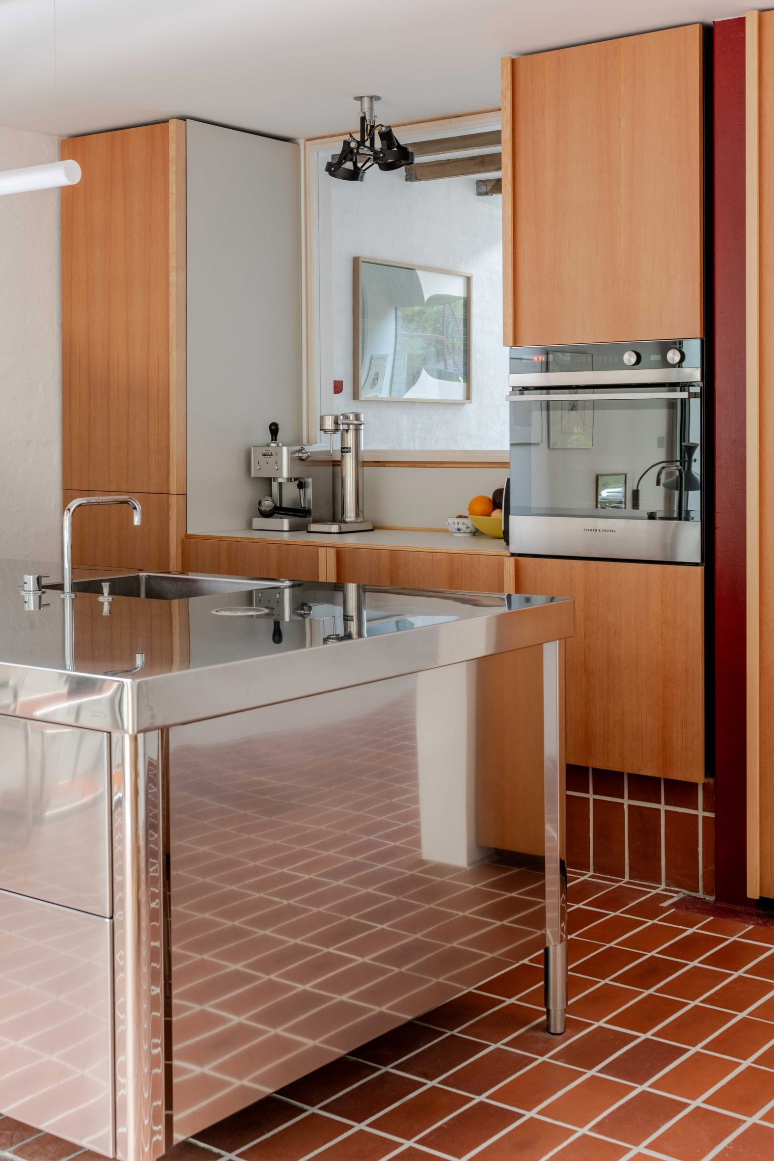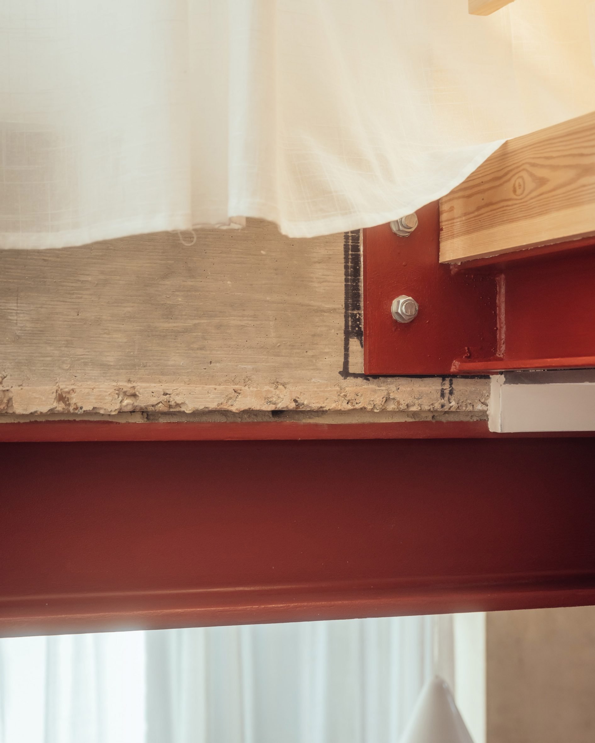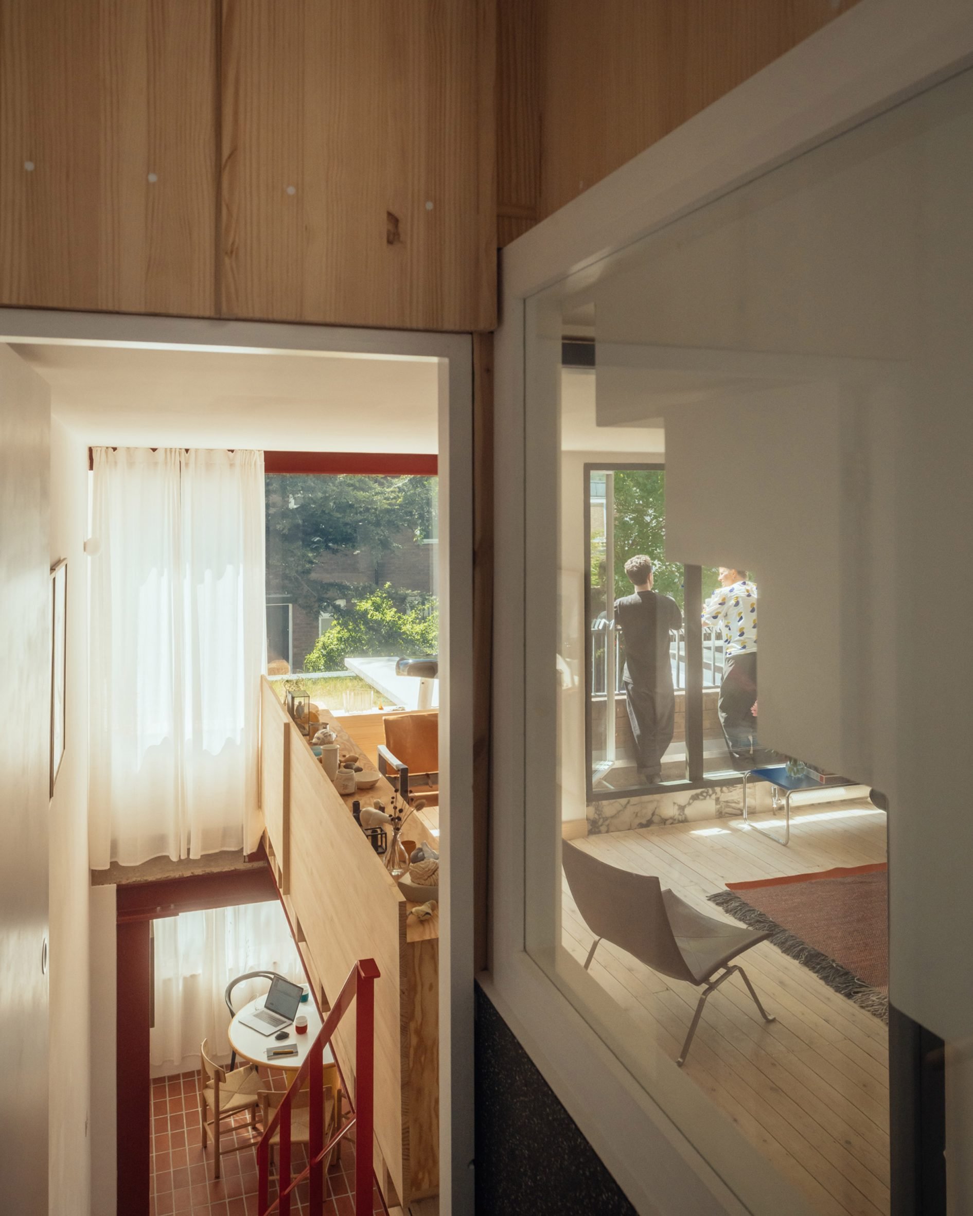붉은 강철 포털 프레임은 기존 주택과 콘크리트 확장부가 만나는 경계를 명확하게 표시한다. 미닫이 유리문은 테라코타 바닥 타일로 내부와 유기적으로 연결된 남쪽의 정원 테라스로 열린다. 이러한 설계는 내·외부 공간의 자연스러운 연속성을 만들어내며, 한국 전통 건축에서 볼 수 있는 '안과 밖의 조화로운 흐름'을 현대적으로 재해석한 듯한 느낌을 준다.