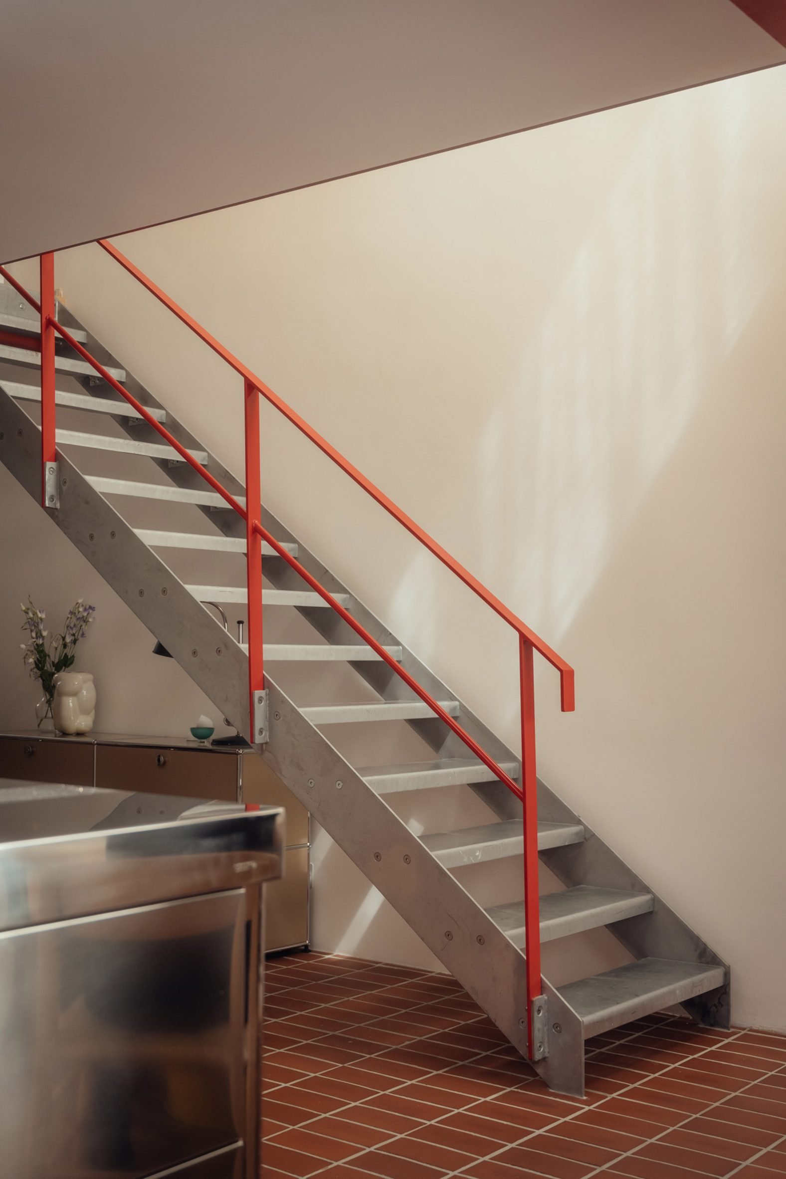 이미지에서 볼 수 있듯이, 테라코타 바닥 타일과 노출된 벽돌벽, 강철 계단과 붉은색 레일링 사이의 대비는 감각적인 공간 경험을 만들어낸다. 이는 한국 현대 건축에서도 종종 볼 수 있는 '재료 본연의 물성 존중'과 '최소한의 장식을 통한 공간적 풍요로움'의 철학과 맥을 같이한다.