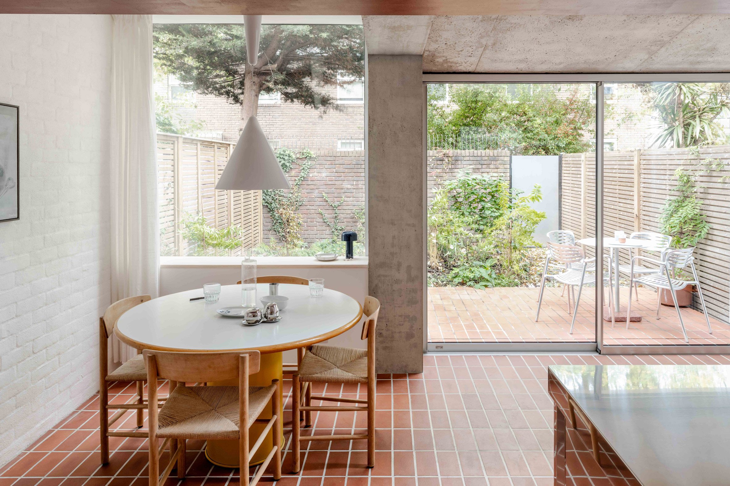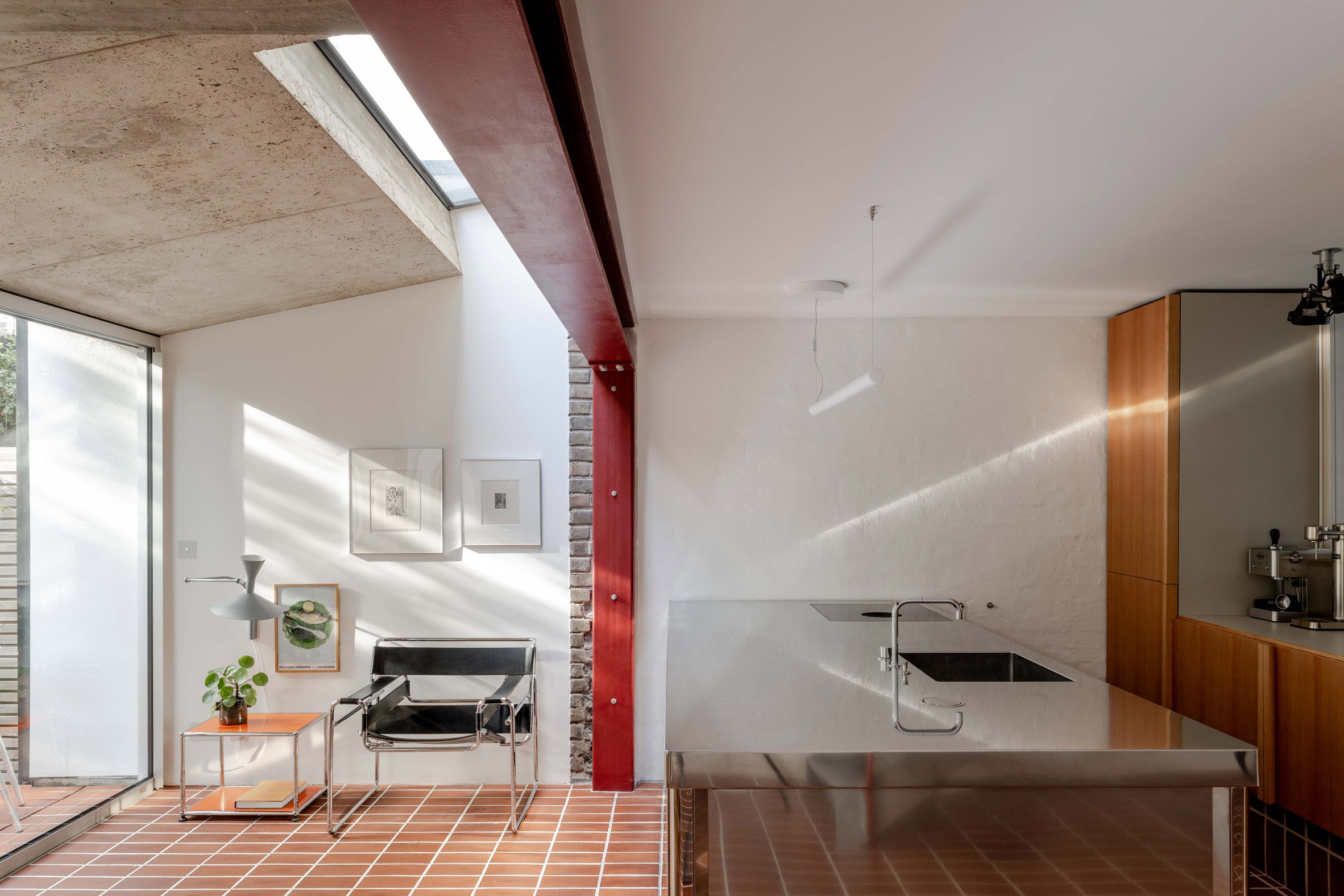 A red steel portal frame demarcates the point at which the existing home meets this concrete extension, while sliding glass doors open onto a garden terrace to the south that is linked to the interior by terracotta floor tiles.
