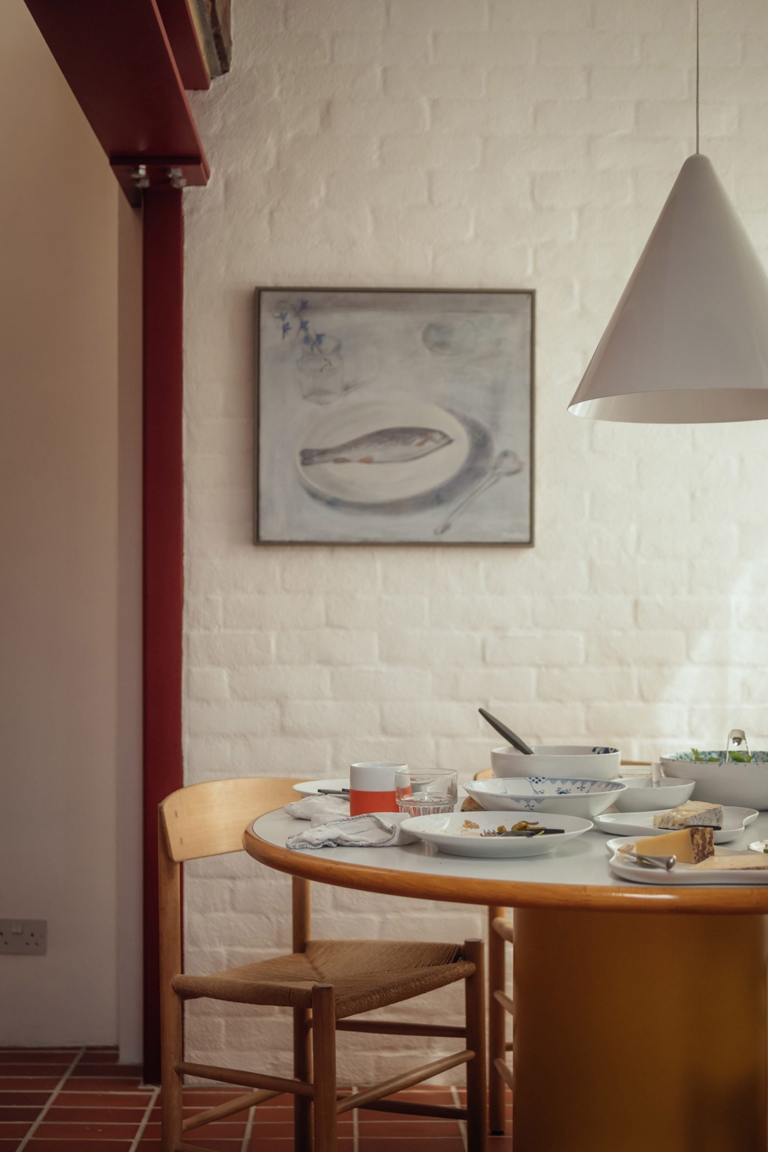 A concrete dining room cast in situ and framed by red steelwork forms the heart of this Hackney home, remodelled and extended by London studio Archmongers.