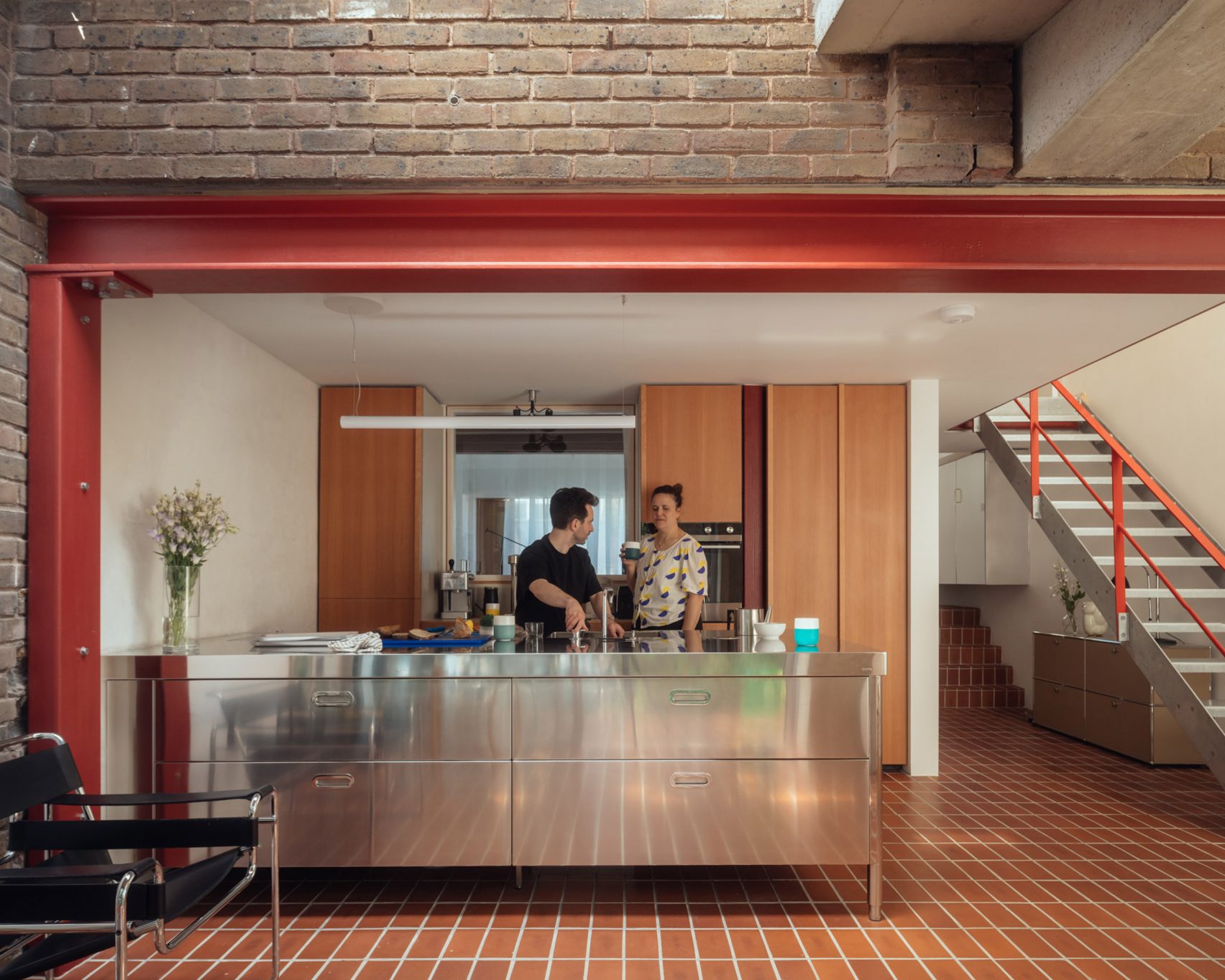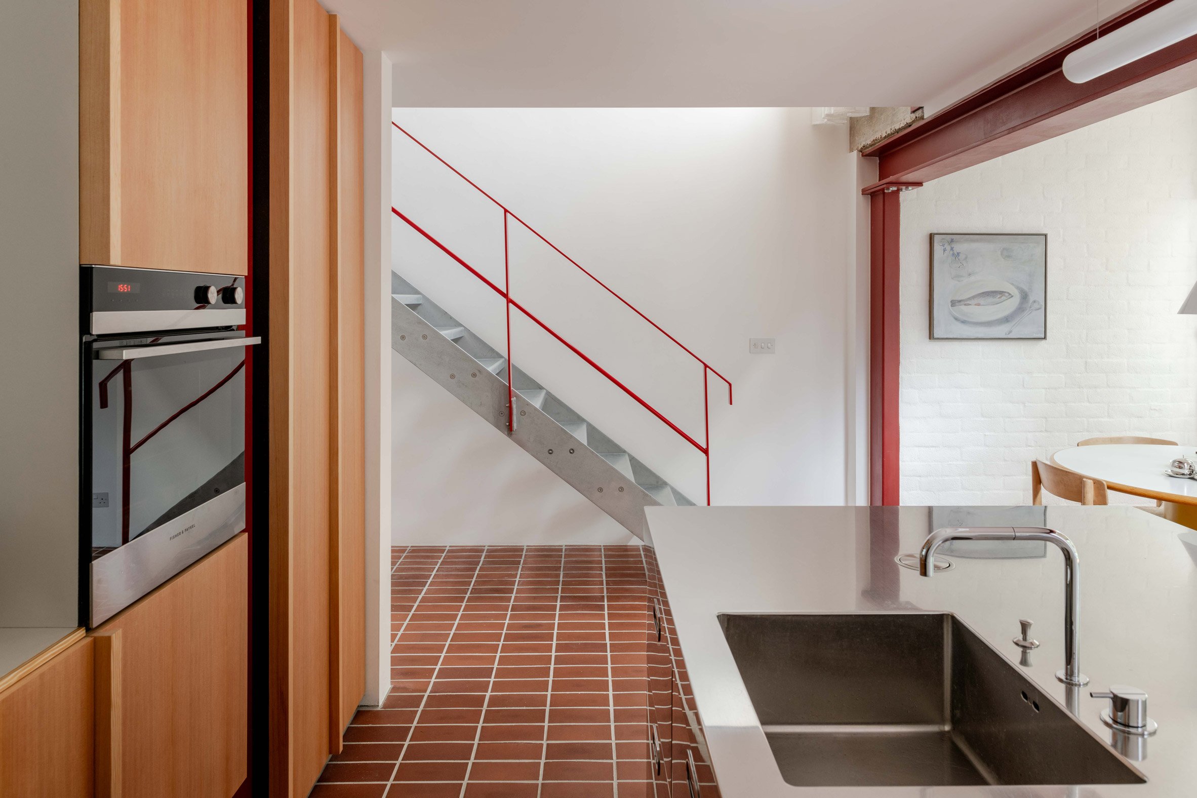 Similarly to the structural changes, the material palette has been kept deliberately simple, with the exposed concrete and brickwork contrasted by minimal white walls, a stainless steel kitchen island and Douglas fir cabinets.