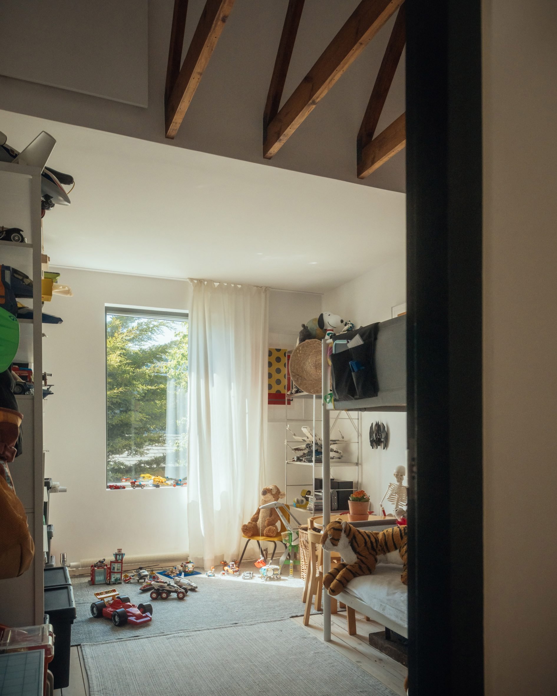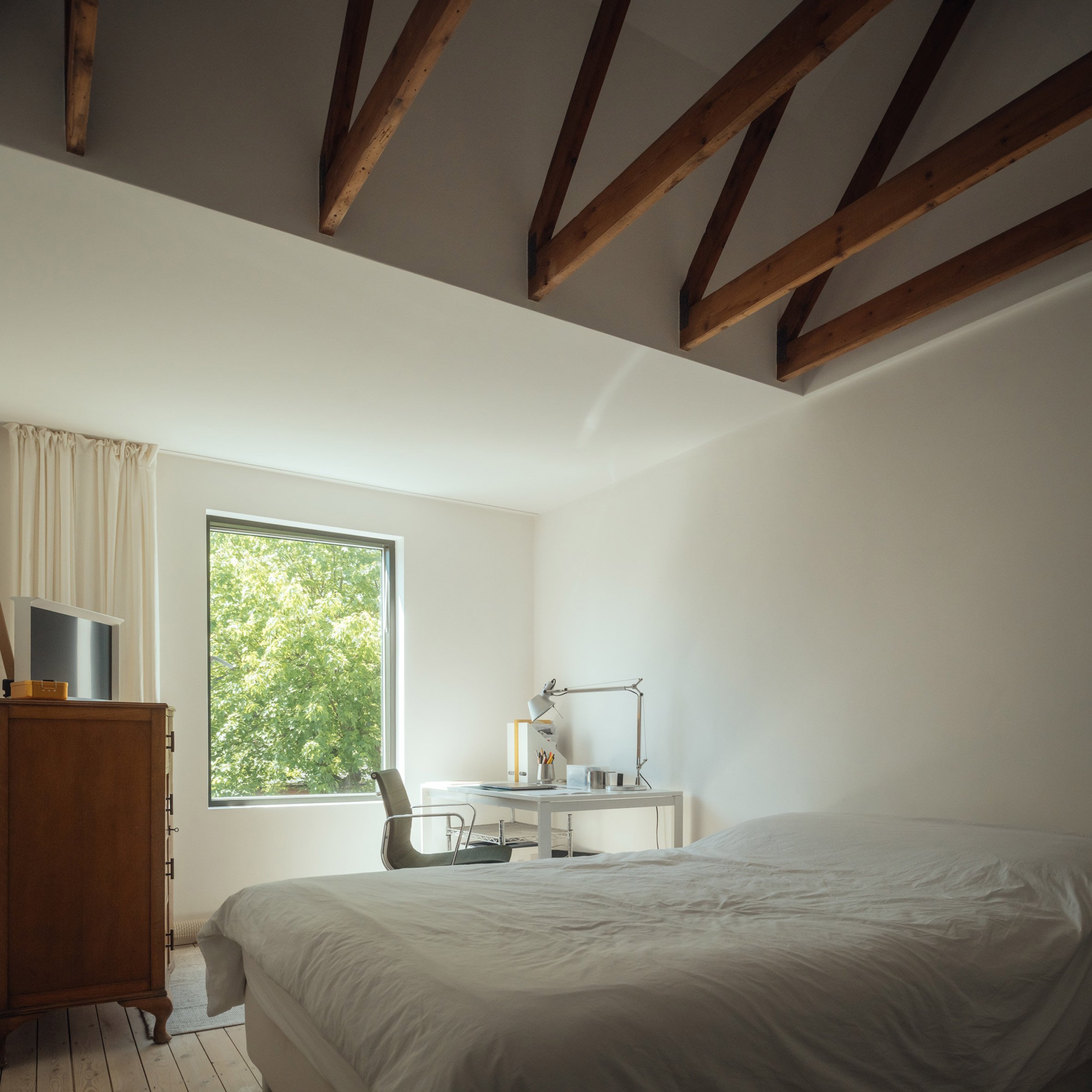거실 공간은 큰 창을 통해 자연광이 풍부하게 유입되며, 목재 바닥과 흰 벽의 조합이 공간에 따뜻함과 개방감을 동시에 부여한다. 침실은 목재 서까래가 노출된 경사진 천장으로 아늑한 분위기를 자아내며, 큰 창을 통해 외부 녹음과 자연스럽게 연결된다.