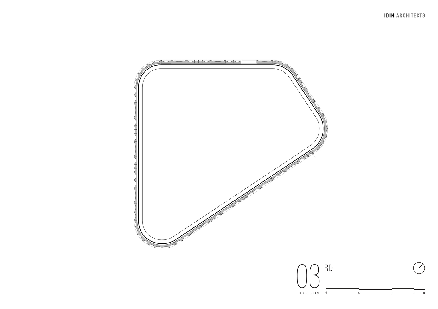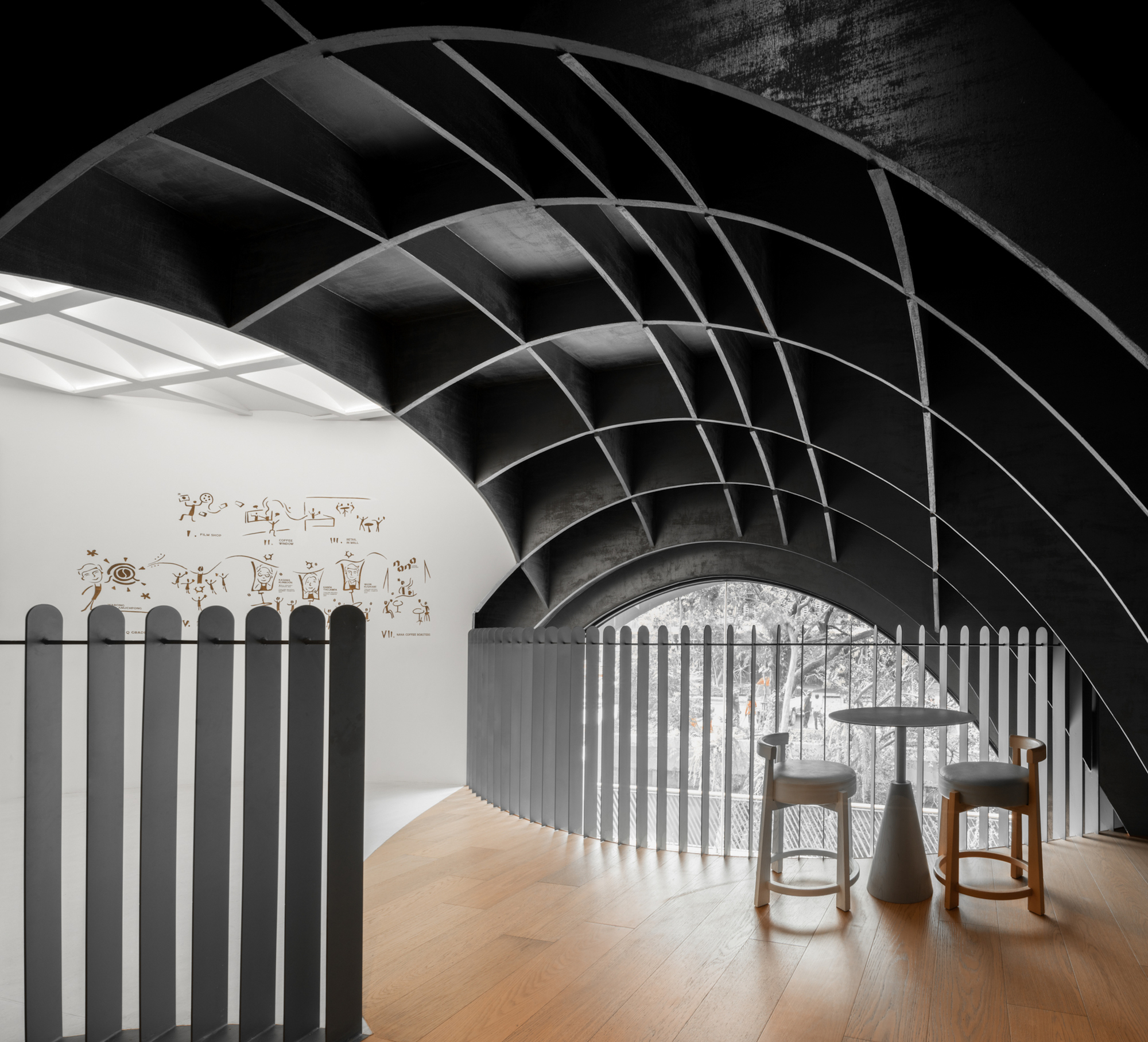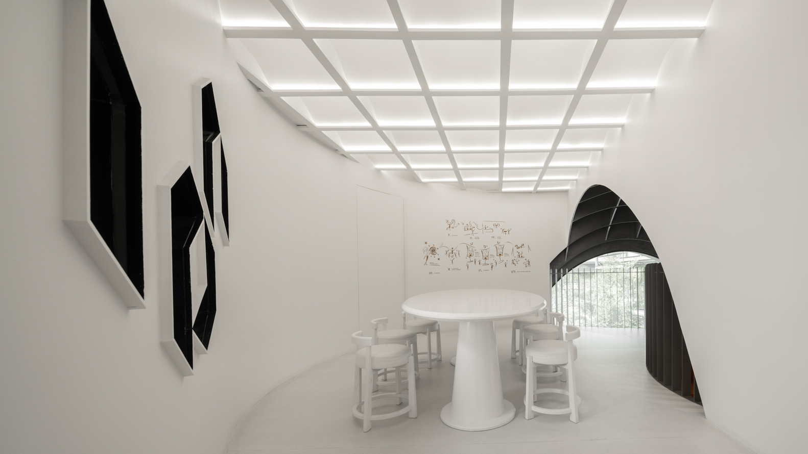 다양한 볼륨으로 형성된 내부 공간 사이의 여백은 간격이 다른 와플 구조로 채워져 있다. 이 구조물은 동일한 짙은 회색 질감으로 마감되어 자연석 표면의 느낌을 자아낸다. 내부 조명은 구조체의 격자 안에 숨겨져 중앙 홀을 강조하며, 이 공간은 자연스럽게 건물 내 다른 영역으로 흘러간다. 더 프라이빗한 경험을 원하는 방문객을 위해 중이층이 더해져 공간 탐험의 또 다른 층위를 제공한다.