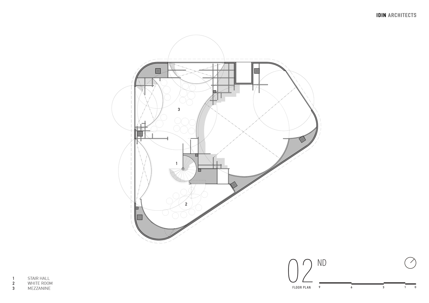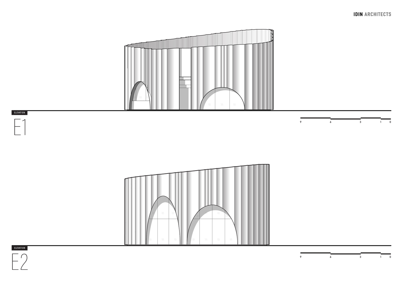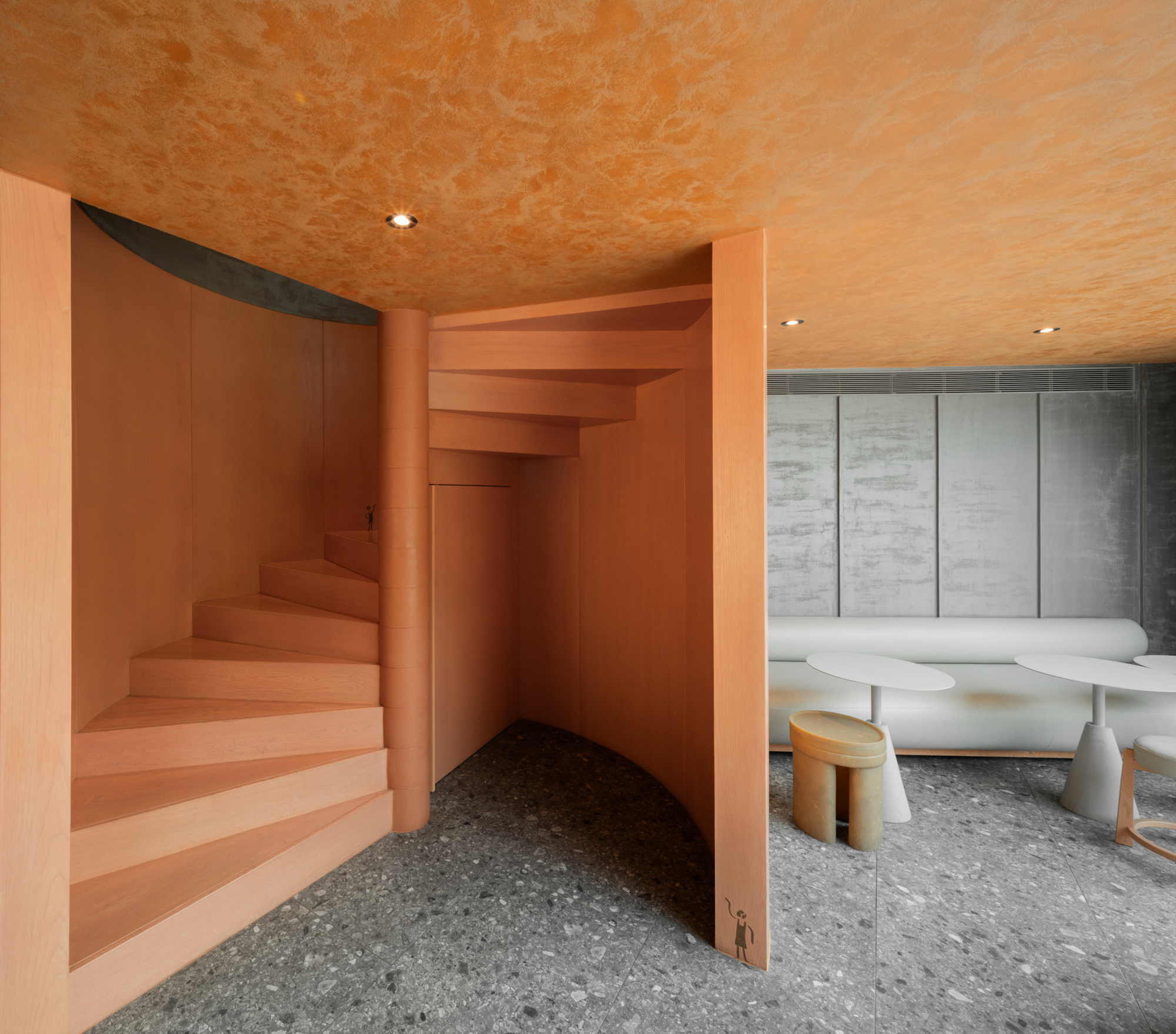 이 프로젝트는 건축과 인테리어 디자인을 분리하지 않고 하나로 통합했다. 외관은 의도적으로 폐쇄적으로 설계되어 내부를 감추고 호기심을 자극하는 동시에 내부로 들어오는 자연광의 양을 섬세하게 조절한다. 건물의 외피는 곡면 처리된 석재 베니어로 감싸여 있으며, 표면의 굴곡은 태양빛과 상호작용하며 파사드에 생동감 있는 그림자 패턴을 그려낸다. 이 견고한 덩어리 같은 외관은 방문객들이 내부에 대한 호기심을 품게 만든다.