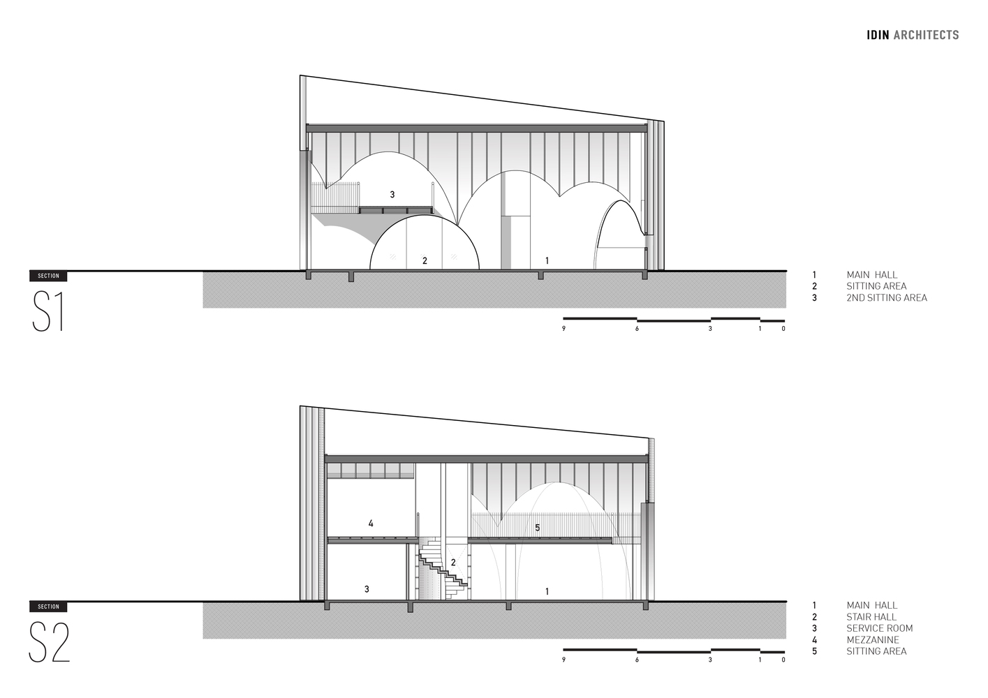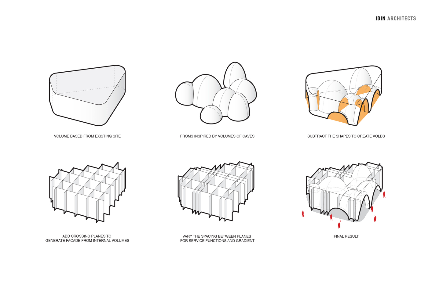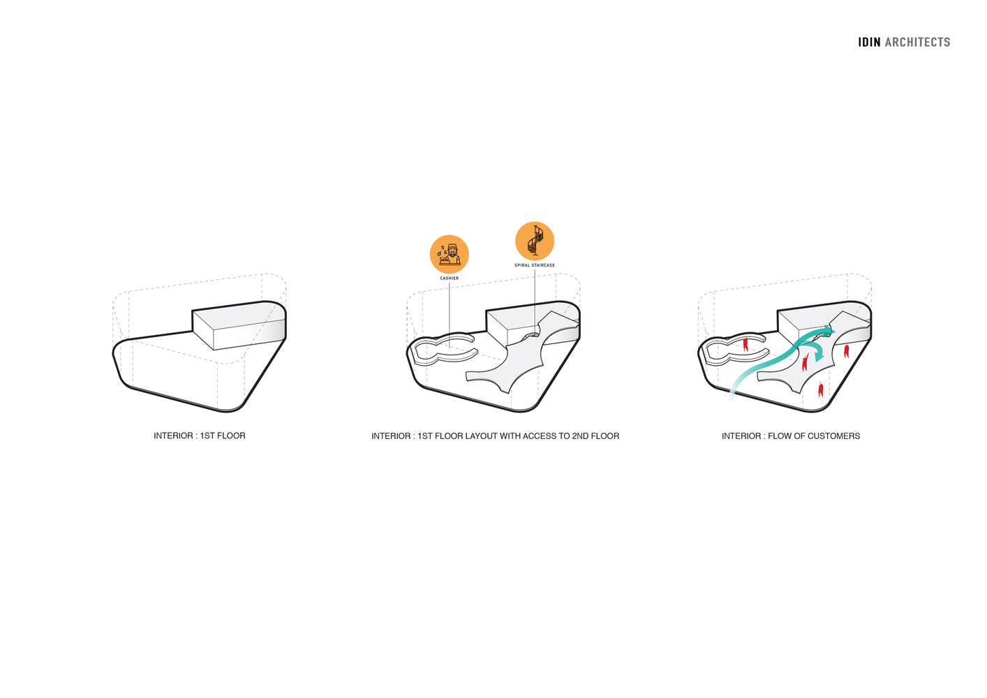 This project combines architecture and interior design into one; the exterior is designed to be enclosed to hide the interior and creates an element of surprise while controlling the amount of natural light that enters the interior spaces. The building is wrapped with stone veneer that is curved to create ridges that interact with the sunlight, forming shadow patterns on the facade. The exterior resembles a solid mass to encourage the visitors to be curious about the interior. The furniture is arranged according to the various "volumes" of the interior space, visitors can choose from private single seats to group seating, where all selected furniture feature rounded forms to reflect the organic shapes of the internal volumes and are controlled within the same scheme of gray, black, copper and timber tone for design continuity.