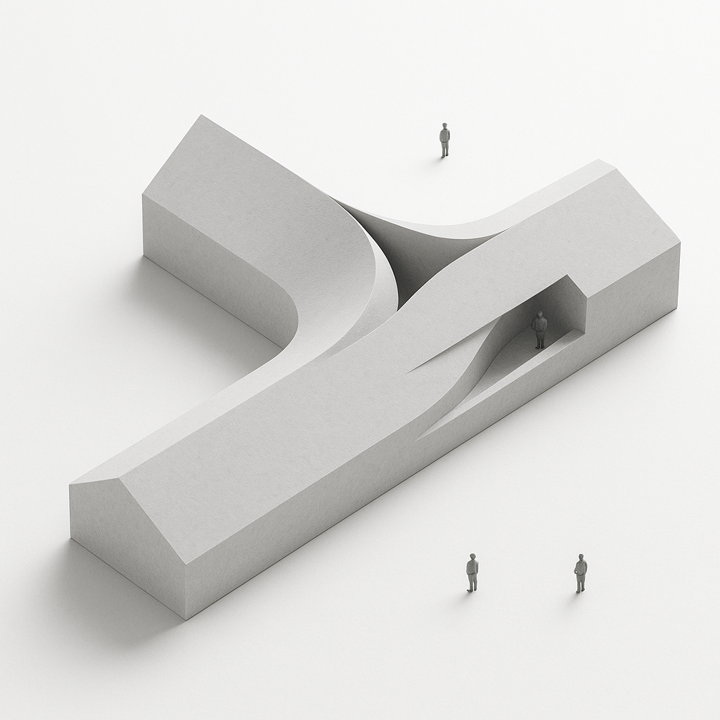 - 주요 키워드 (영어): architectural model, T-shaped, S-curve, minimalist, maquette, geometric, cut-away section, bird's eye view, scale figures, monochromatic, light gray, sculptural