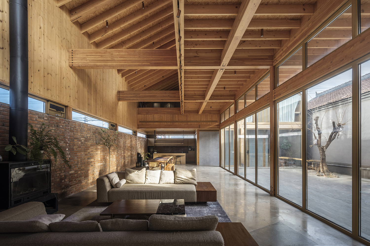 Local regulations imposed additional constraints: a maximum eave height of 7 meters, a ridge height limit of 8.6 meters, and a minimum 40cm setback from neighboring buildings. Within these limitations, the design had to maximize usable volume while creating vibrant interior spaces that capture the charm of rural life.