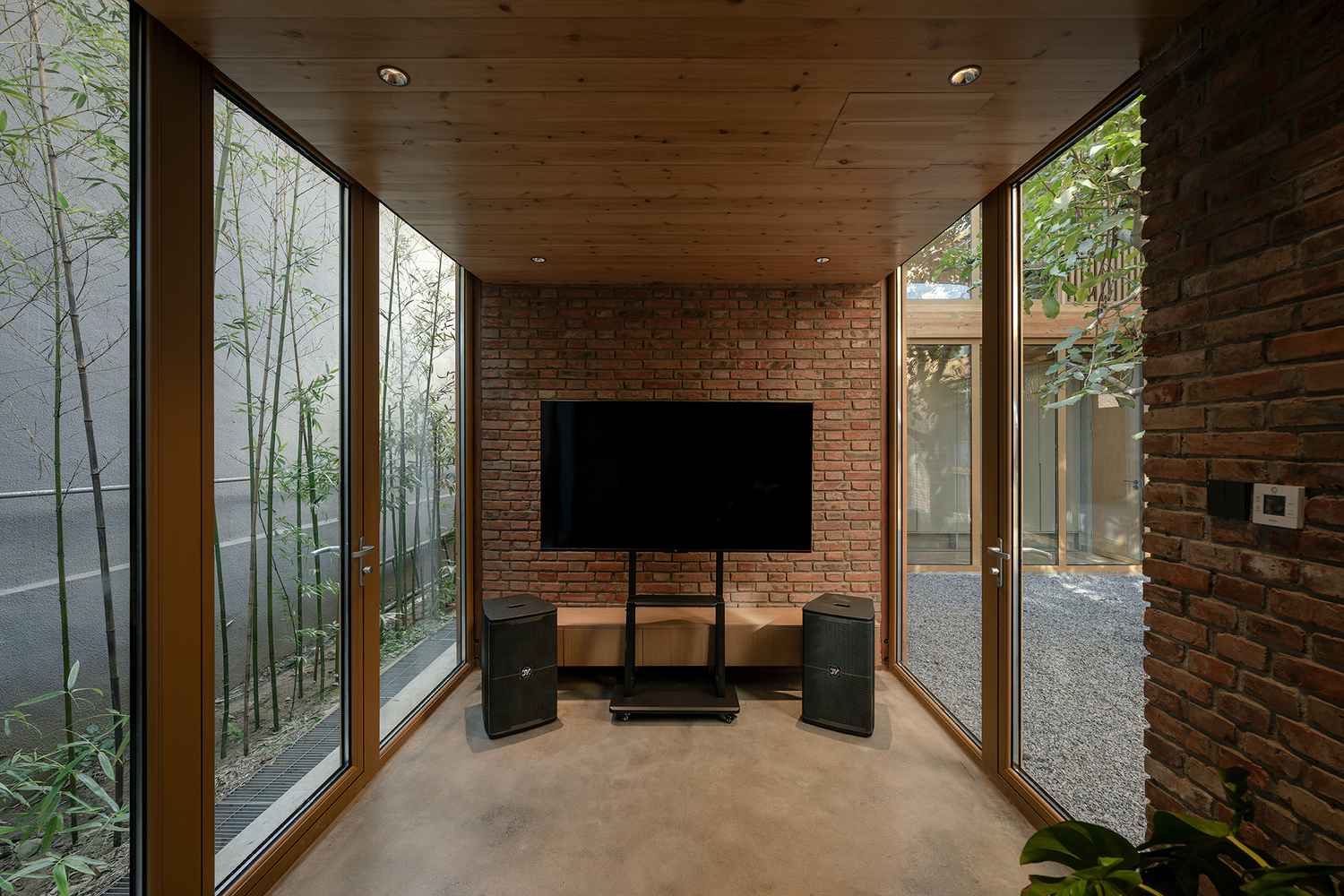 The ground floor is enclosed with solid walls along the street for privacy, while the interior fully opens to the courtyards. It accommodates communal spaces such as the living room, dining room, and kitchen, as well as the owner's bedroom bedroom. On the second floor, three staggered platforms appear to float above the brick walls, creating a visual interplay with the surrounding trees. This level houses six guestrooms of varied styles, including standard rooms, tatami-style single rooms, and loft style family suites. The building features two rooftop terraces, offering panoramic views of the surrounding mountains.