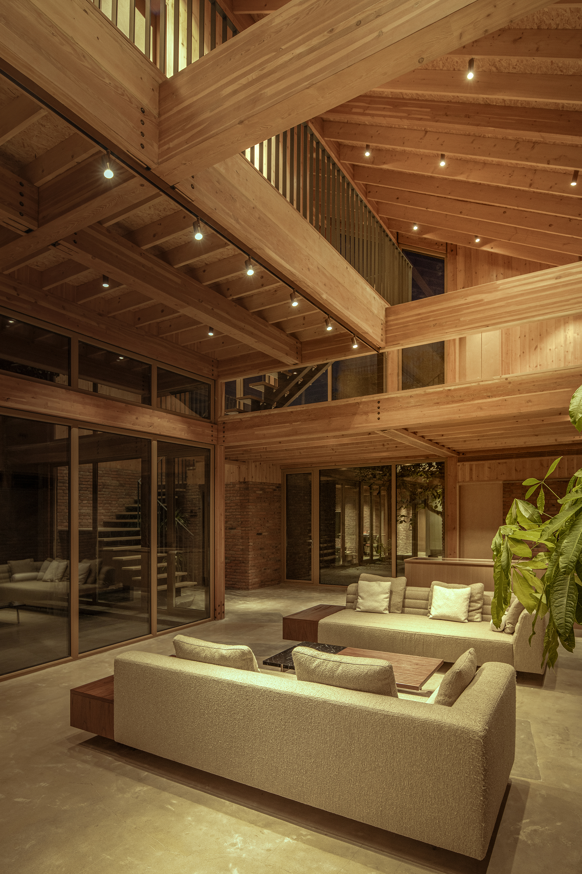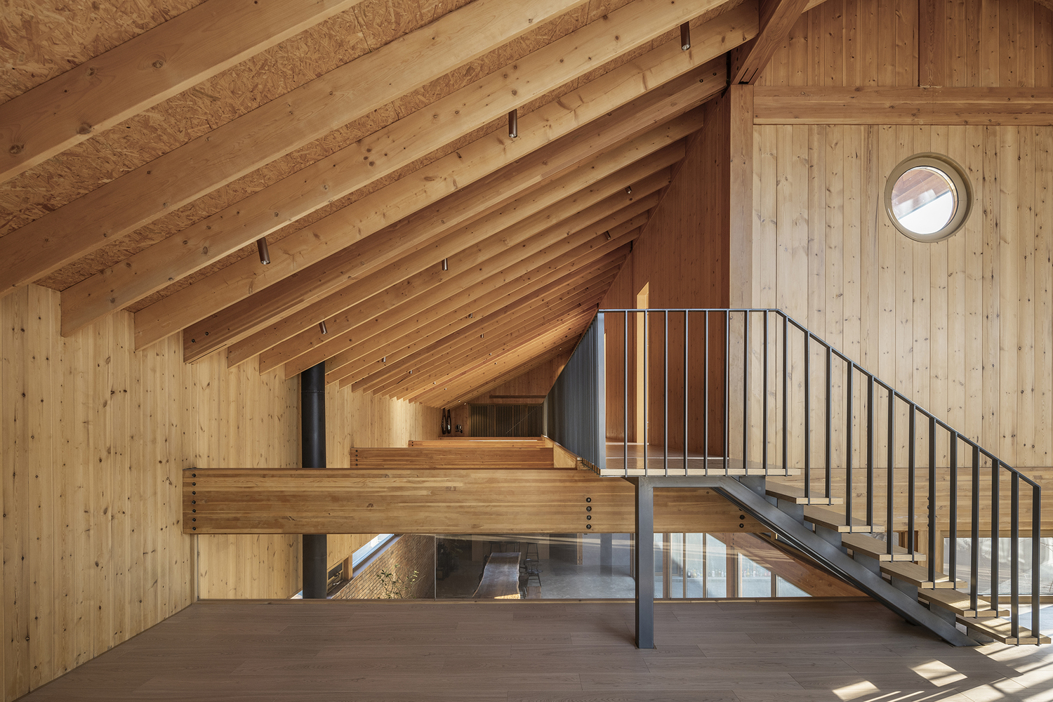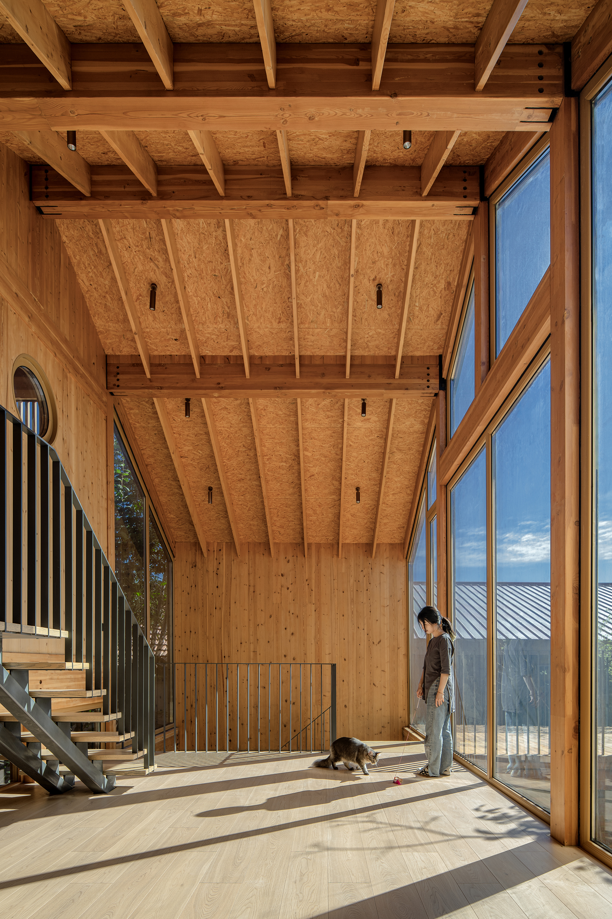건물은 기존 나무들을 중심으로 공간이 구성되어, 두 개의 균형 잡힌 중정을 형성합니다. 이 중정들은 풍부한 자연광을 실내로 끌어들이고, 계절의 변화를 일상에서 느낄 수 있게 합니다. 이러한 배치는 마을의 전통적인 중정 가옥 양식을 현대적으로 재해석한 것입니다. 건물의 주요 구조는 접착 집성목으로 만들어졌으며, 경사진 지붕 아래에는 다양한 높이의 플랫폼 공간이 마련되어 마치 숲속에서 생활하는 듯한 독특한 경험을 선사합니다.