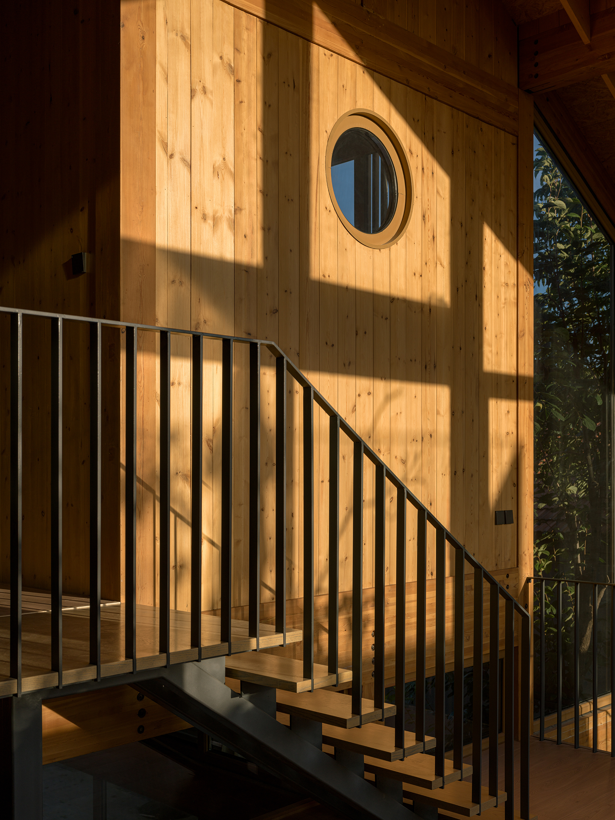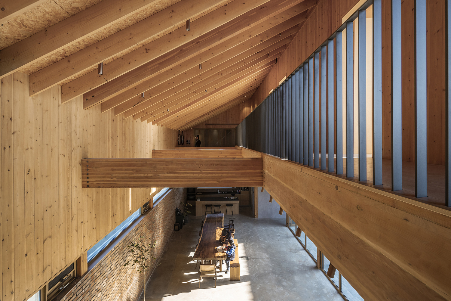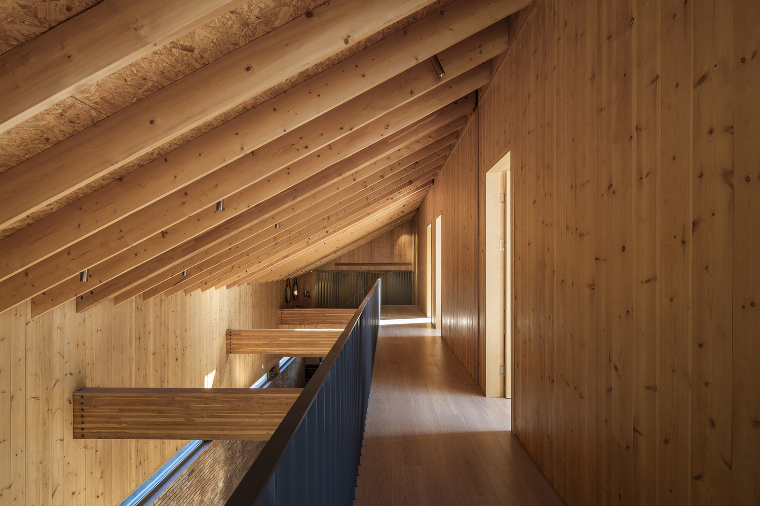 건물은 기존 나무들을 중심으로 공간이 구성되어, 두 개의 균형 잡힌 중정을 형성합니다. 이 중정들은 풍부한 자연광을 실내로 끌어들이고, 계절의 변화를 일상에서 느낄 수 있게 합니다. 이러한 배치는 마을의 전통적인 중정 가옥 양식을 현대적으로 재해석한 것입니다. 건물의 주요 구조는 접착 집성목으로 만들어졌으며, 경사진 지붕 아래에는 다양한 높이의 플랫폼 공간이 마련되어 마치 숲속에서 생활하는 듯한 독특한 경험을 선사합니다.