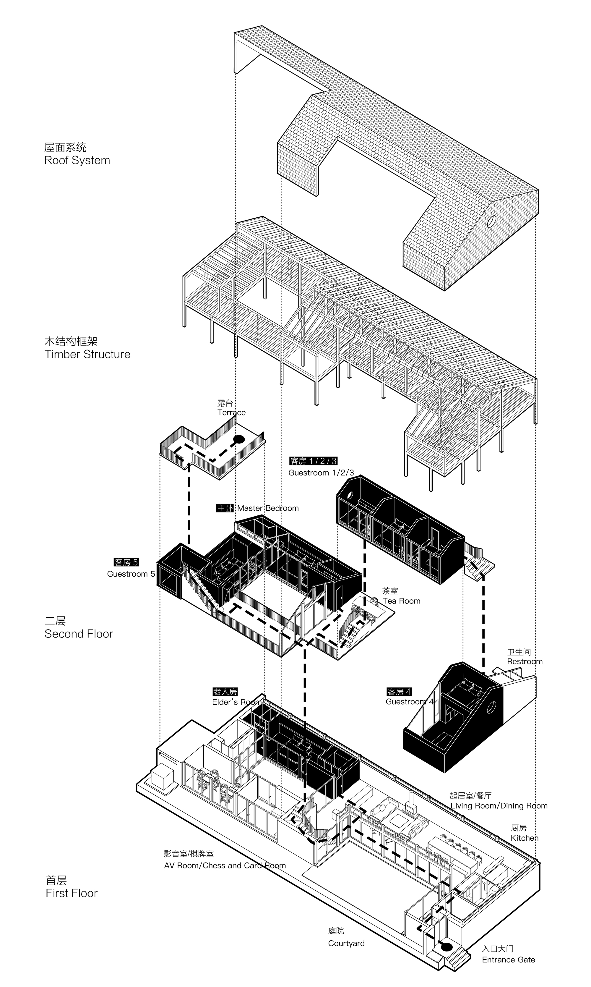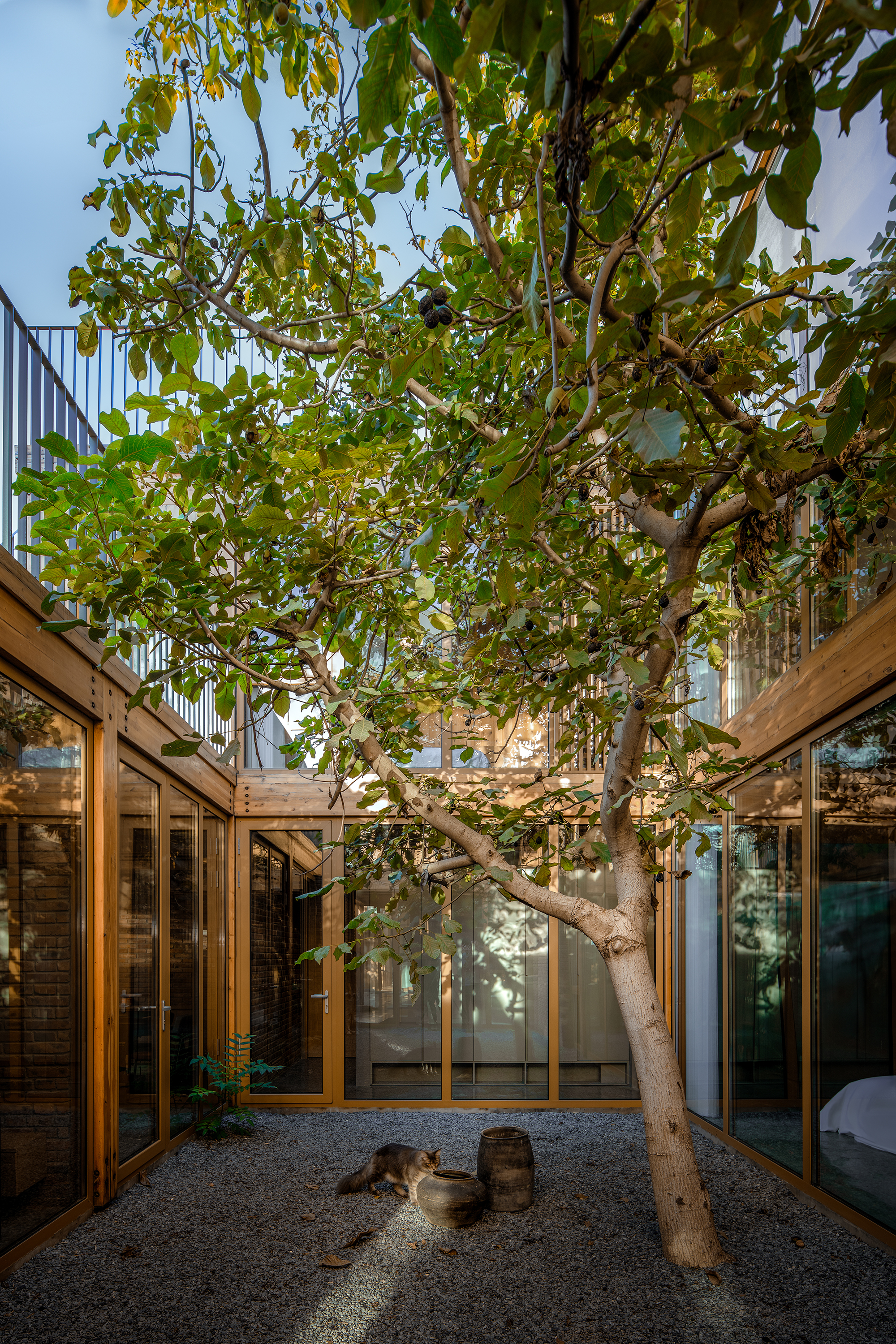 Conceptualization and Formation. The three trees within the site inspired the architectural design, and also the project name, "Lei Homestay." The term "Lei (耒) originates from an ancient agricultural tool, representing rural agrarian life. Its written form is composed of three "wood" (木) strokes, evoking the image of trees and informing the architectural concept of an interwoven wooden framework. The building is organized around the trees, forming two well-proportioned courtyards that bring in ample sunlight and views of seasonal changes. This layout continues the traditional courtyard house typology of the village. The main structure is crafted from glued laminated timber, which, beneath the double-pitched roof, supports a variety of staggered platform spaces, evoking the sensation of living amidst a forest.