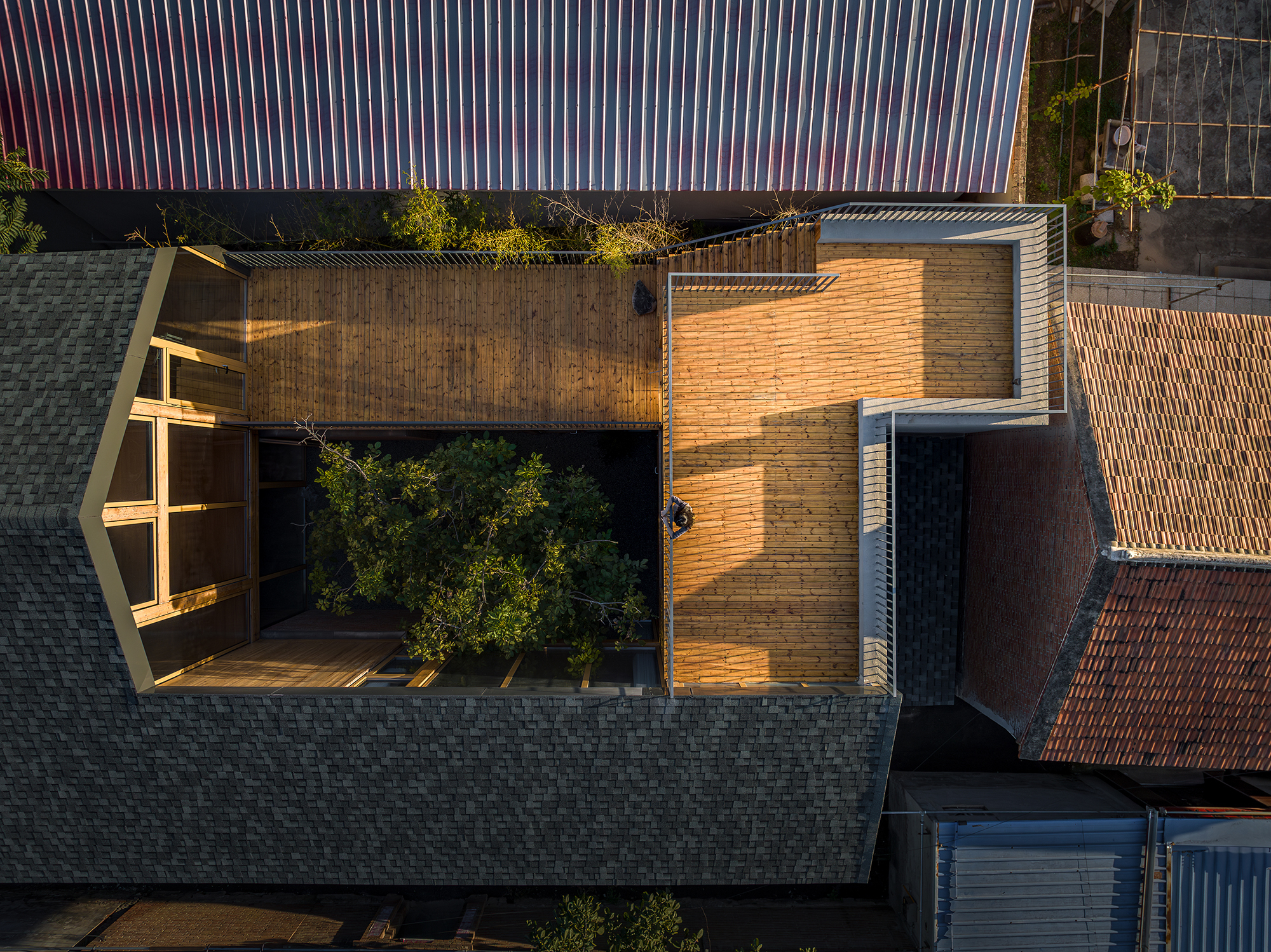 마을 주요 도로의 동쪽에 접한 약 400제곱미터의 대지는 동서로 긴 직사각형 형태를 띠고 있습니다. 이전 부지에는 경사 지붕과 평지붕을 가진 벽돌 콘크리트 구조물과 임시 강판 지붕 건물들이 무질서하게 혼재해 있었고, 보존 가치가 있는 건축물은 없었습니다. 그러나 집주인의 아버지가 어린 시절에 심은 두 그루의 감나무와 한 그루의 호두나무는 여전히 건강하게 자라며 풍성한 열매를 맺고 있었습니다. 세월이 흘러 이 나무들은 단순한 식물을 넘어 가족의 소중한 기억이 되었고, 설계자와 집주인은 깊은 논의 끝에 이 세 그루의 나무를 모두 보존하기로 결정했습니다.