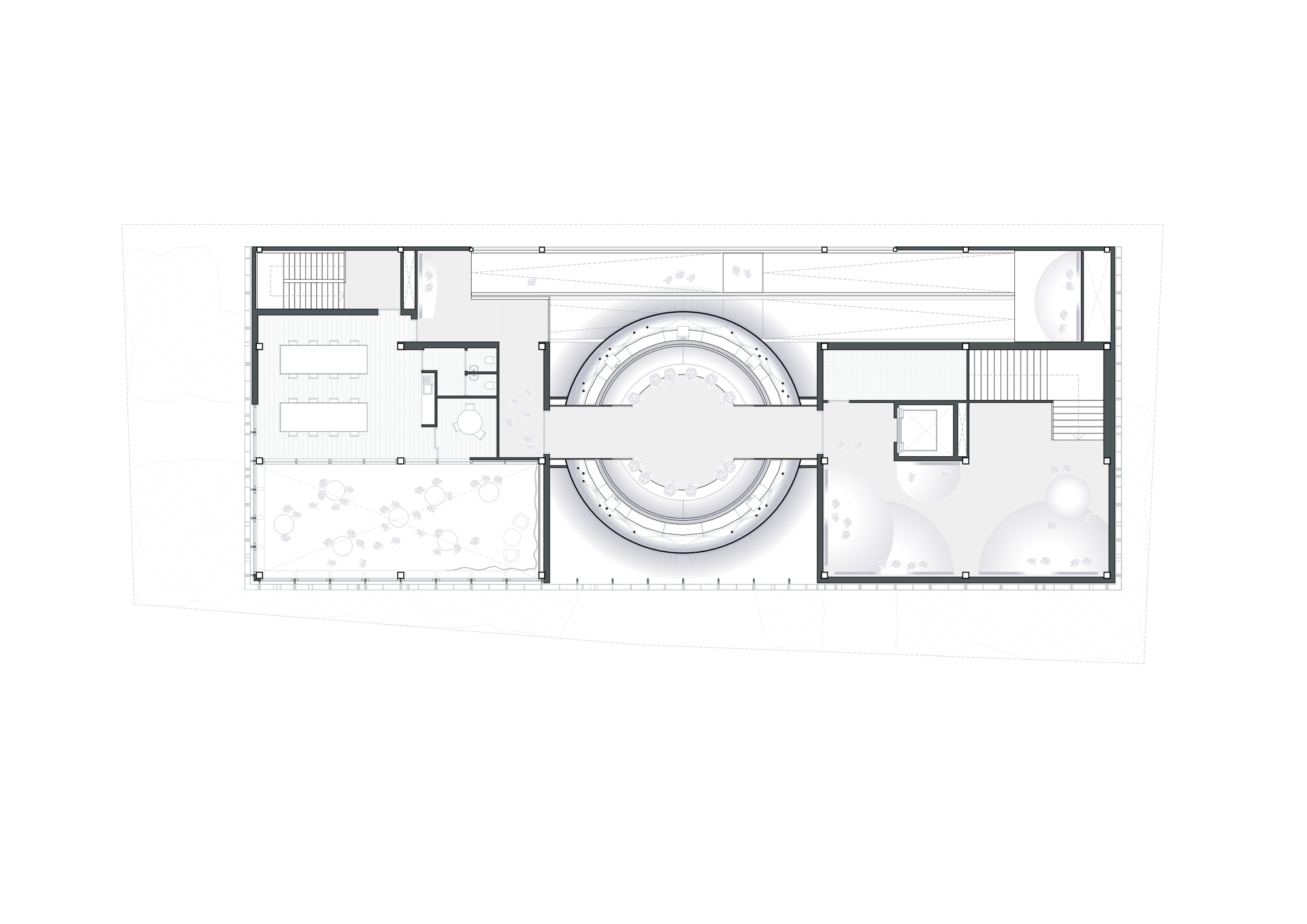 외부 공간은 간결함과 자연성이 돋보인다. 건물 주변에 심어진 초목과 나무들은 인공 구조물과 자연의 대비를 완화하며, 건축이 환경과 조화를 이루는 방식을 보여준다. 목재 벤치는 방문객에게 잠시 쉬어갈 수 있는 공간을 제공하며, 파빌리온을 다양한 각도에서 감상할 기회를 준다.