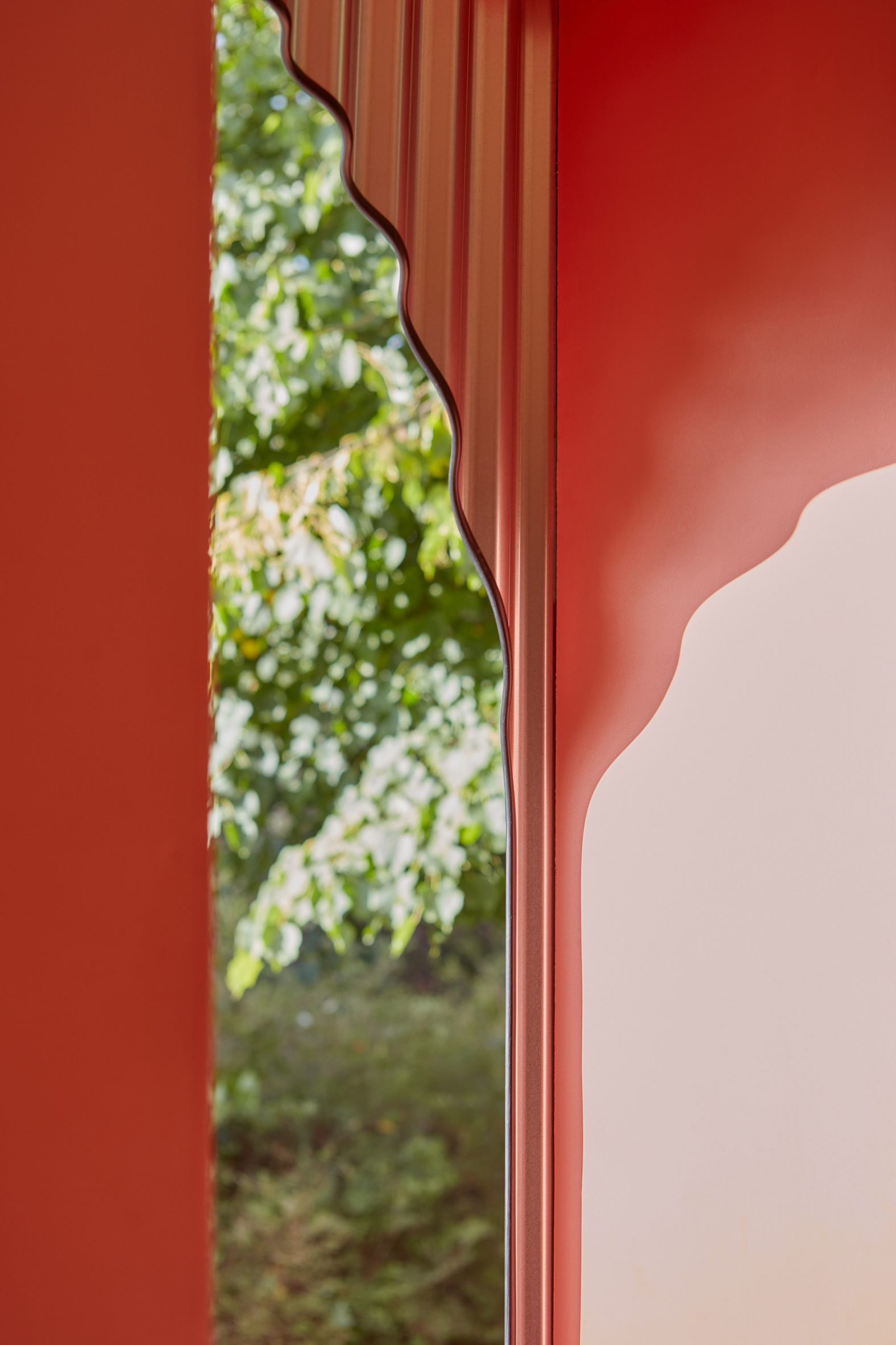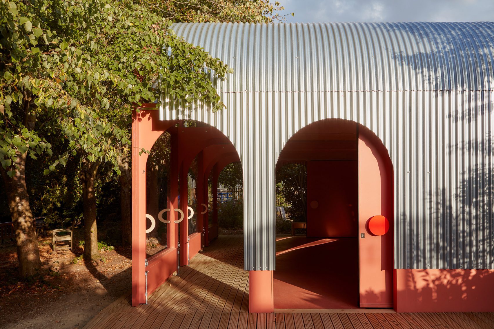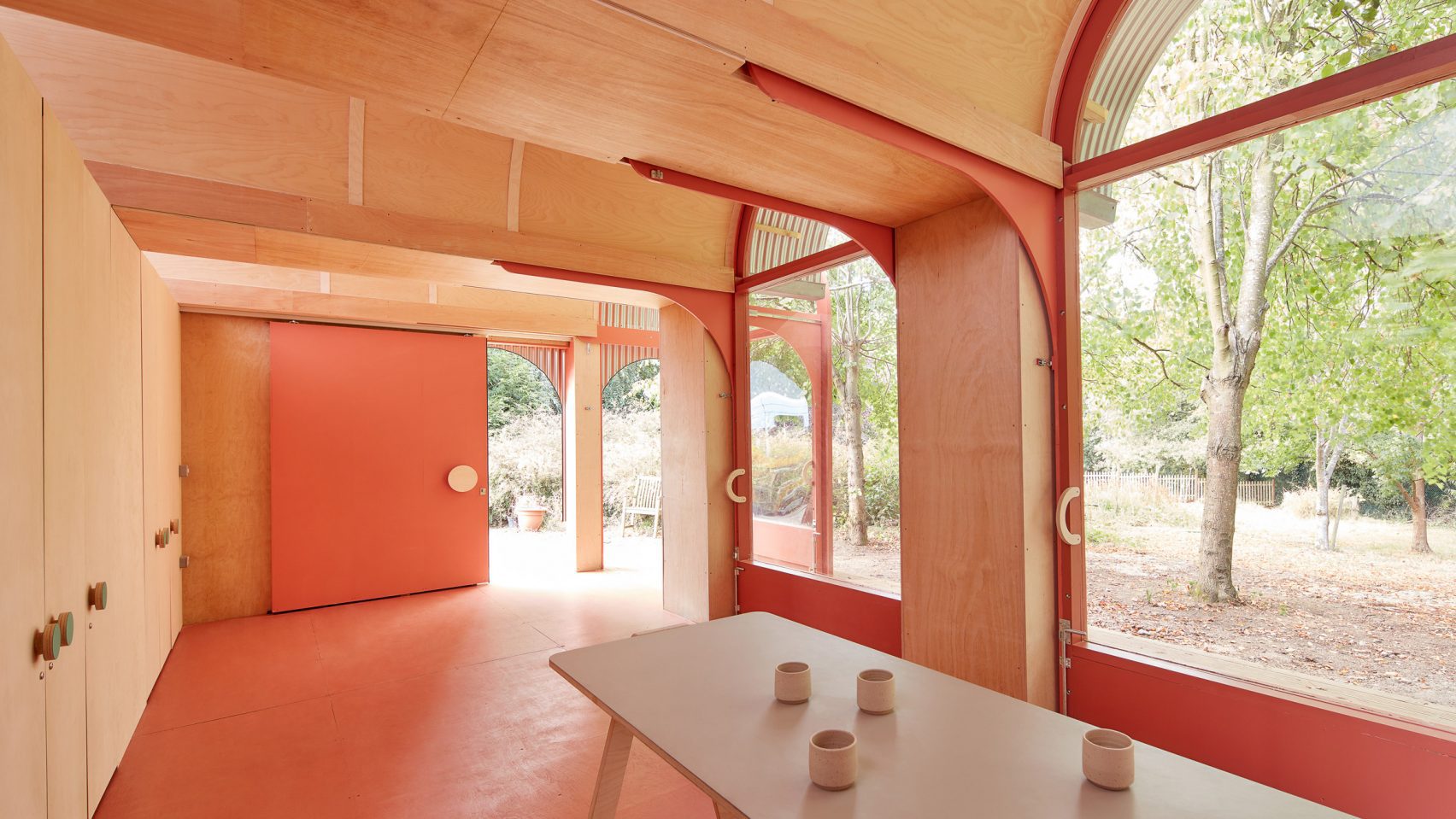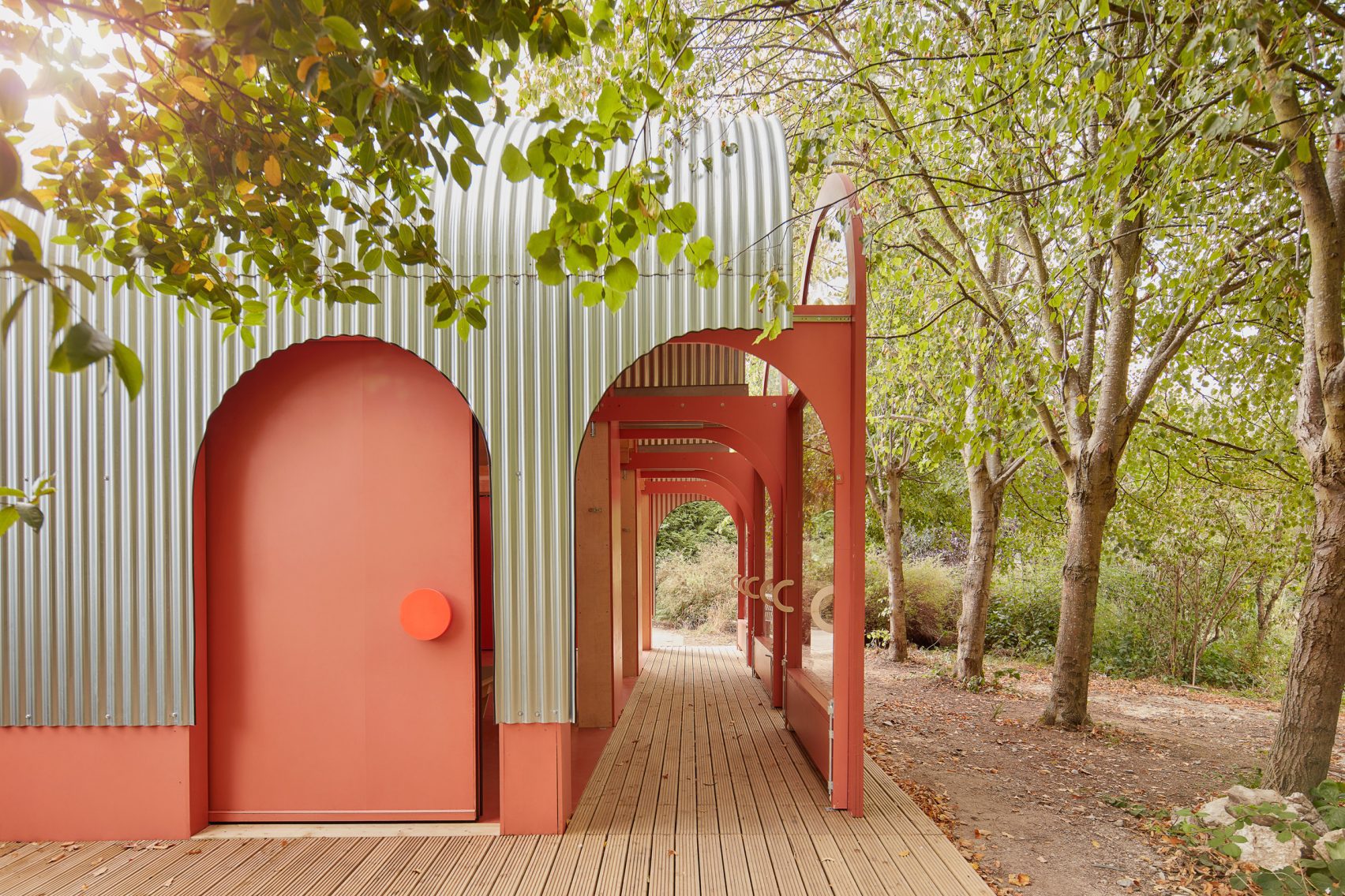 When closed, the building is instead entered via arched sliding doors. These are located on the side walls, featuring colourful circular handles that match those found on cupboards inside.