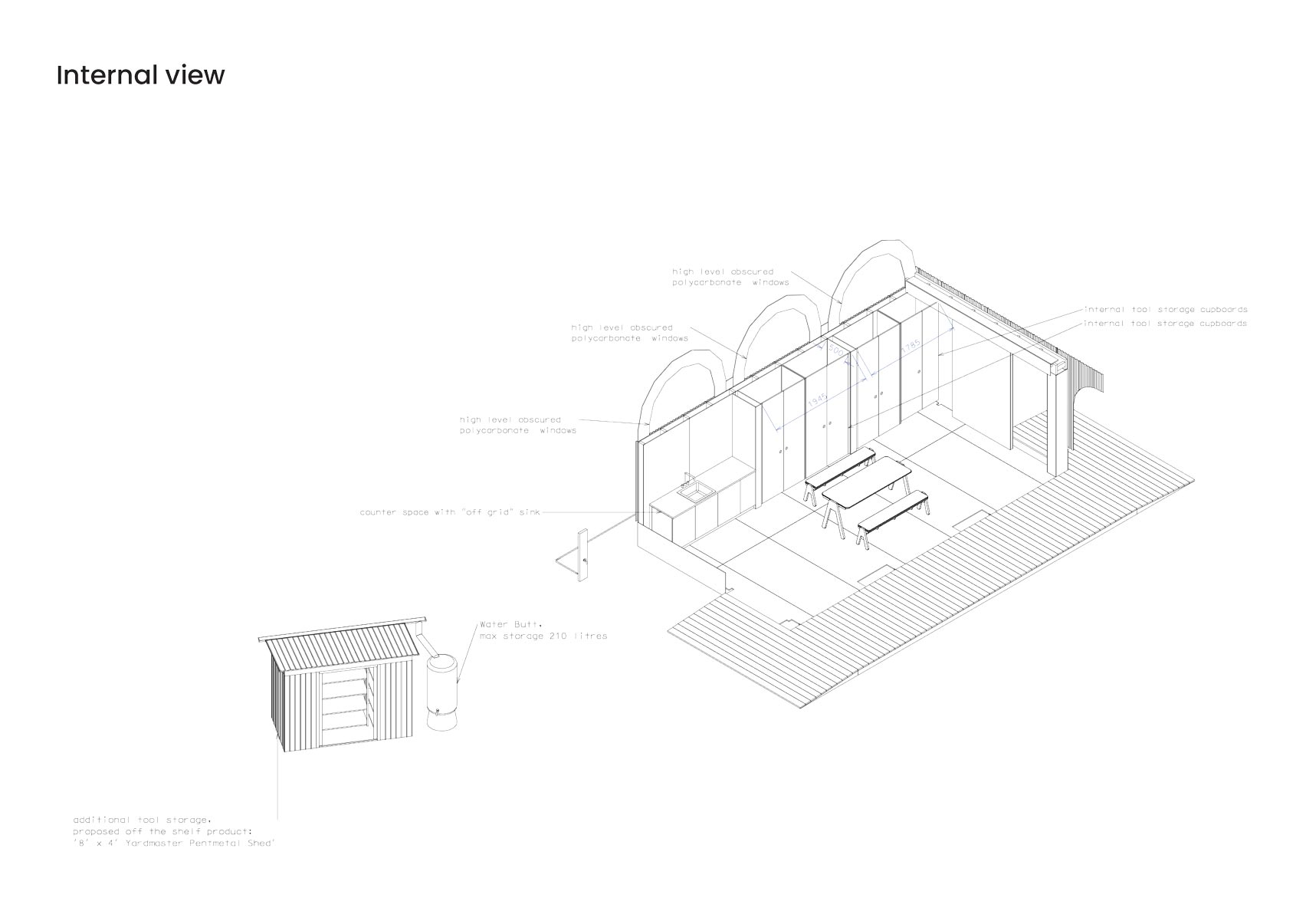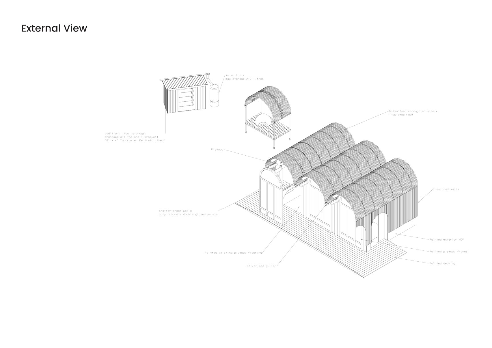 BAT 스튜디오는 이 유연한 구조물을 엔필드 체이스 팜 병원의 커뮤니티 정원에 창고, 워크숍, 이벤트 공간으로 활용하기 위해 직접 설계하고 건축했습니다. 이는 50년 이상 병원의 일부로 존재해온 치유의 정원에 새로운 생명력을 불어넣는 프로젝트입니다.