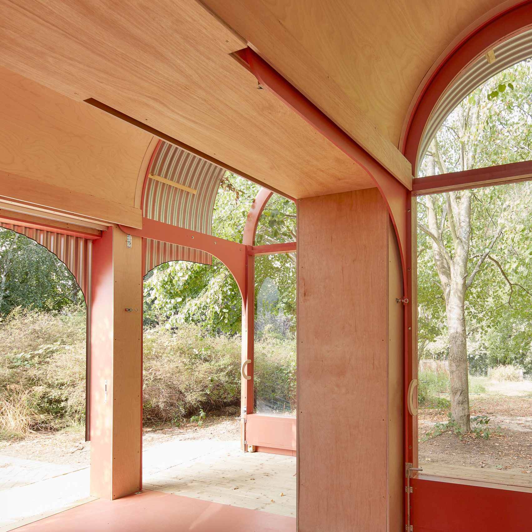 The barrel-vaulted roof came from the use of corrugated steel roofing arcs, typically used for pig pens. Inside, plywood panels wrap the curved ceilings and provide built-in wall storage.