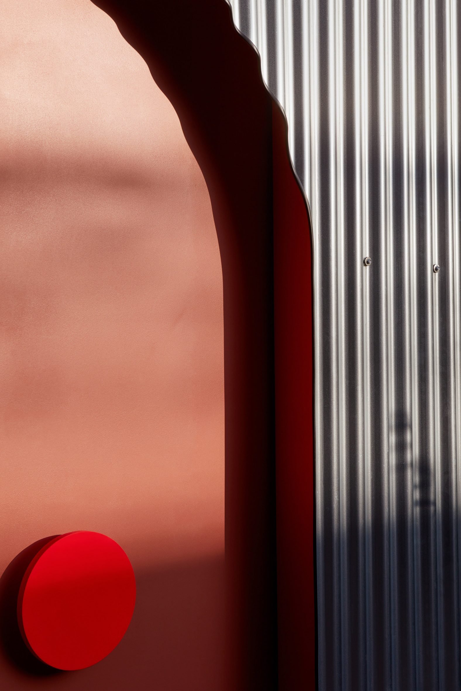 폐쇄 시에는 측면 벽에 위치한 아치형 슬라이딩 도어를 통해 건물에 진입합니다. 이 도어들에는 내부 수납장과 동일한 원형 손잡이가 달려 있어 디자인적 일관성을 유지합니다.