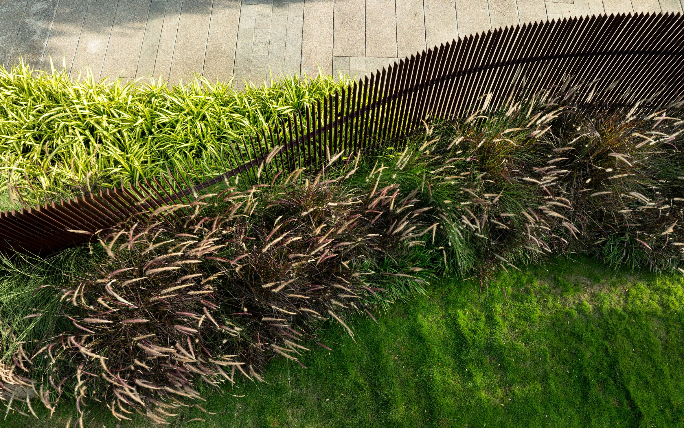 건물의 저층부를 감싸는 석재 벽체는 현대적인 해석을 통해 전통 건축 요소로 재탄생했으며, 잔디와 관목이 어우러져 부드러운 완충 지대를 형성한다. 특히 담쟁이덩굴과 같은 텍스처를 가진 식물들이 석재의 육중함을 상쇄하는 역할을 한다.