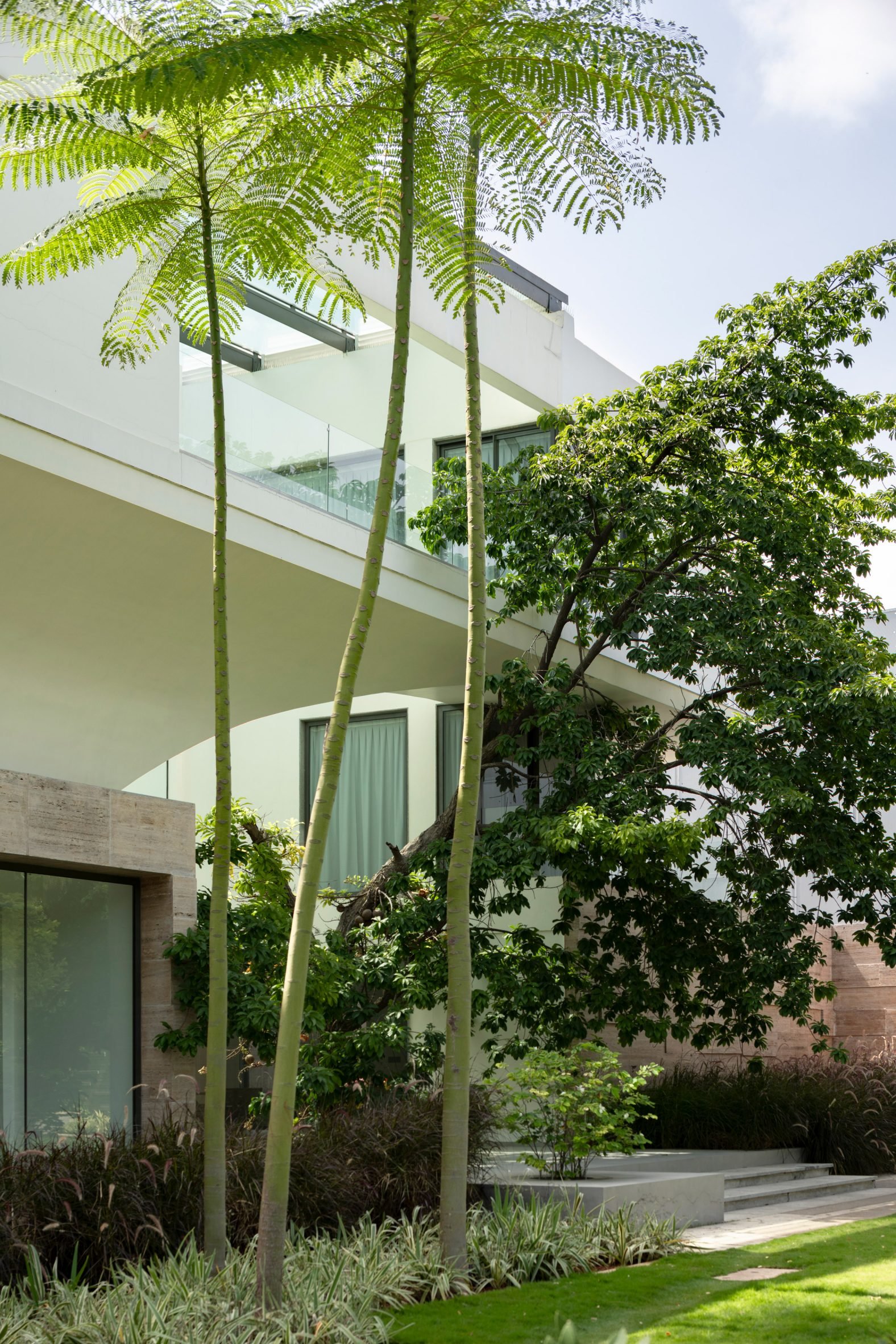 흰 벽면에 드리워지는 나뭇잎의 그림자, 오후의 석양이 비치는 석재 벽의 따스한 색감, 수영장 물빛이 실내로 반사되는 순간들이 모여 살아있는 집을 완성한다. 이는 인도 전통 건축에서 중요시되던 '빛의 건축'을 현대적으로 재해석한 결과물이다.