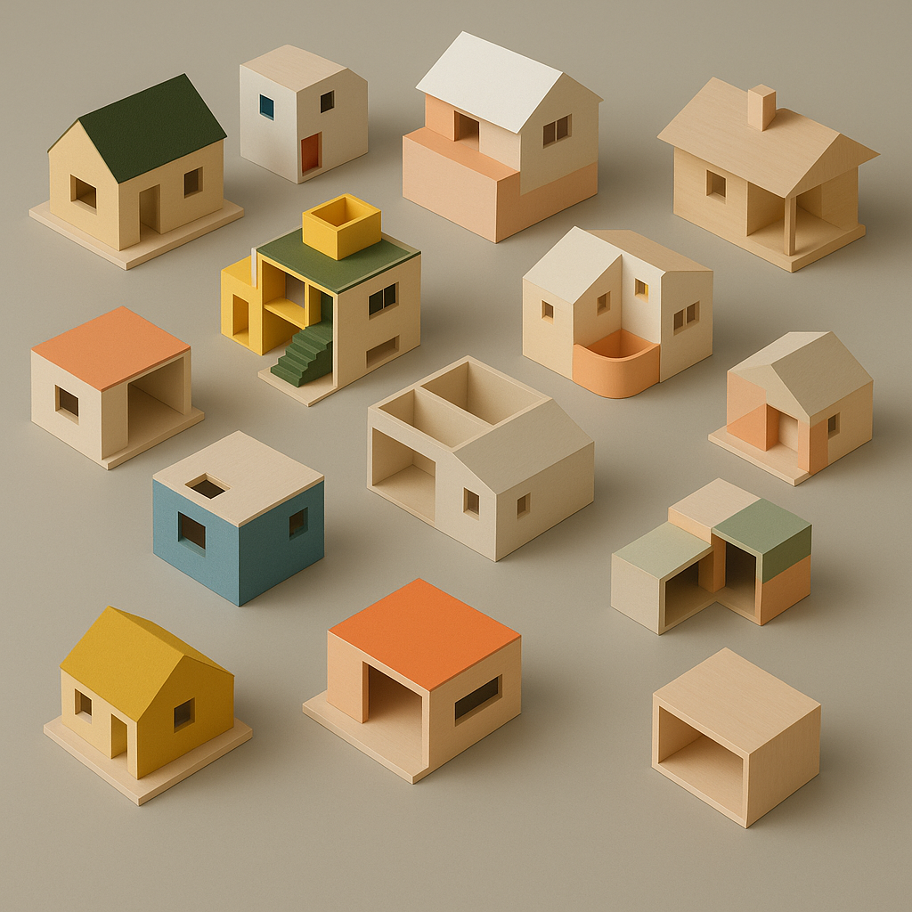 - 주요 키워드 (영어): architectural models, miniature houses, color blocking, pastel palette, isometric view, modernist design, residential typology, geometric forms, wood craftsmanship, studio photography