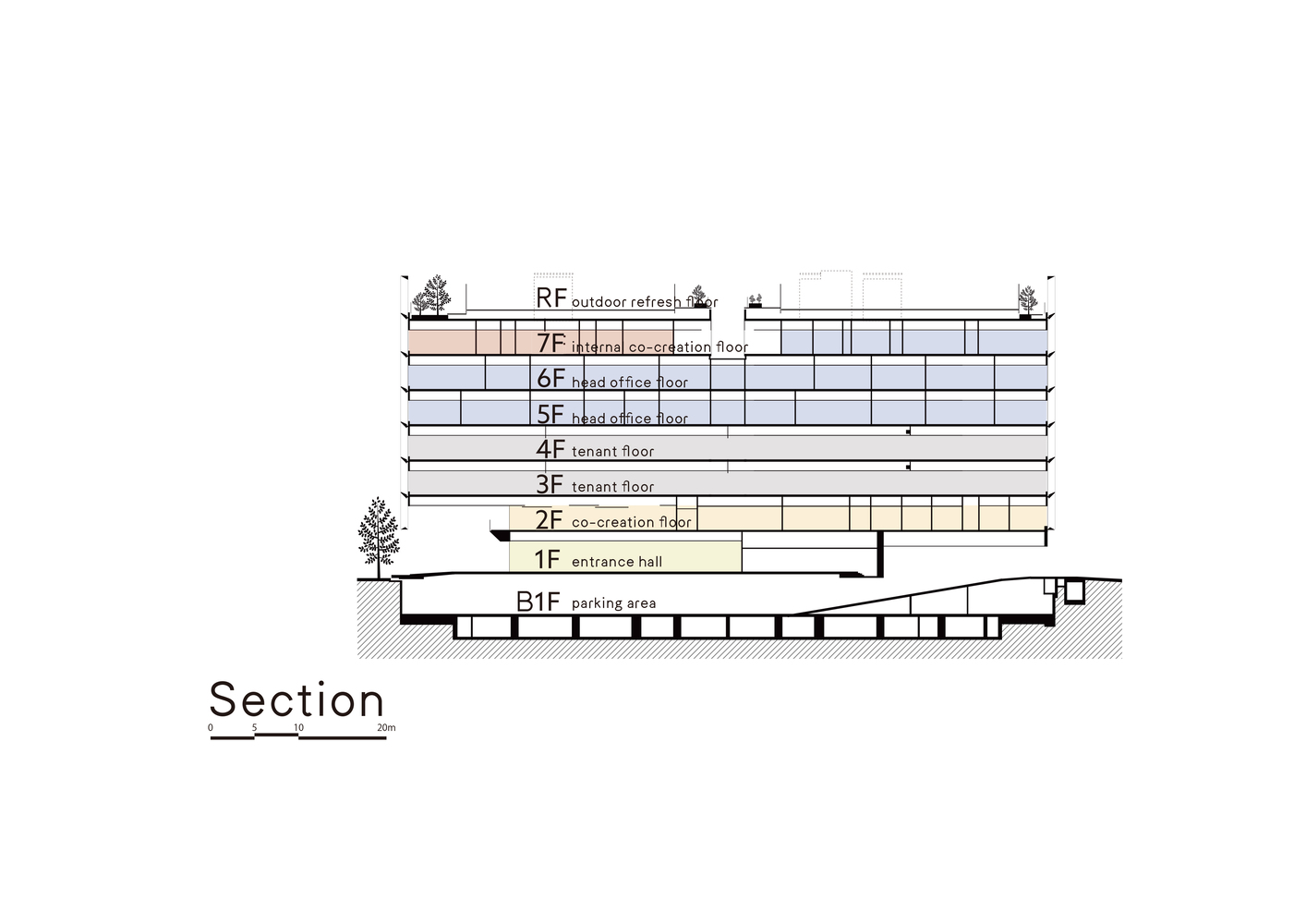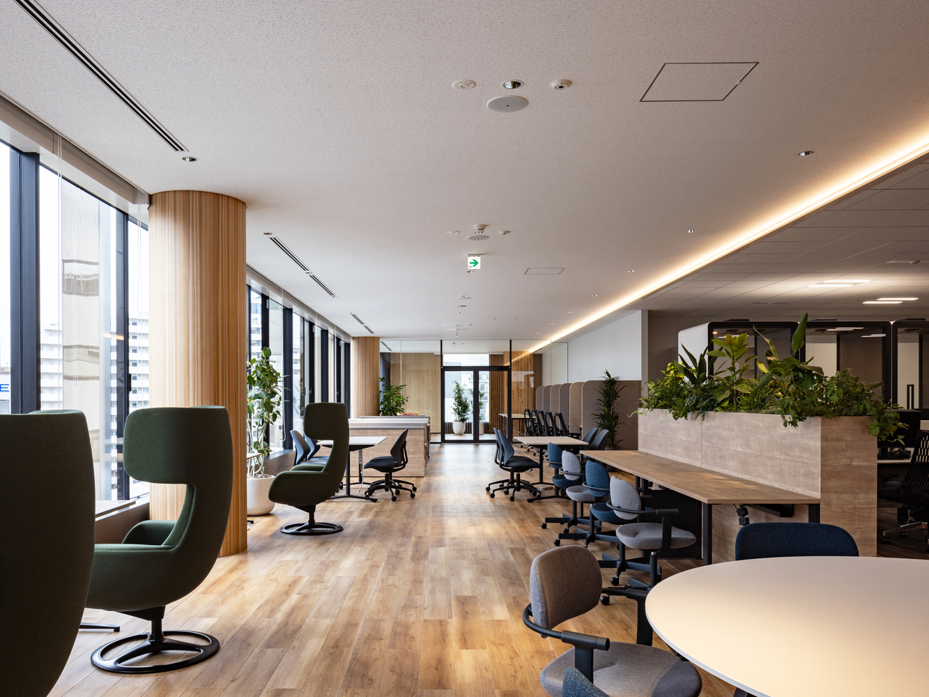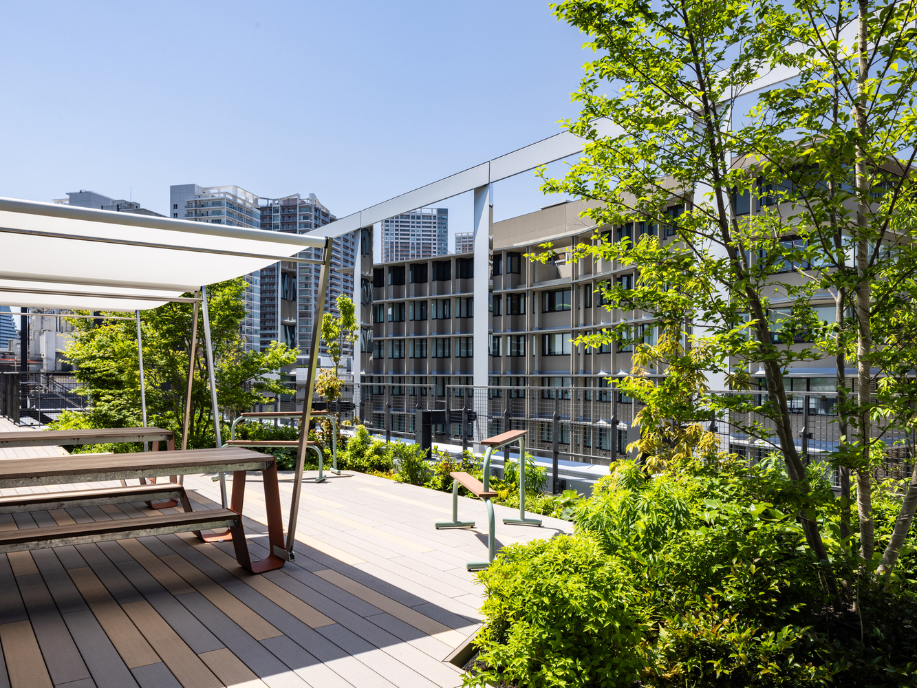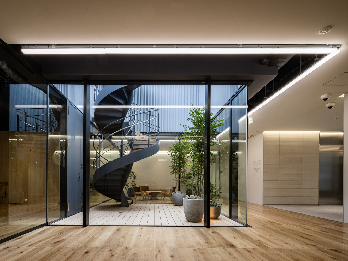 Natural winds, sunlight, and lighting create uneven shades of light and shadow like a forest in the workspaces. The workers can feel nature anytime and anywhere. Additionally, the 7th floor and the rooftop floor were designed as the "wellness" area. The contraptions to enjoy health promotion with the bright sunlight and wind were installed, such as the herb and fruit garden, the fitness for easy stretching, the shrine, and the 100-meter walking course.