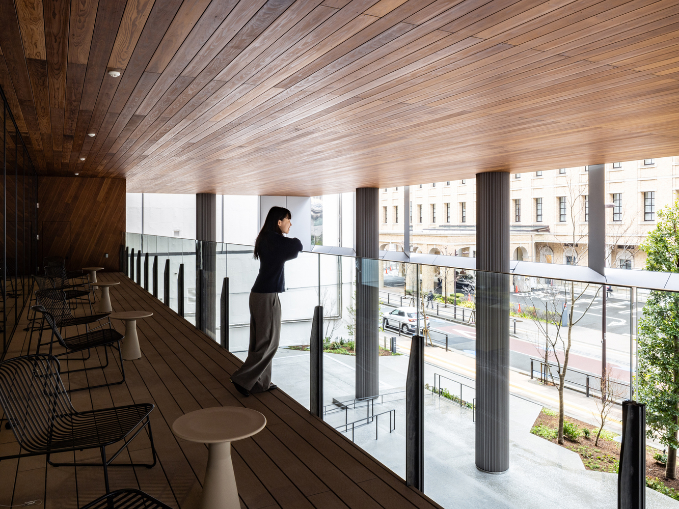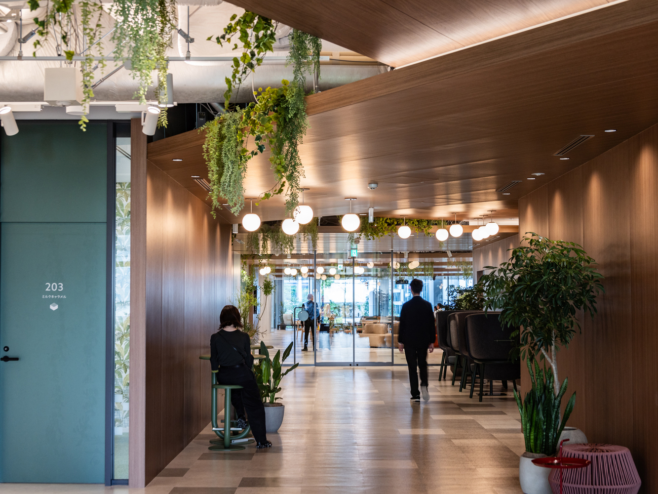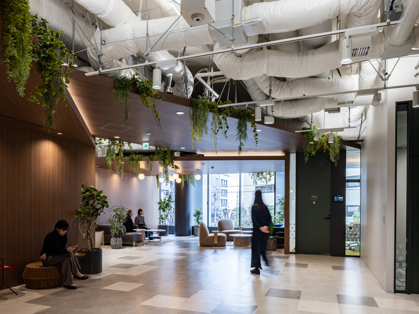 Natural winds, sunlight, and lighting create uneven shades of light and shadow like a forest in the workspaces. The workers can feel nature anytime and anywhere. Additionally, the 7th floor and the rooftop floor were designed as the "wellness" area. The contraptions to enjoy health promotion with the bright sunlight and wind were installed, such as the herb and fruit garden, the fitness for easy stretching, the shrine, and the 100-meter walking course.