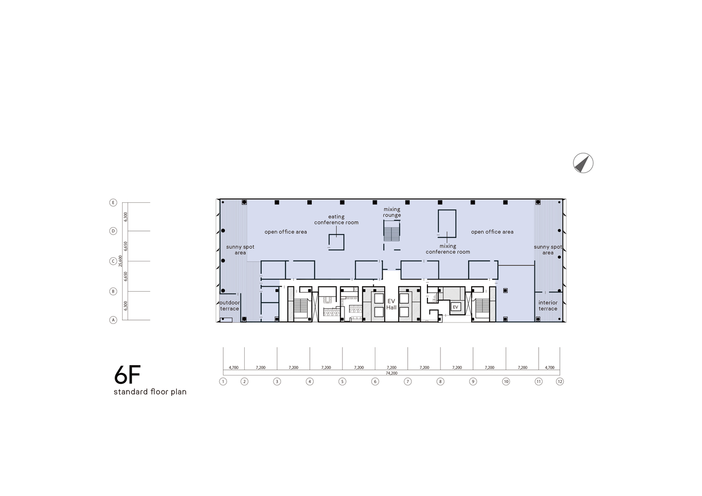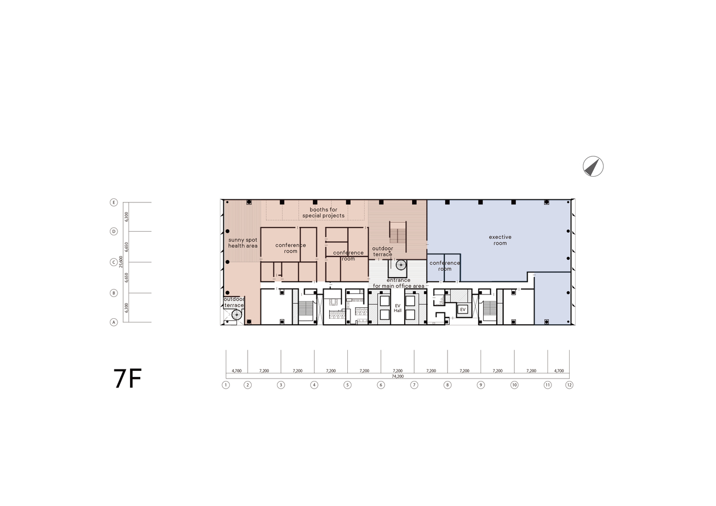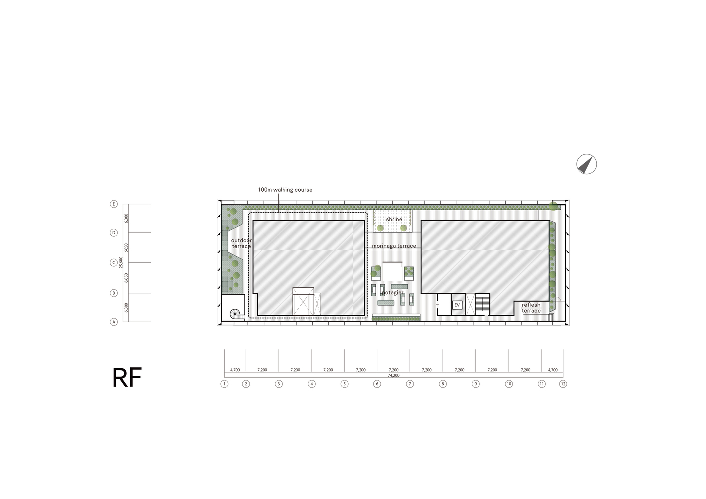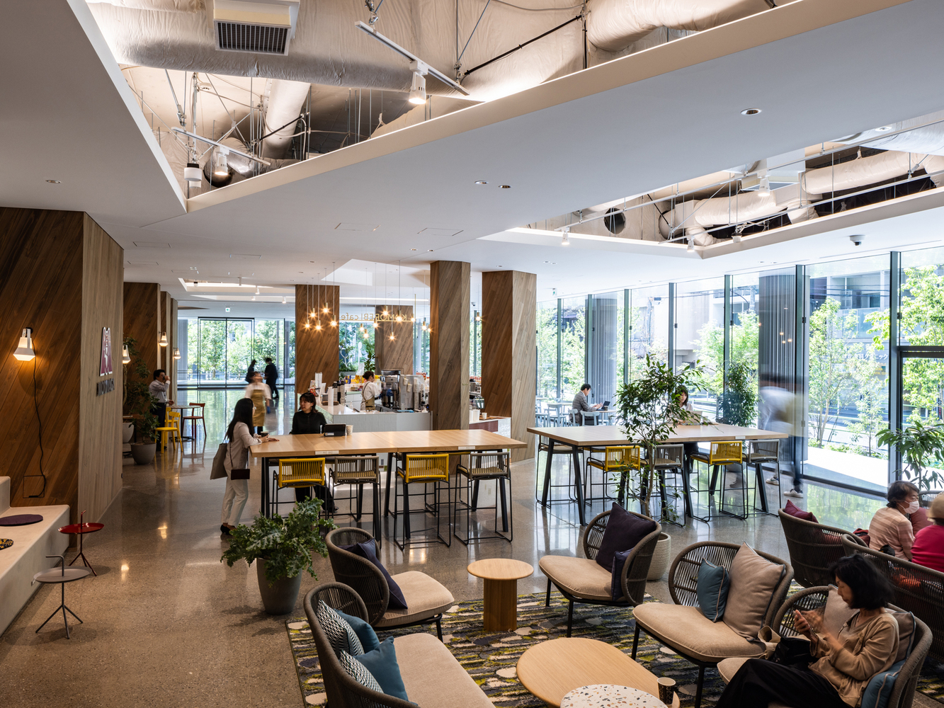Natural winds, sunlight, and lighting create uneven shades of light and shadow like a forest in the workspaces. The workers can feel nature anytime and anywhere. Additionally, the 7th floor and the rooftop floor were designed as the "wellness" area. The contraptions to enjoy health promotion with the bright sunlight and wind were installed, such as the herb and fruit garden, the fitness for easy stretching, the shrine, and the 100-meter walking course.