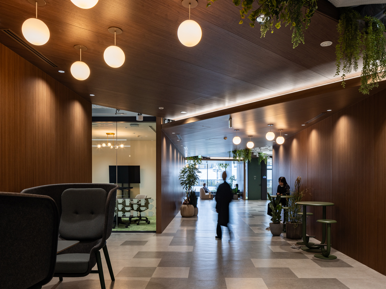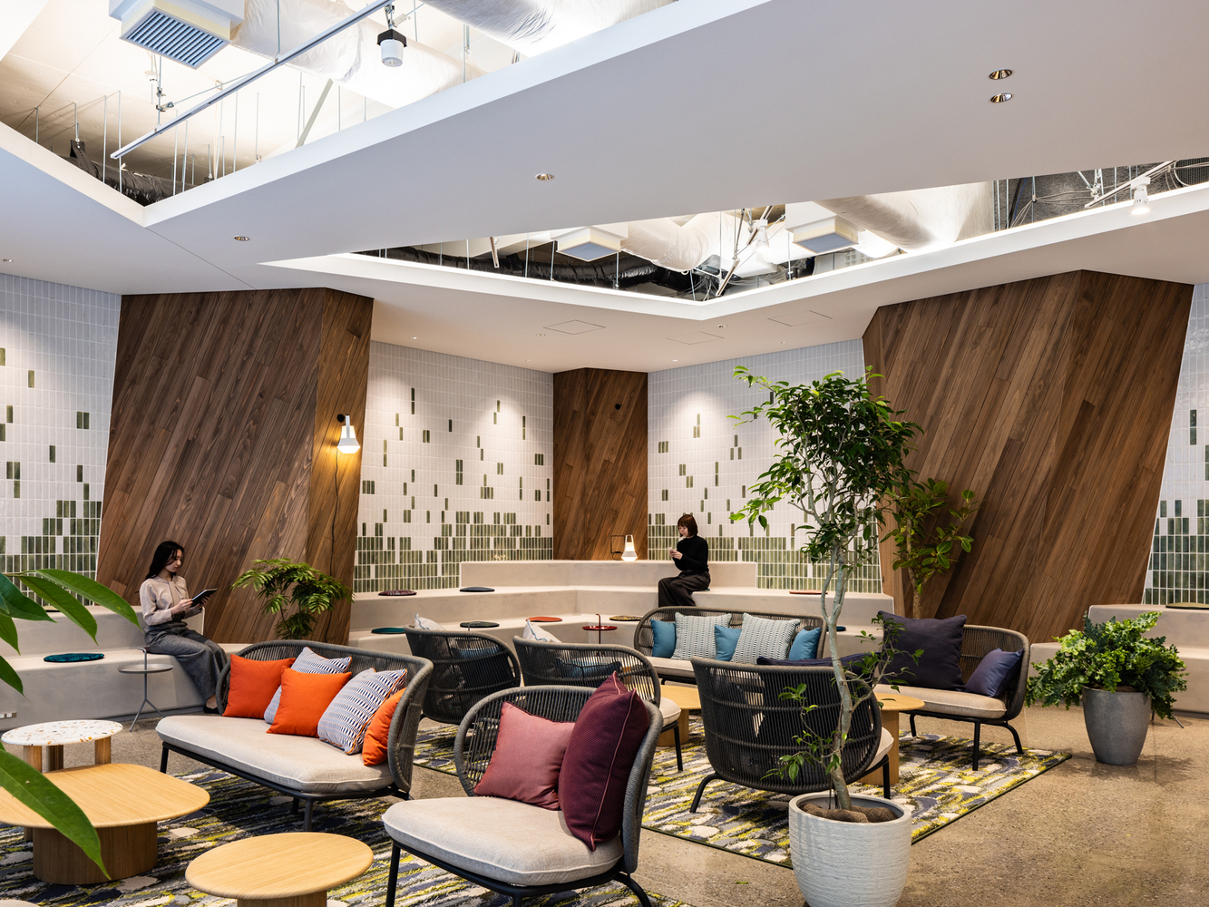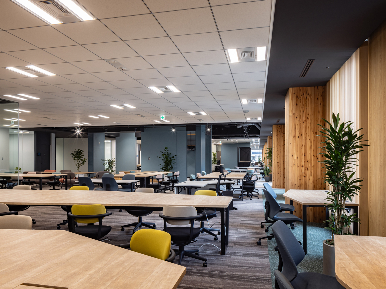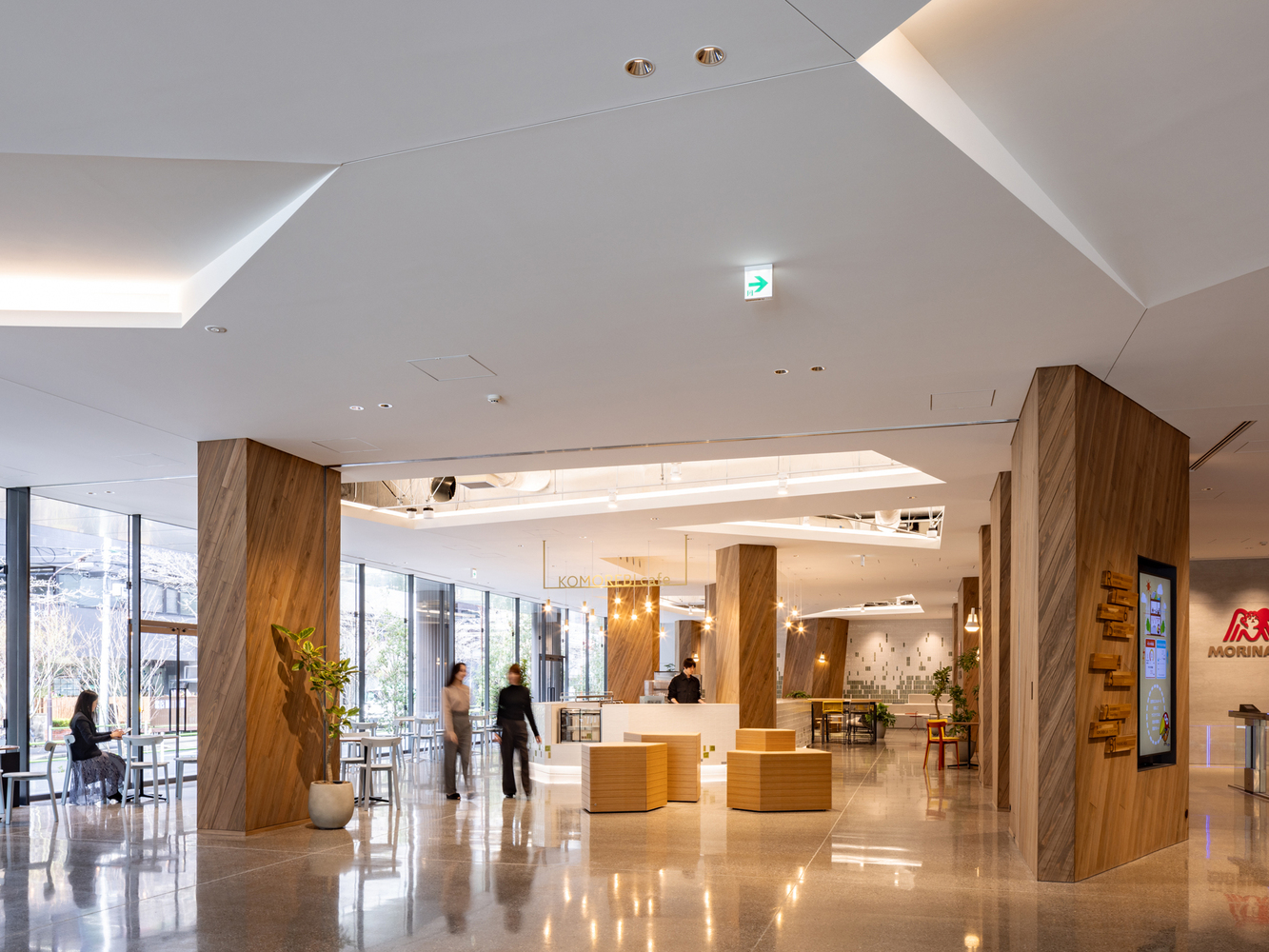 다케나카 코퍼레이션이 설계한 이 프로젝트는 과자 및 식품 제조기업의 사무실로 탄생했다. 클라이언트의 비전은 고객, 직원, 그리고 사회 전체에 마음과 몸, 환경의 웰니스를 제공함으로써 지속가능한 세계 실현에 기여하는 것이었다. 이러한 관점을 구현하는 기반으로서, 우리는 다양한 생물이 공존하는 도시 속 숲이라는 개념으로 새 사무실을 디자인하고 이를 '교반의 숲(KAKUHAN-no-Mori)'이라 이름 붙였다. 교반은 재료를 섞는다는 의미로, 마치 과자 재료를 섞어 함께 즐기듯, 다양한 자연과 회사 안팎의 사람들이 서로 영향을 주고받으며 세계를 확장해나가는 이상적인 공간을 창조하고자 했다.