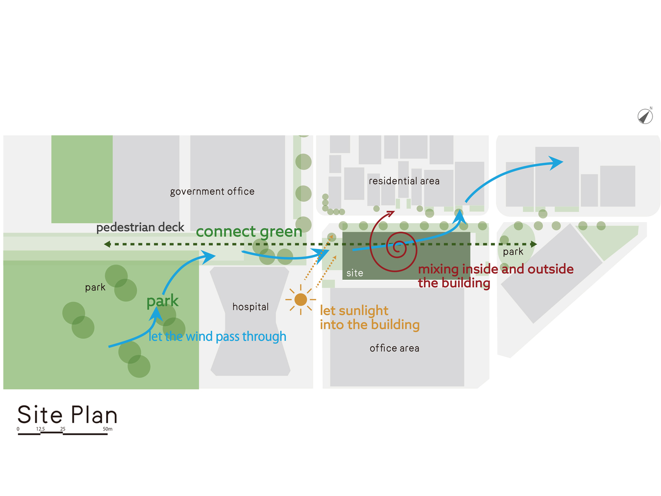 환경 공생형 사무실을 만들기 위해 숲을 참조한 이유는 숲이 공존과 포용의 상징이기 때문이다. 우선, 우리는 조경을 숲처럼 디자인했다. 대도시 도쿄는 자연이 부족하지만, 그 한정된 자연조차도 철새들에게는 매우 중요한 기반이 된다. 우리는 부지의 식생 상태와 철새의 생태를 분석하고, 철새들이 선호하는 나무를 심어 도시의 녹지 범위를 확장했다.