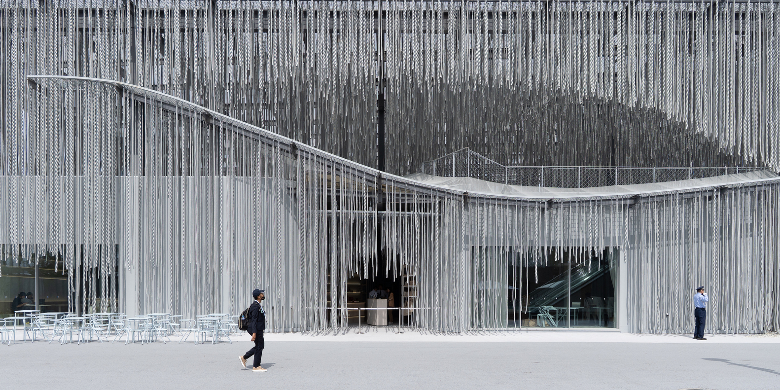 We aimed to create a pavilion that reflects this connection, where visitors could feel the maritime presence on the Expo site, which sits on an island of the Seto Inland Sea. Unlike mountains, the sea has no form, so it is not easy to express it as architecture, but it was a goal worth tackling. We came up with the idea of creating an actual place – not a form – where one could experience the nature of the sea as a physical sensation. We used boat lines that were one of the main tools for sailing ships during the Age of Discovery. The wind blows through the myriad of lines that vary in thickness, causing them to sway slowly or vibrate minutely. Light filters through and reflects off the lines, creating a shifting pattern. Together, these elements evoke the essence of the sea – an ever-changing space shaped by waves and vibrations.