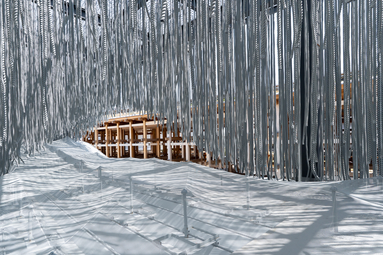 We aimed to create a pavilion that reflects this connection, where visitors could feel the maritime presence on the Expo site, which sits on an island of the Seto Inland Sea. Unlike mountains, the sea has no form, so it is not easy to express it as architecture, but it was a goal worth tackling. We came up with the idea of creating an actual place – not a form – where one could experience the nature of the sea as a physical sensation. We used boat lines that were one of the main tools for sailing ships during the Age of Discovery. The wind blows through the myriad of lines that vary in thickness, causing them to sway slowly or vibrate minutely. Light filters through and reflects off the lines, creating a shifting pattern. Together, these elements evoke the essence of the sea – an ever-changing space shaped by waves and vibrations.