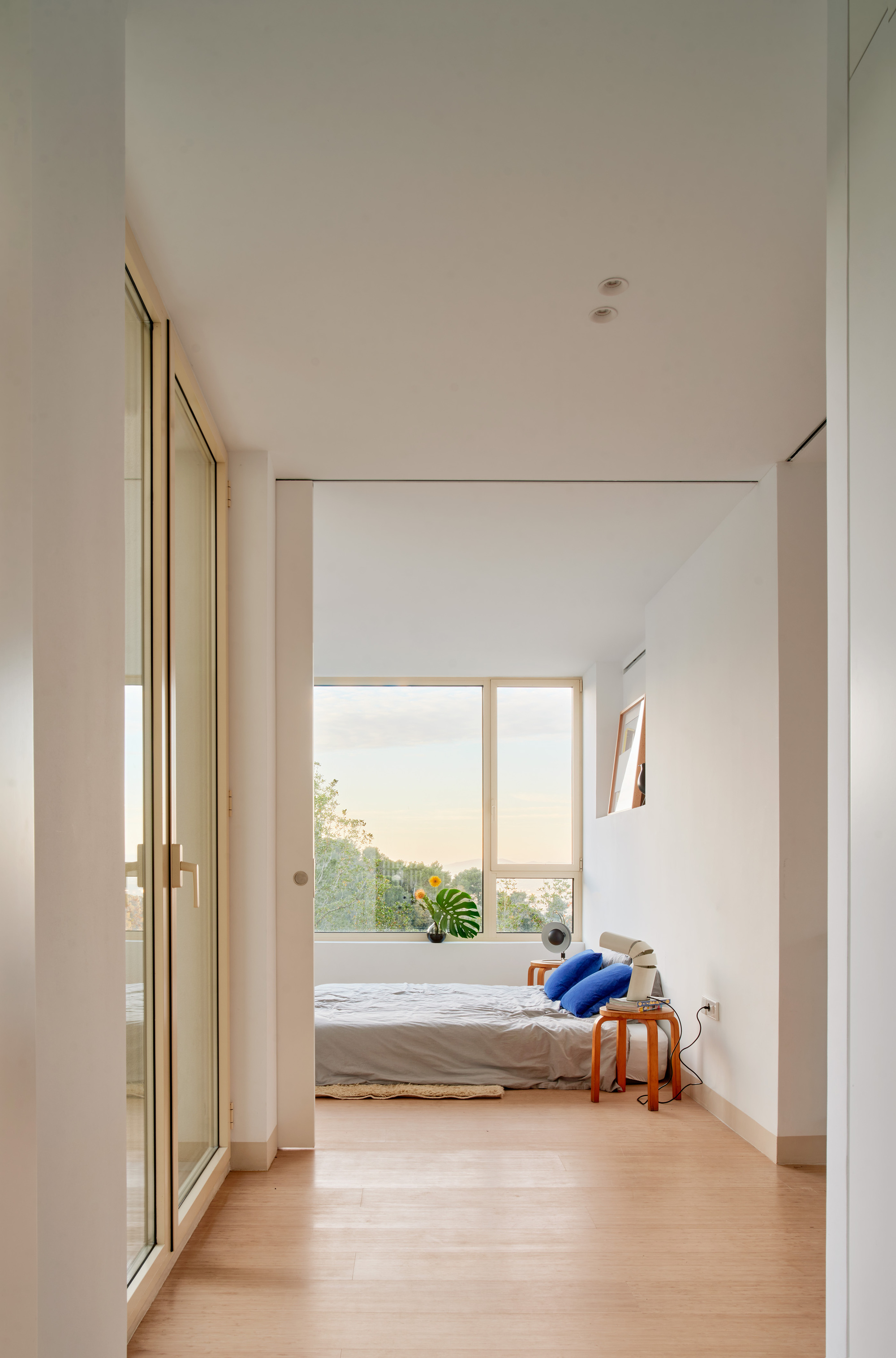 On the upper floor, a central space connects two small balconies that frame the landscape while providing access to three bedrooms and a bathroom. The master bedroom includes a walk in closet and an ensuite bathroom, with sliding doors that allow for flexible space configuration. Even the shower is positioned to enjoy a new window, balancing views and privacy.