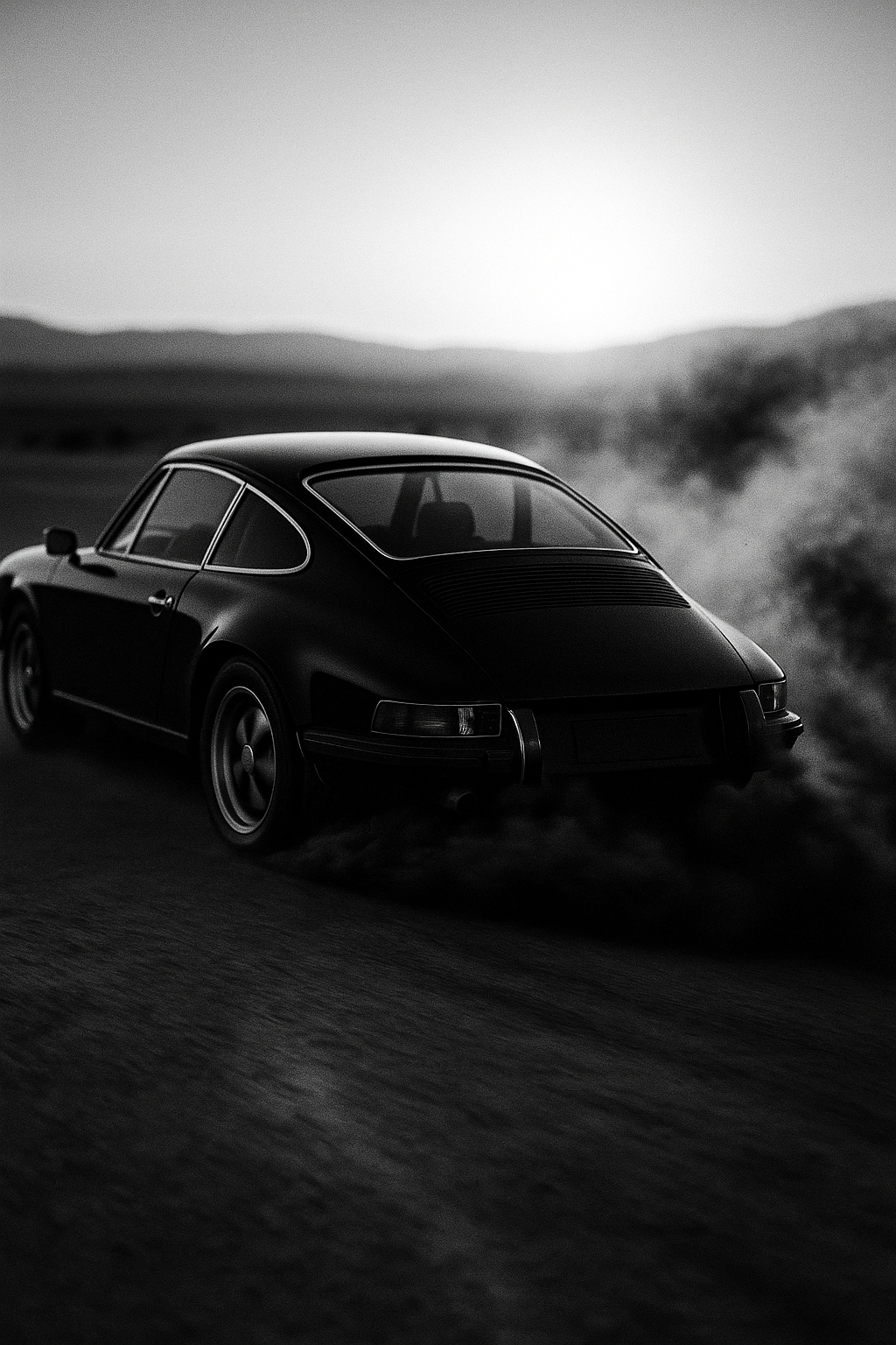 "Desert Drift Porsche A gritty editorial photograph of a black Porsche 911 drifting across a barren desert landscape. Captured from a low, slightly behind angle, the shot uses a 50mm prime lens on a full-frame camera with a wide-open aperture (around f/1.8) to achieve a shallow depth of field. The early evening sunlight backlights the scene, casting a warm glow on the dust cloud and creating a high-contrast effect with deep shadows. The image is intentionally black-and-white with fine analog film grain, giving it a nostalgic cinematic feel. The car's glossy surfaces and spun alloy wheels pick up subtle highlight reflections, while a cloud of dark sand and smoke churns dynamically behind it with slight motion blur. The composition is static in framing but implies motion as if the camera is on a slow dolly tracking the speeding car. Overall the photo has a polished, hyperreal commercial look with rich textures on the car's paint and the rough ground, emulating an editorial automotive photoshoot."