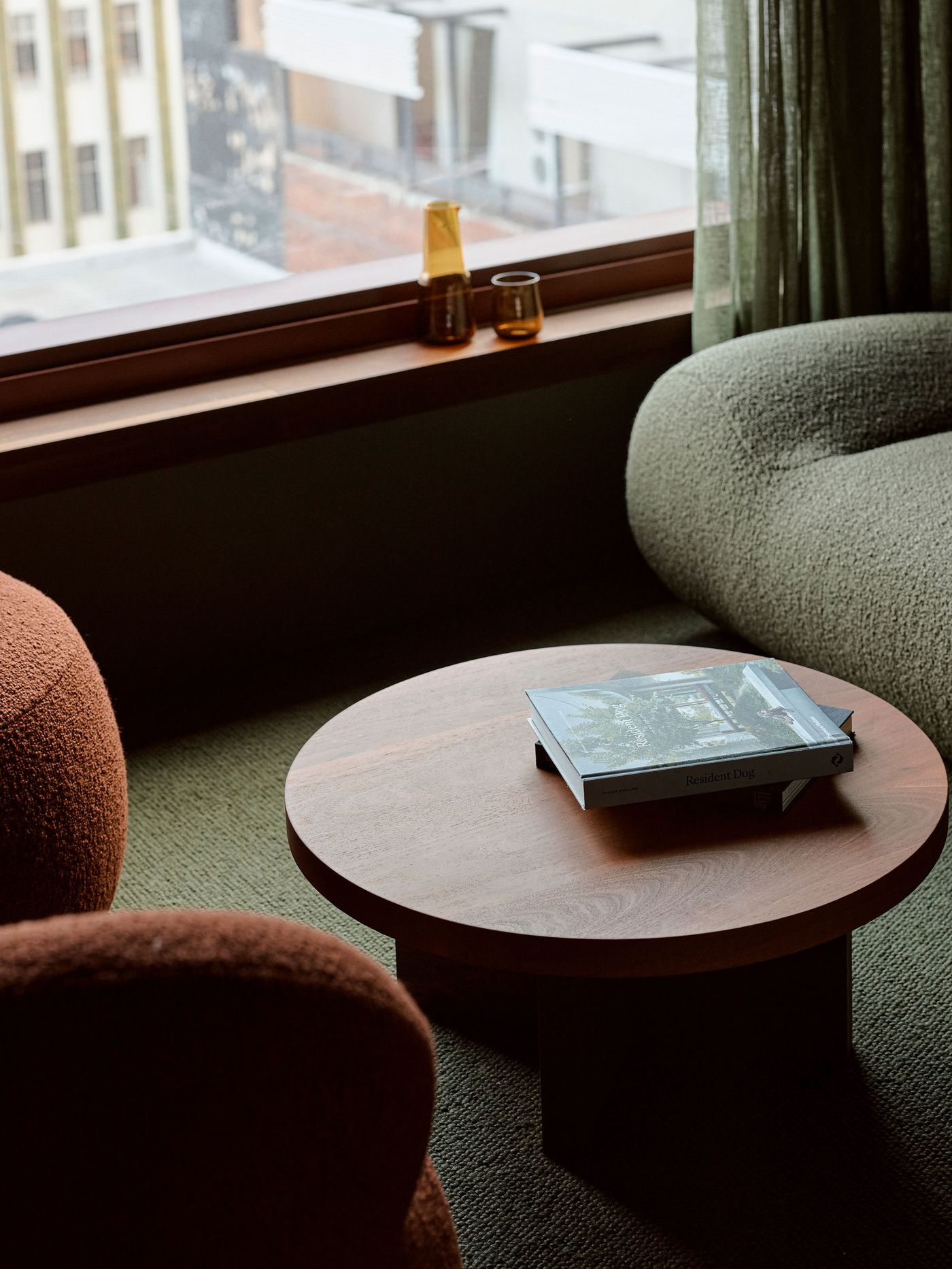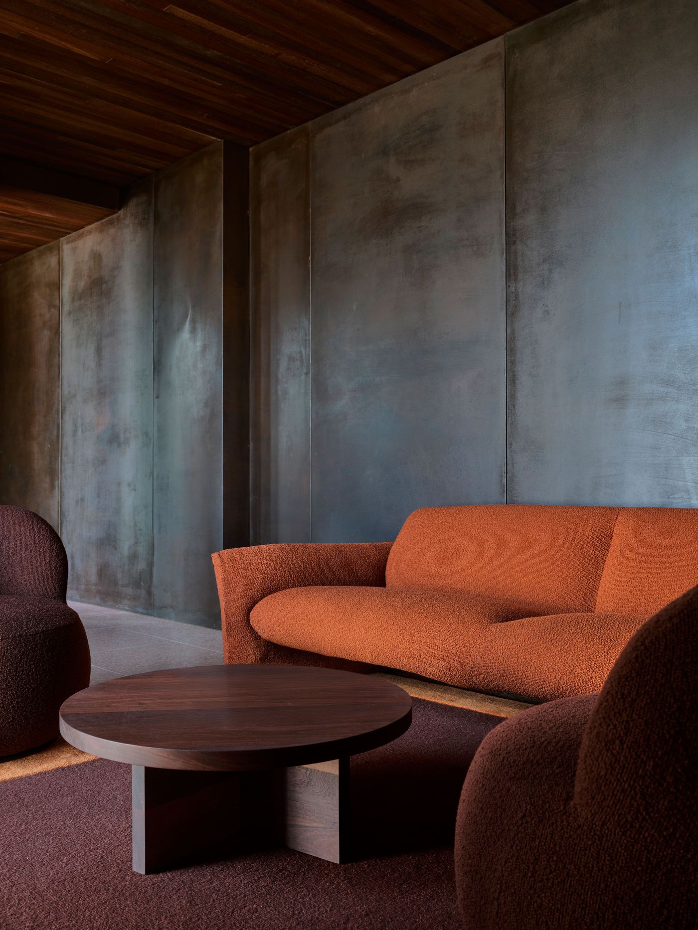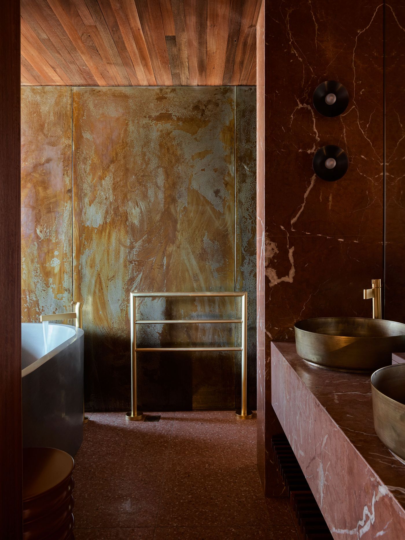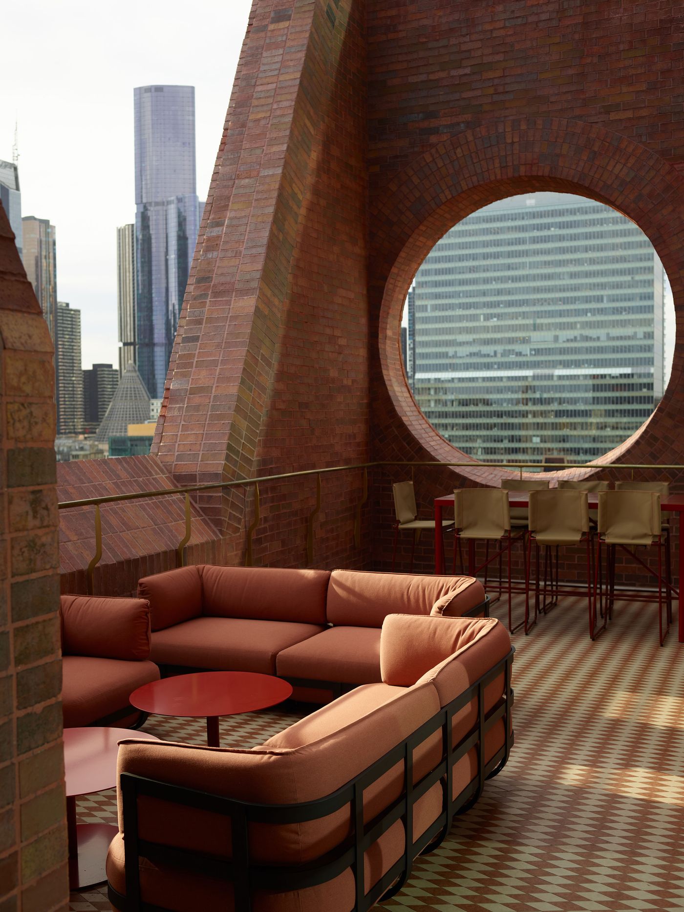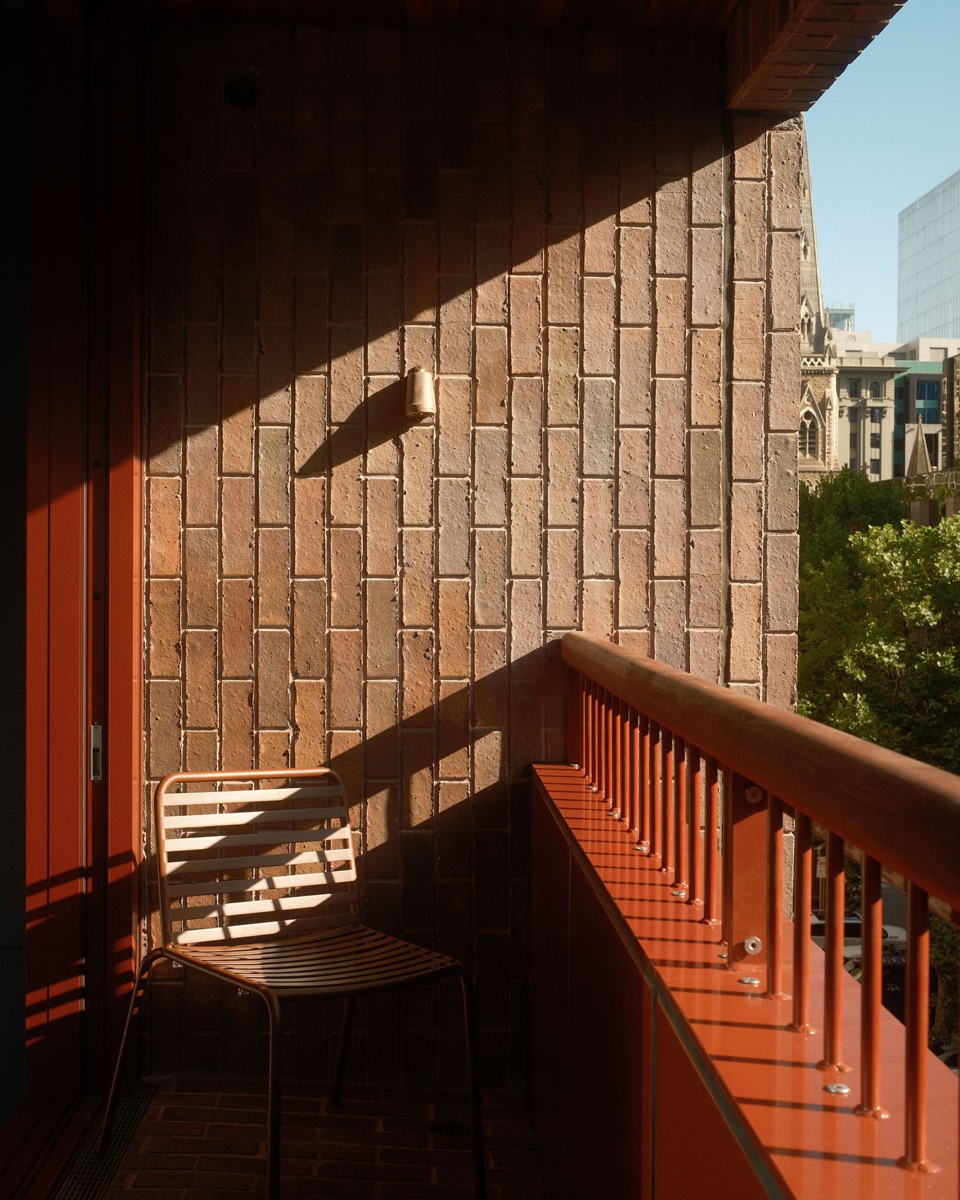 If the exterior is tonal and textural, the interiors are a joyful burst of urban cool, expressed through colour, tactility, and local craft. Here, terrazzo floors, specially developed for the project, are paired with oiled Jarrah wood, their natural warmth offset by brass and Corten steel accents. Contemporary furnishings by local brands and designers, many custom-made for the hotel, convey effortless sophistication and idiosyncratic modernity, while colours lean warm and inviting with rich reds, ochres and jewel tones punctuated by indigo and magenta.
