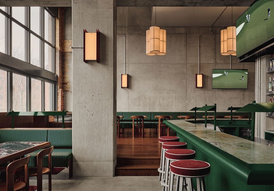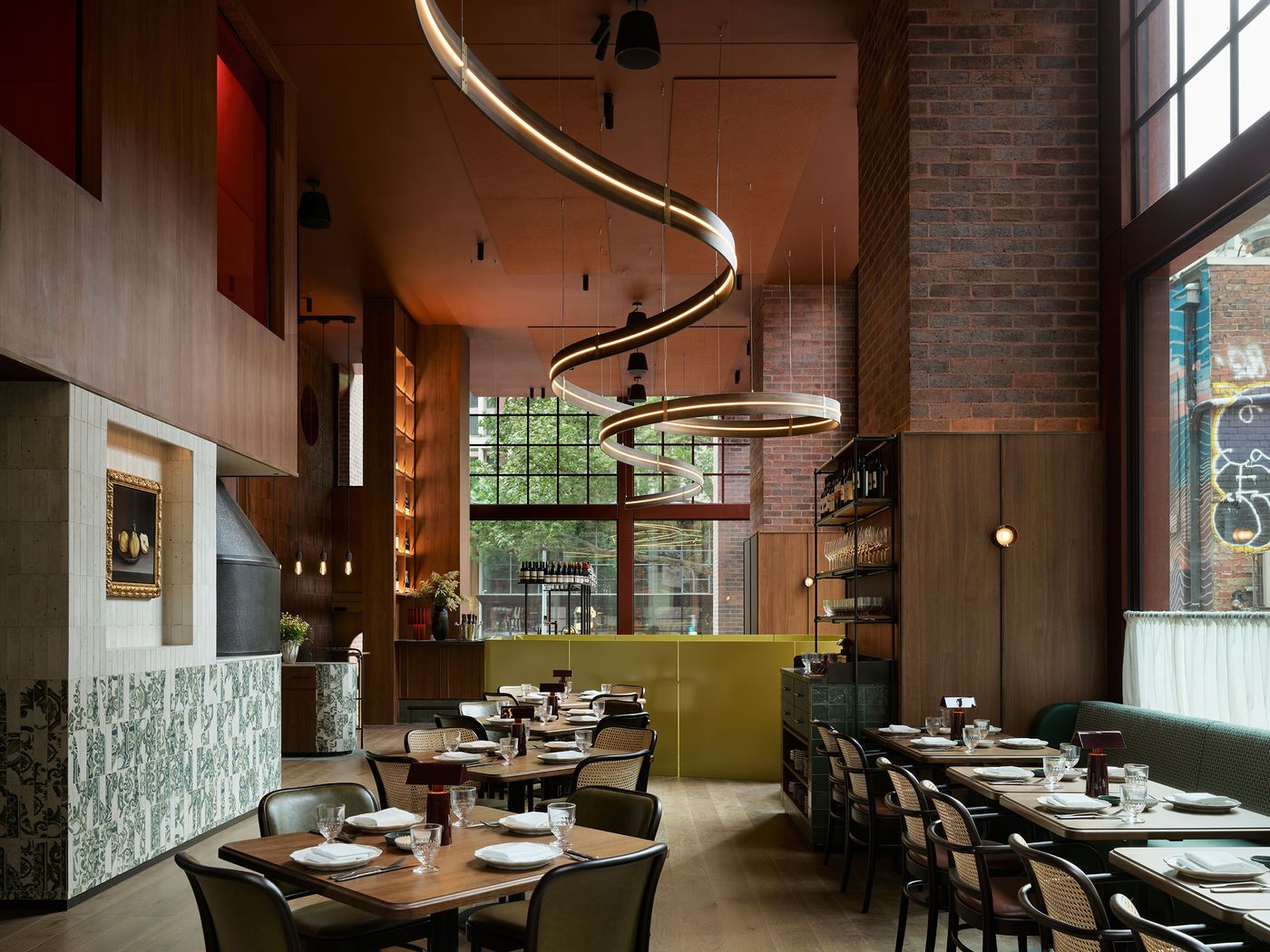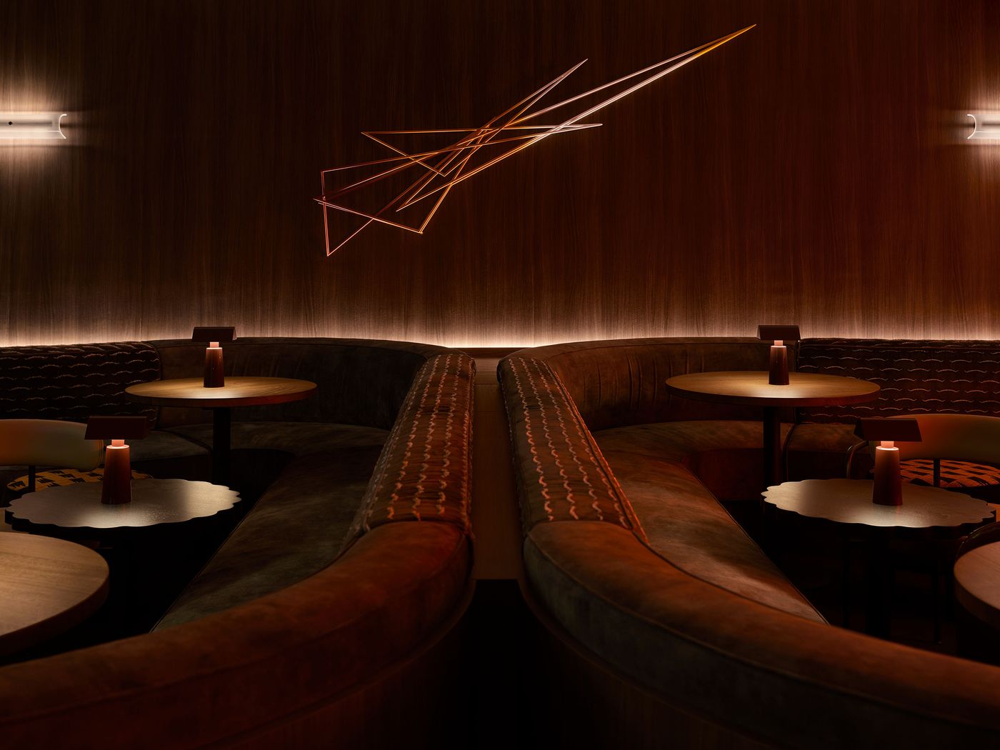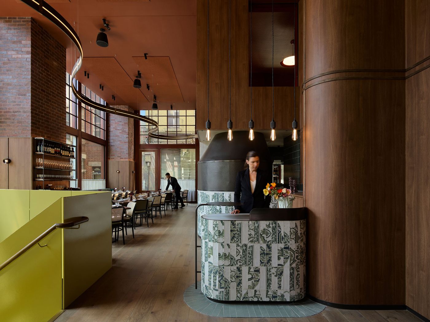 아래층에는 마르멜로(Marmelo) 레스토랑과 미스터 밀스(Mr Mills) 바가 각각 1층과 지하층을 차지하고 있다. 두 공간은 각기 다른 분위기를 갖추고 있지만 유사한 디자인 요소를 공유한다. 하드우드 바닥, 목재 벽 클래딩, 브러시드 메탈 디테일로 절제된 도시적 분위기를 조성하며, 풍부한 태피스트리 직물로 장식된 반원형 벤치 좌석은 고급스러움과 친밀함을 더한다. 리스본의 거리를 떠올리게 하는 질감 있는 클레이와 손으로 그린 타일은 메뉴의 이베리안 영향을 반영하는 장식적 포인트를 제공한다.