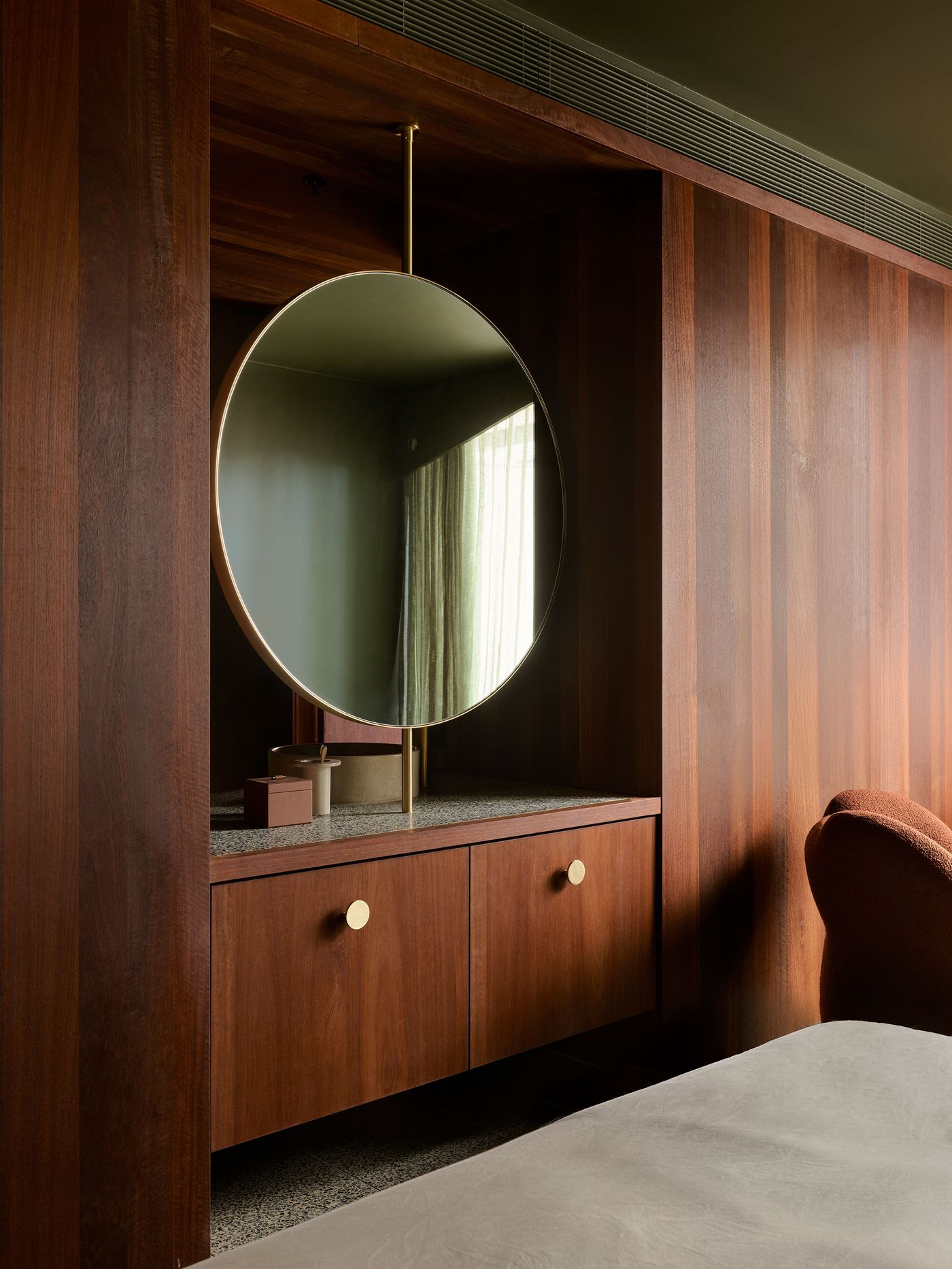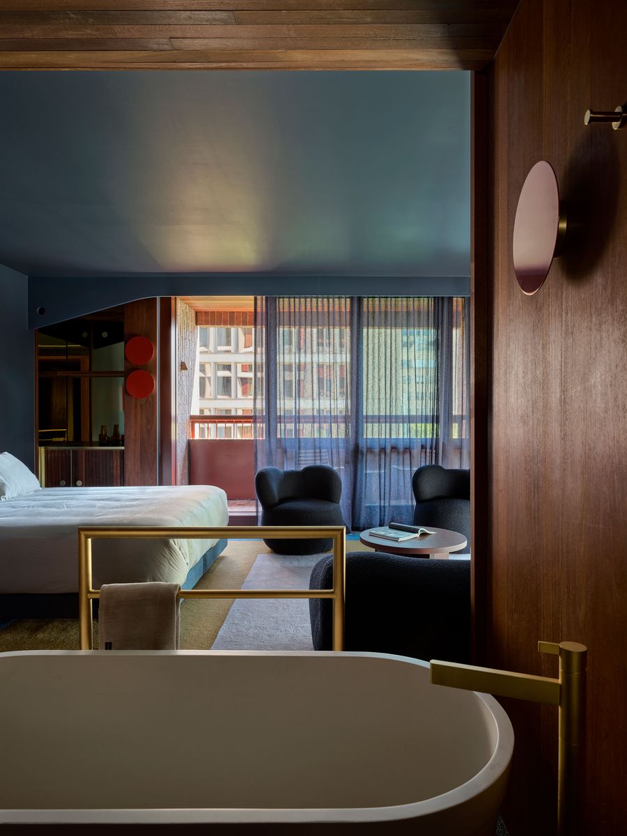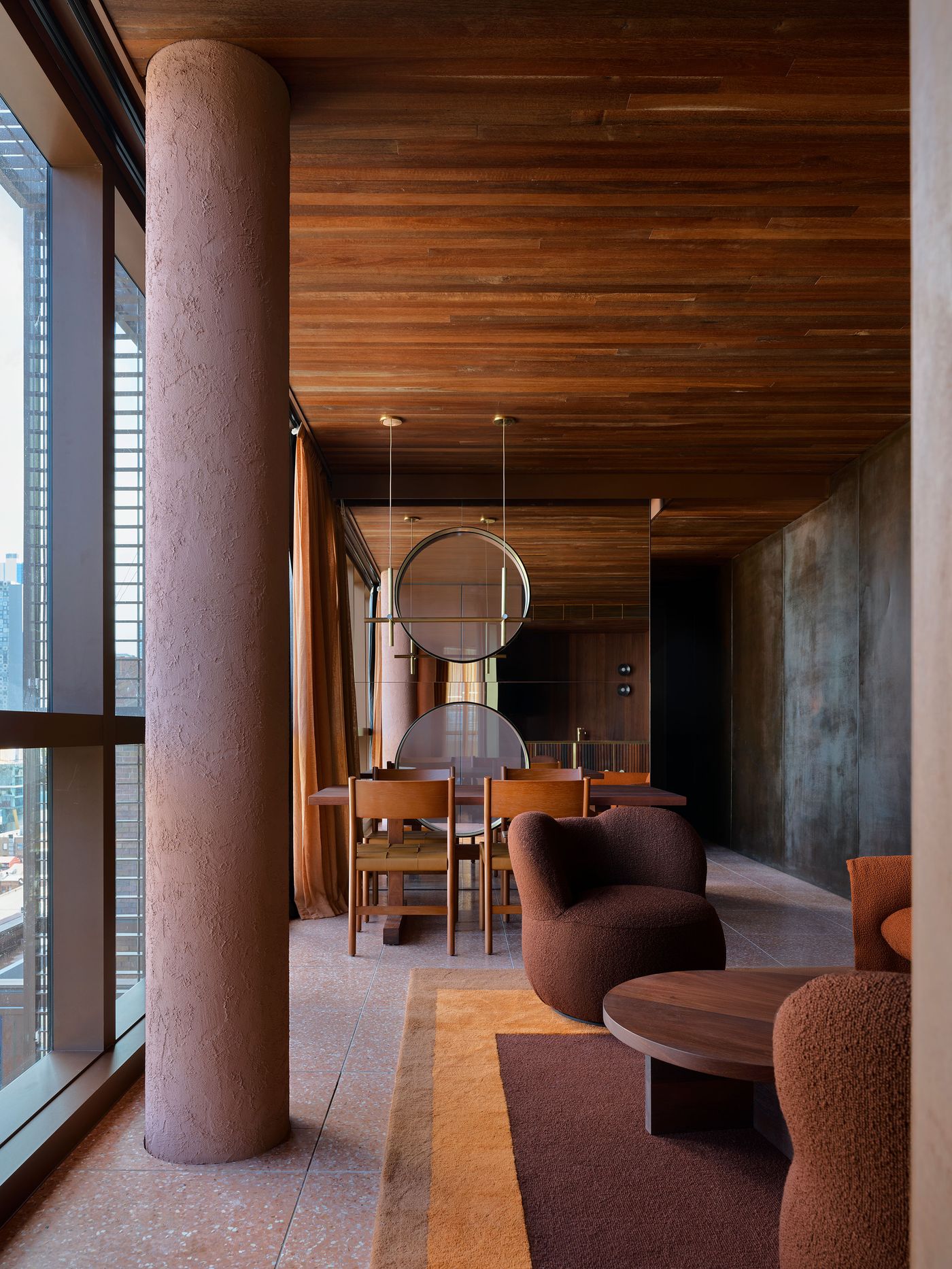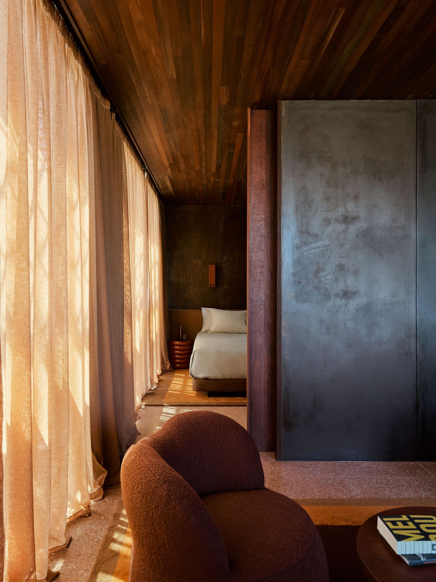 외부가 톤과 질감의 세계라면, 내부는 색상, 촉감, 그리고 지역 장인정신을 통해 표현된 도시적 쿨함의 향연이다. 호텔을 위해 특별히 개발된 테라조 바닥이 오일 처리된 자라(Jarrah) 목재와 어우러지며, 그 자연스러운 따스함은 황동과 코르텐 강철 장식으로 균형을 이룬다. 많은 부분이 호텔을 위해 맞춤 제작된 현지 브랜드와 디자이너의 현대적 가구들은 수월한 세련미와 독특한 현대성을 전달하며, 색상은 인디고와 마젠타로 강조된 풍부한 빨강, 황토색, 보석 톤의 따뜻하고 매력적인 분위기로 구성되었다.