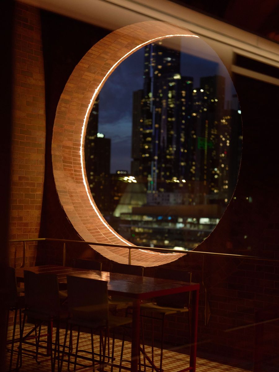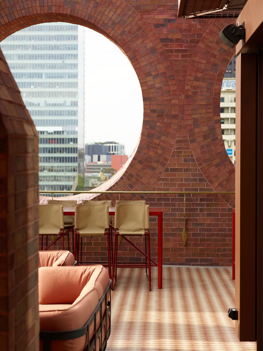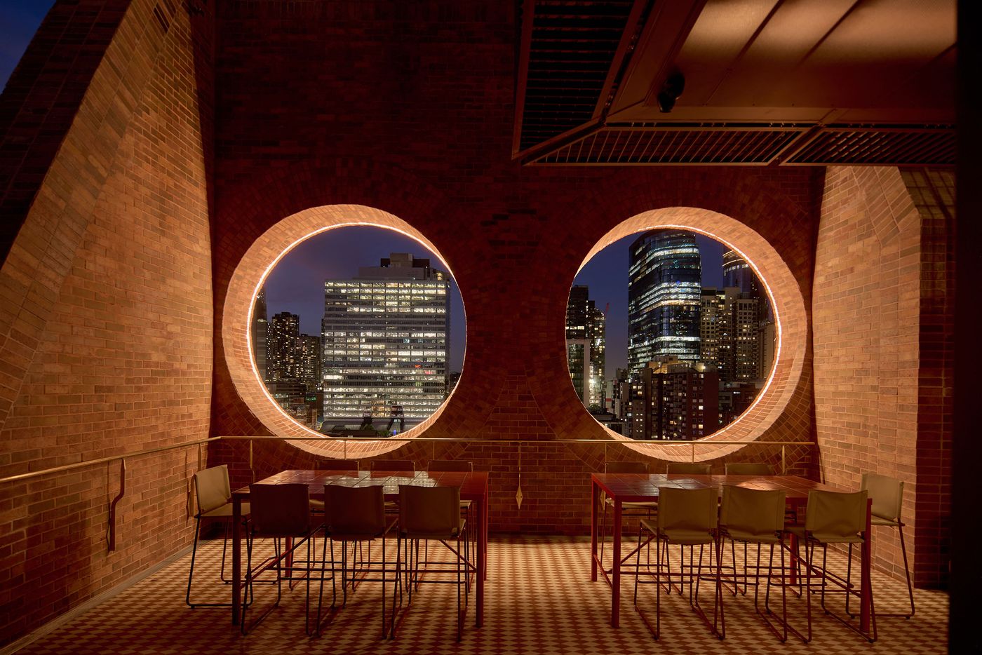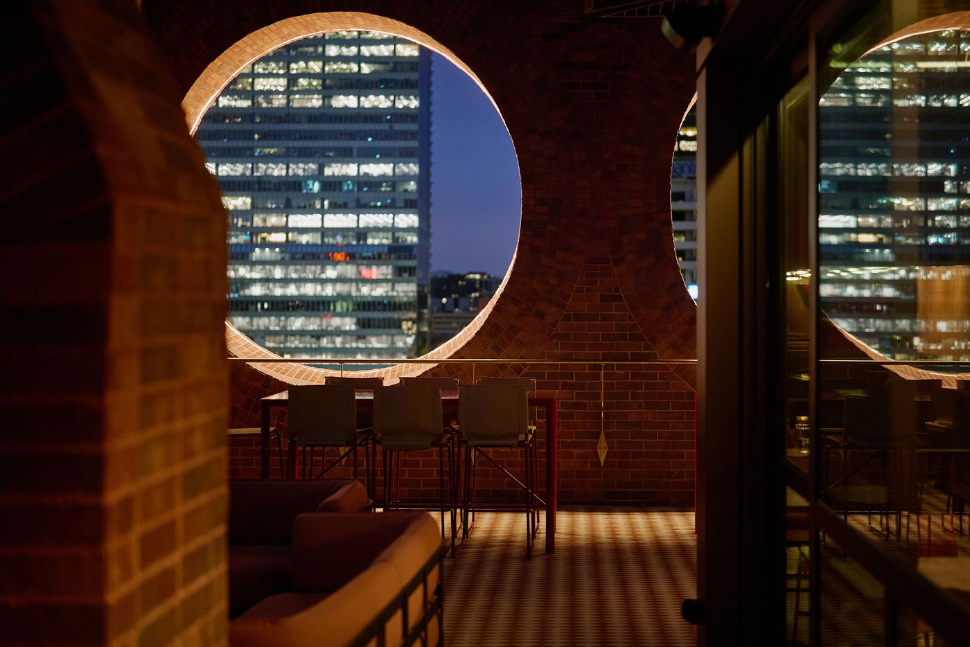 12층에 위치한 호텔의 시그니처 레스토랑 '미드 에어'는 활기 넘치는 지중해 요리에 맞춰 호텔의 장난스러운 디자인 언어를 한층 강화했다. 실내와 실외 테라스로 구성된 이 공간은 햇살을 받은 듯한 빨강, 황토색, 테라코타 색상과 깊은 푸른색 강조로 생동감을 불어넣었다. 바 카운터까지 이어지는 다이아몬드 패턴 타일과 벽을 장식하는 부드러운 곡선형 커튼은 거의 연극적인 분위기를 자아낸다. 한편, 테라스 벽을 장식하는 큰 원형 개구부는 도시 경관을 액자처럼 담아내며 색다른 경험을 제공한다.