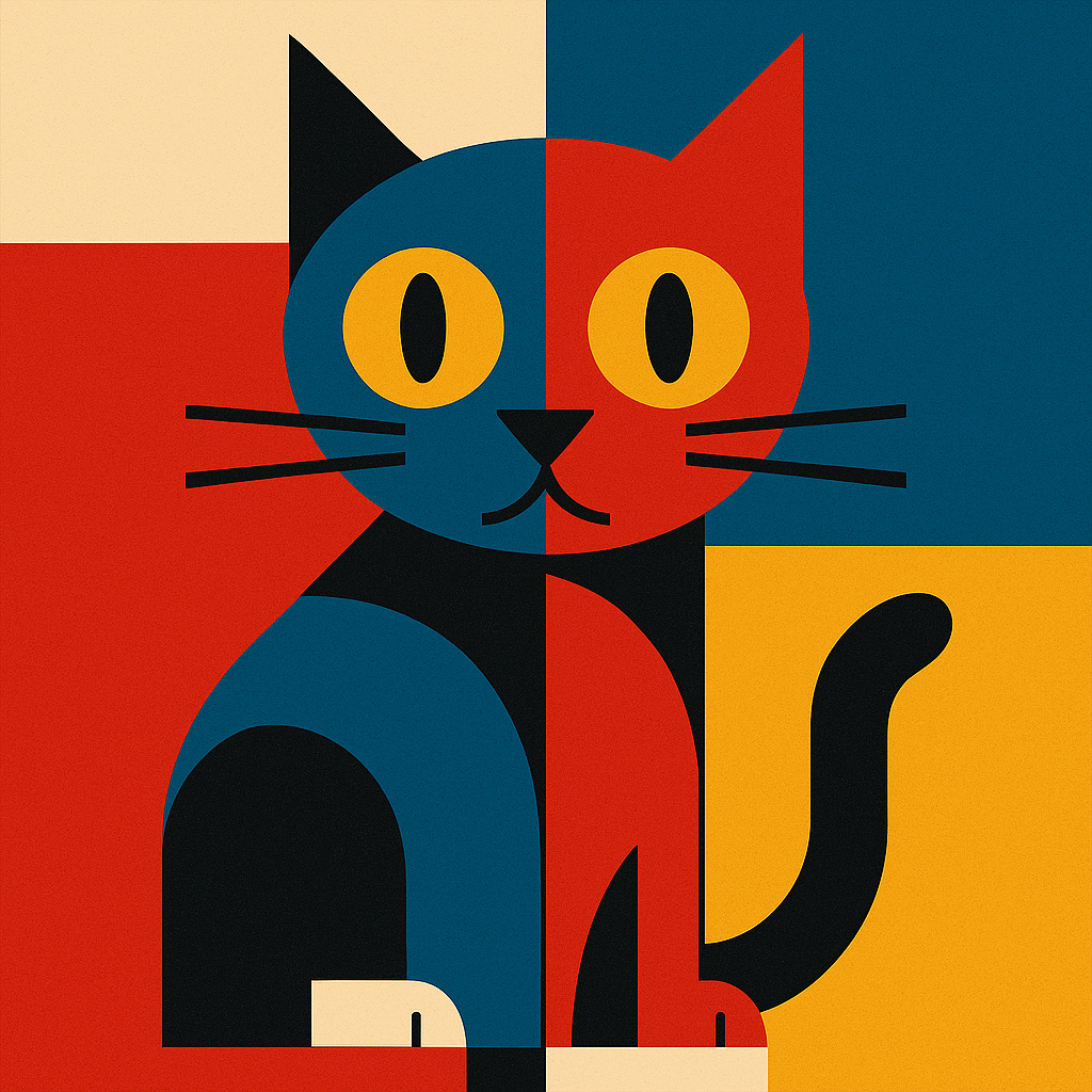 - 주제/대상: 기하학적으로 추상화된 고양이를 중심 모티프로 한 구성주의/바우하우스 스타일 일러스트레이션