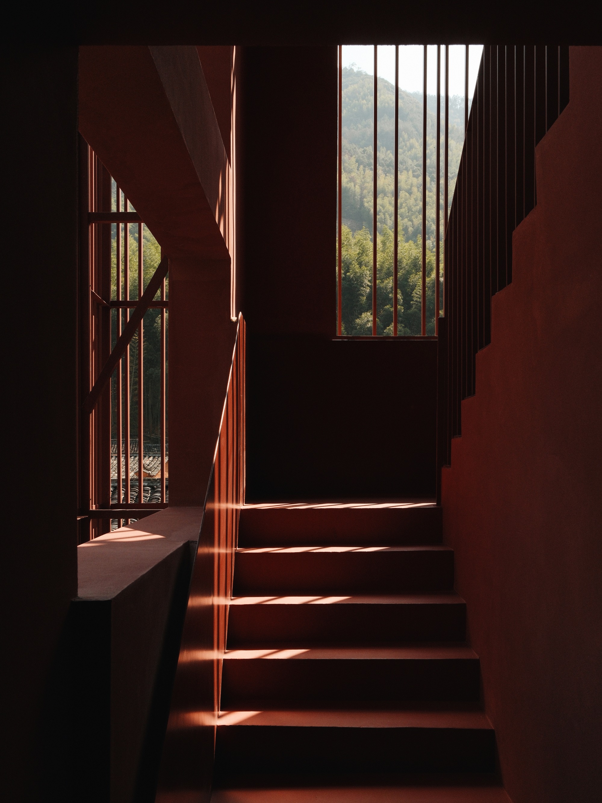 Ascending Around a Shaft of Light In order to give full focus to the artworks, the architects intentionally minimized additive interior design interventions, instead prioritizing the clarity of circulation and the relationship between interior and exterior spaces. The journey begins in the adjacent rammed-earth structure, where a "prologue hall" has been inserted—a quiet, dimly lit space. Aside from red-painted steel cladding added to the window frames and a traditional "tiger window," the room largely preserves the original appearance of the old house. By contrasting this subdued spatial atmosphere with the contemporary interior of the main building, visitors undergo a sensory transition before entering the main exhibition areas.