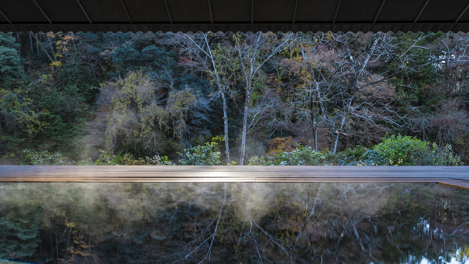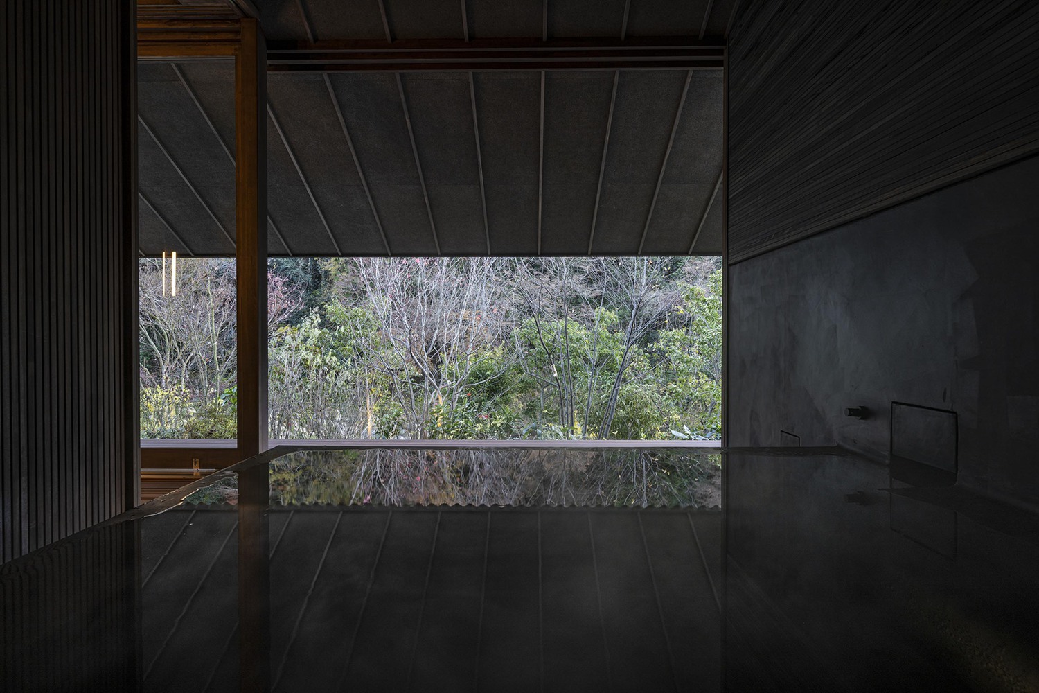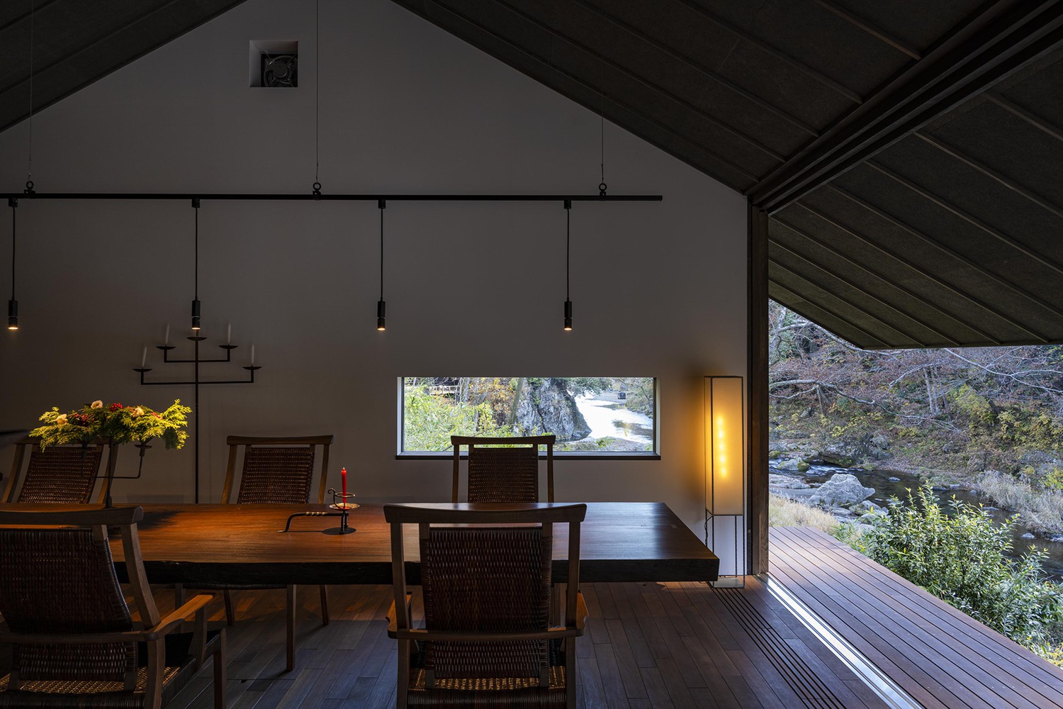 건물의 핵심에는 '야외 거실(Outdoor Living)'이 자리한다. 깊고 낮은 처마로 덮인 넓은 야외 데크는 앞으로 아키가와 계곡 풍경을 두루마리처럼 펼쳐 보이고, 뒤로는 대나무 숲 중정을, 그리고 건물 사이사이로 은은한 바람이 흘러들어 대지의 정수를 온전히 체현한다.