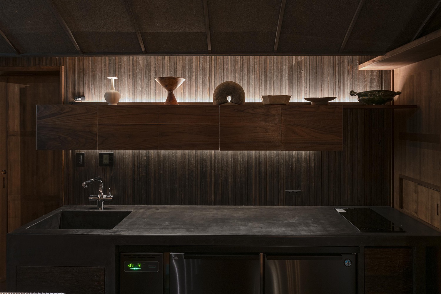 벽체는 2만 개가 넘는 19mm 크기의 삼나무 판재를 1mm 간격으로 평행하게 배열하여 만들어졌다. 외부 벽은 빗물의 방향에 따라 수직으로, 내부 벽은 바람의 흐름 방향에 따라 수평으로 설치했다. 표면에서는 단 하나의 못도 보이지 않는다.