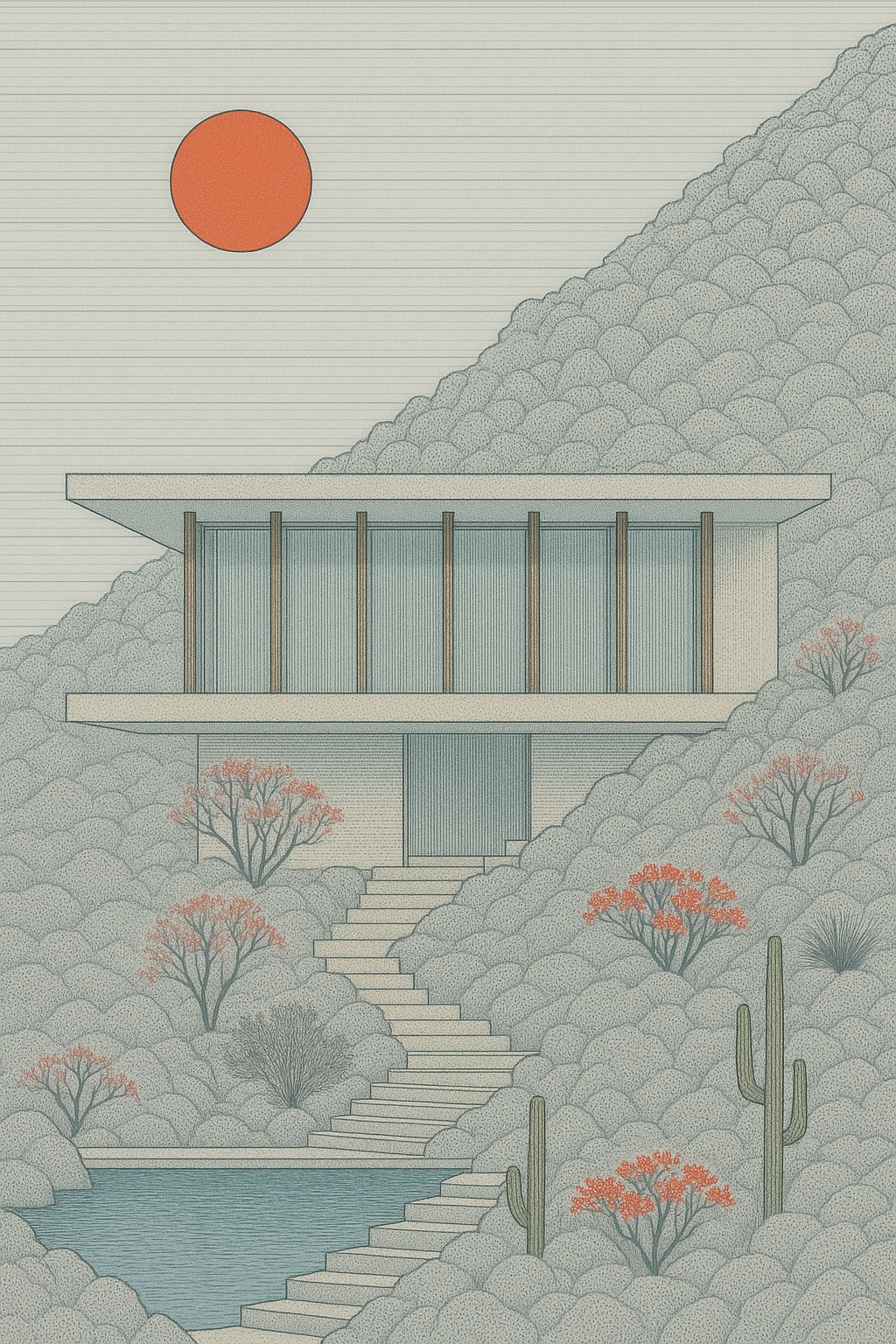 일본풍 건축 라인 드로잉, 노트북 용지 배경에 표현. 바위산에 지어진 미니멀리스트 흰색 주택으로 정투영법(정면 입면도)으로만 표현됨. 대형 유리 파사드와 가는 목재 기둥이 특징. 밝은 붉은 원형 태양. 제한된 팔레트: 크림색, 빨강, 회색, 하늘색. 전체적으로 균일한 선 밀도. 동양화의 정면성 원칙 적용. 수평 볼륨, 돌 계단, 작은 수영장, 붉은 강조색의 드문 사막 식물 포함.