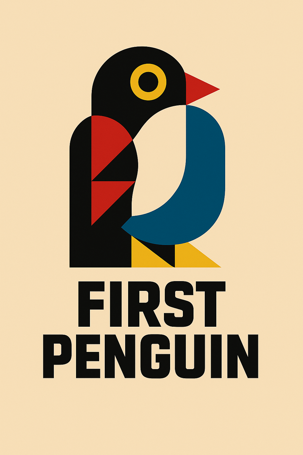 현대 기하학적 펭귄 로고: 원형-삼각형 구성, 분할 색상 디자인, 검정-빨강-파랑-노랑-베이지 색상, 타이포그래피 통합, FIRST PENGUIN 텍스트, 기업 로고 미학, 모던 미니멀리즘, 브랜드 아이덴티티, 1200×1600px, 심볼+워드마크 조합