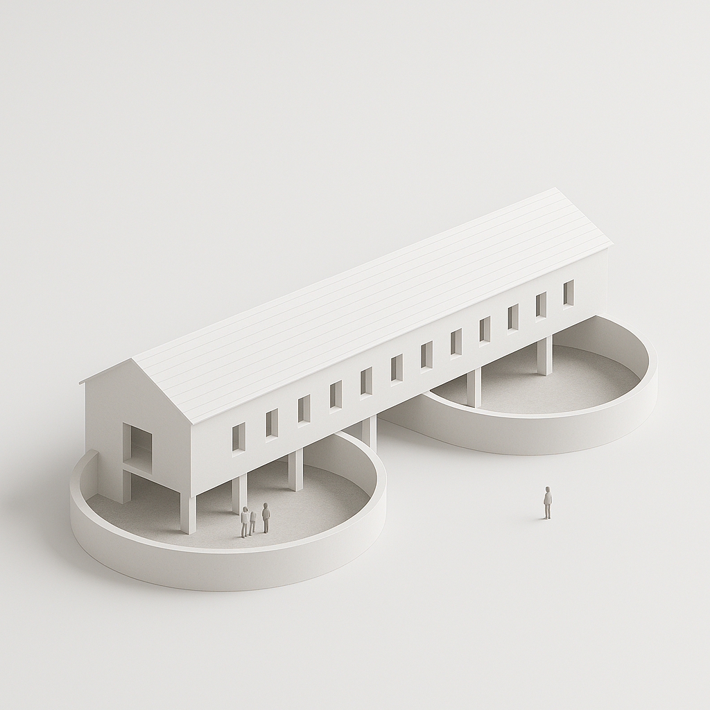 하나의 박공지붕 매스가 두 개의 원형 선큰 중정 위로 부유한다. 건축은 땅을 잊고 하늘로 떠오르며, 세장한 백색 필로티들이 그 상승을 지탱한다. 1-2층 규모의 수평 볼륨은 얕은 경사의 박공과 균등 배치된 정사각형 창들로 리듬을 새기고, 지붕면의 수평 홈은 금속 패널의 이음새처럼 선형성을 그어 넣는다. 기둥들은 원형 중정 내부로 침투하여 상부 매스와 하부 보이드를 매개하며, 그 사이사이로 반개방의 전이공간이 숨쉰다. 연회색 콘크리트 바닥은 백색 매스와 조용한 대화를 나누고, 부상하는 수평성과 침강하는 원형성이 대위법적 긴장을 연출한다. 필로티 하부는 내부도 외부도 아닌 경계의 공간으로서, 인체 스케일의 피규어들이 그 모호함 속에서 머물고 만나며 사유한다.