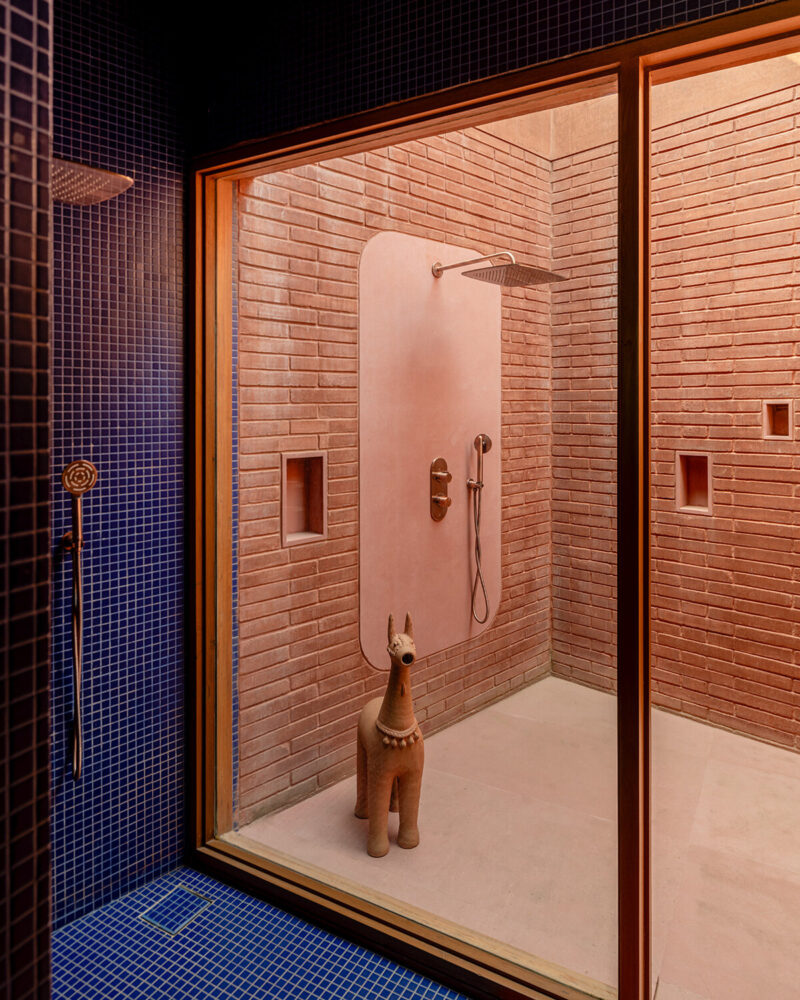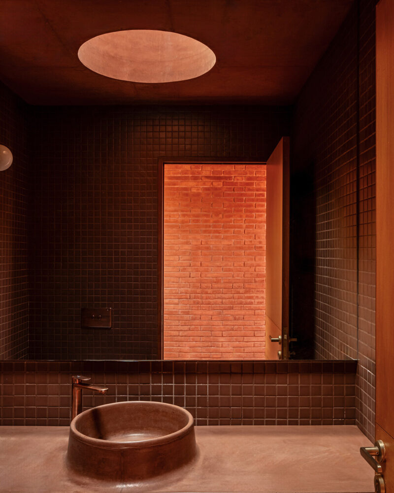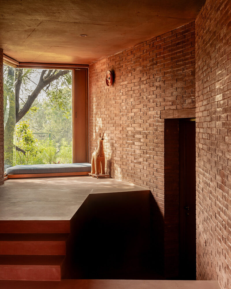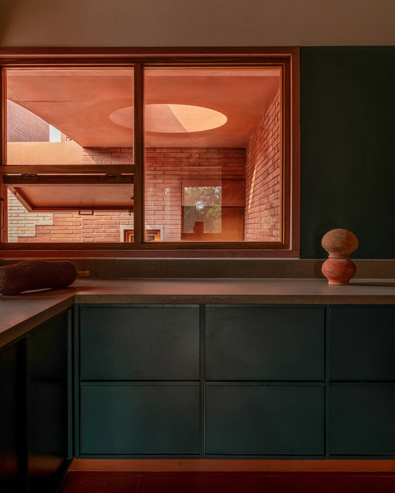 Material continuity defines the sensory experience of Studio Sangath’s Alloa Hills Weekend House. Terracotta finds its way into nearly every surface, from the pigmented concrete walls to the red-toned brick floors and sun-warmed pavers. This shared language of texture and tone allows the architecture to unfold slowly and cohesively, offering a lingering, tactile warmth. In the Alloa Hills, the architects craft a home that moves with the day, is generous with its thresholds, and is fluent in the language of the land.