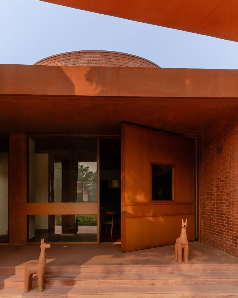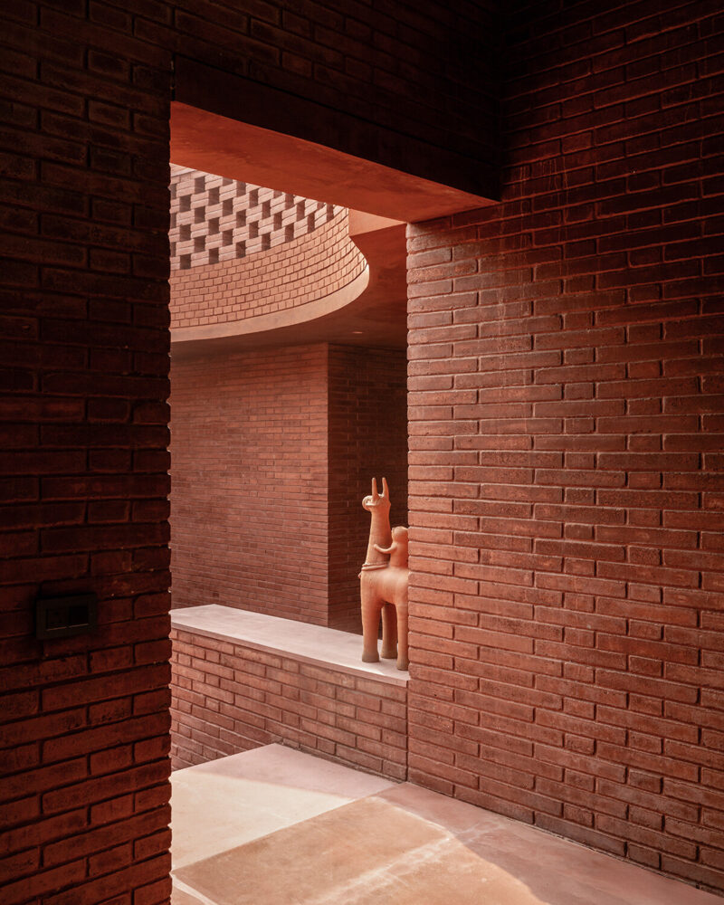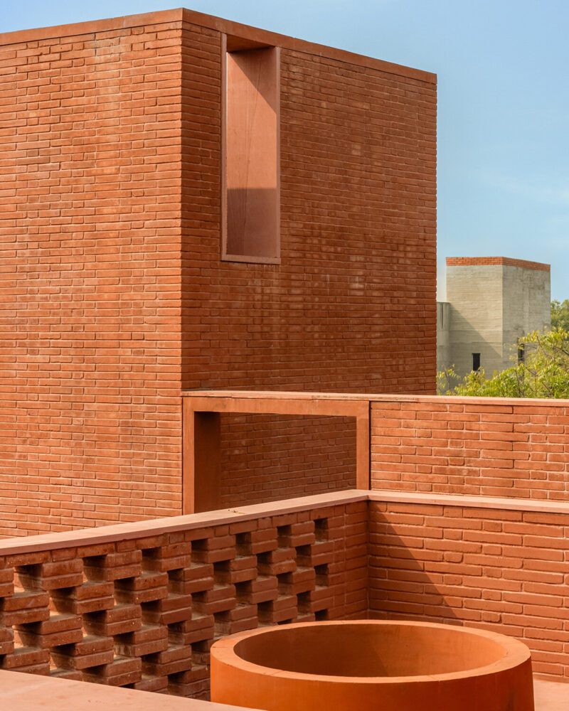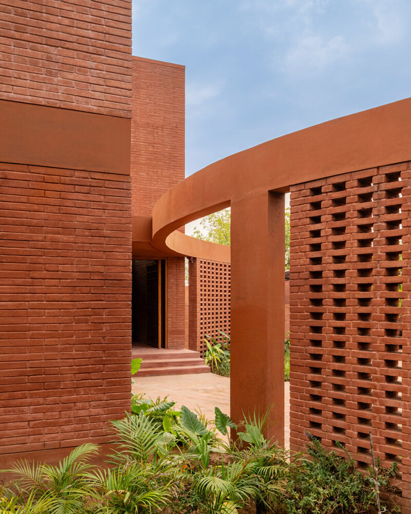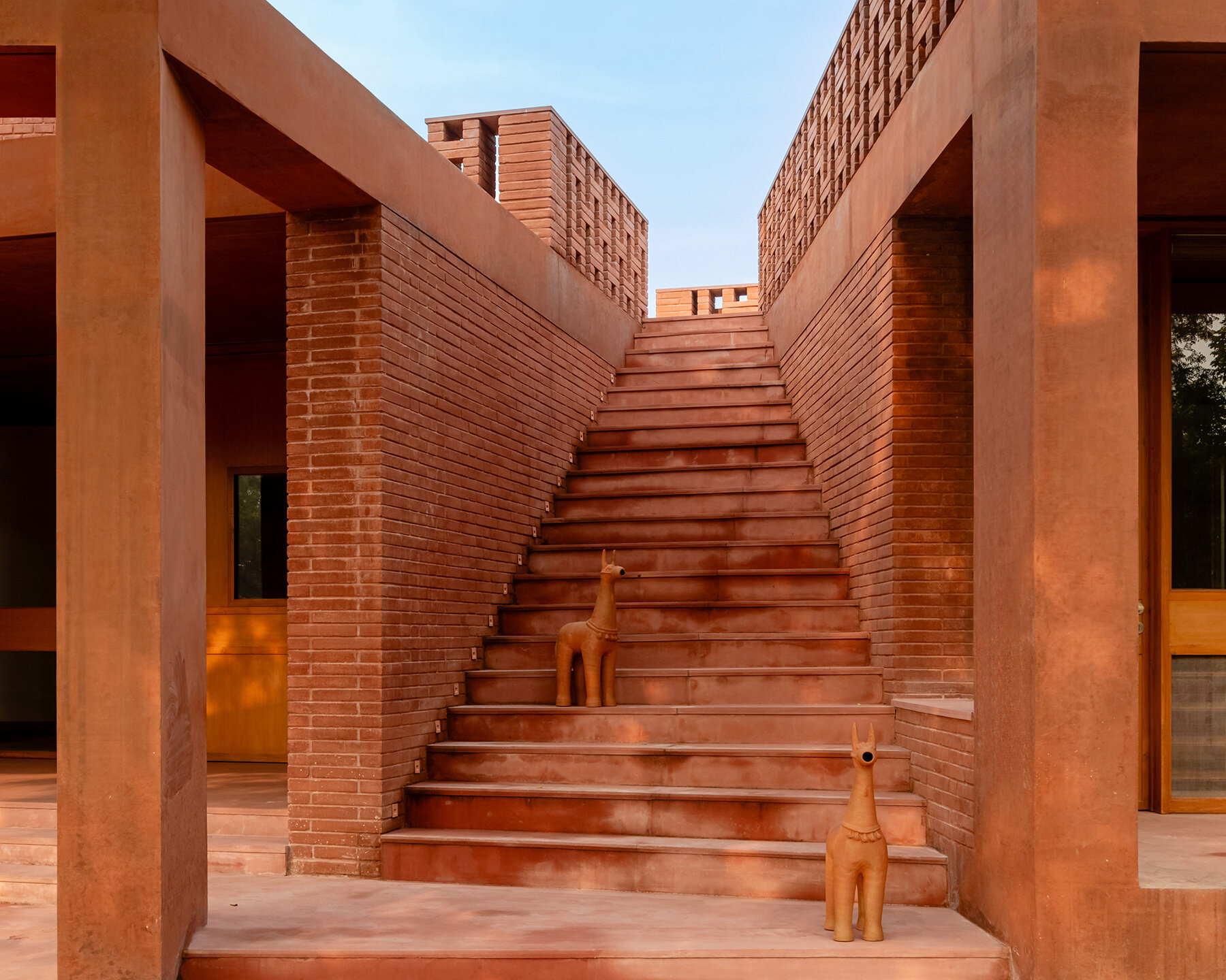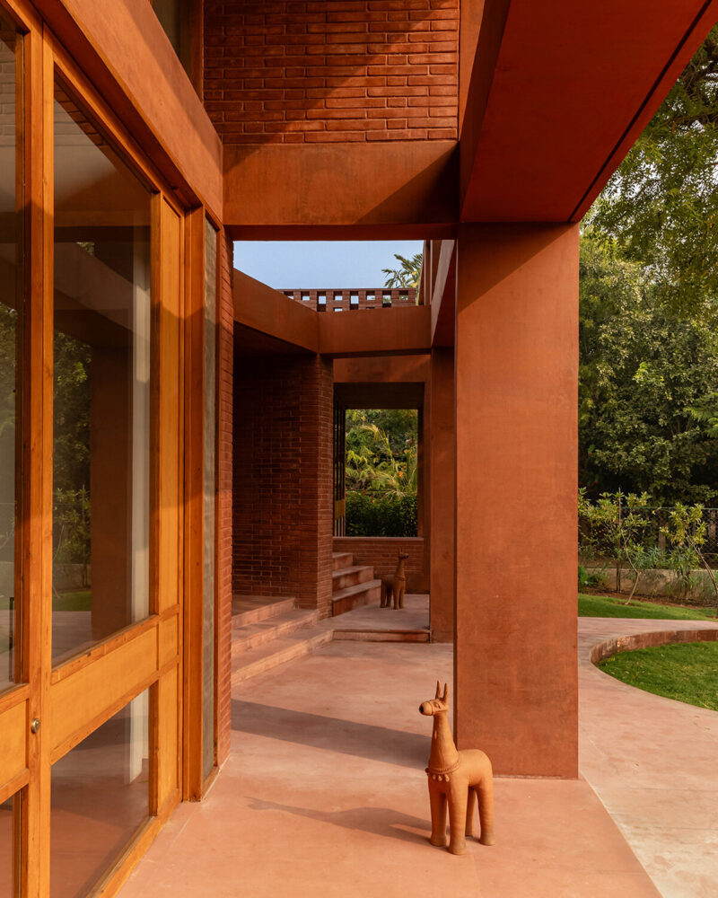 붉은 벽돌과 테라코타로 이루어진 이 주택의 핵심에는 내부 공간을 나누면서 동시에 하나로 묶어주는 중정이 자리한다. 안뜰 정원은 지평선을 안으로 끌어들여 자연을 먼 경치가 아닌 일상의 동반자로 재정의한다. 이러한 공간 배치는 주변 지형으로 흘러내리는 단계적 테라스로 확장되어, 하늘 아래 조용한 저녁부터 자연스러운 공연까지 모든 것을 품을 수 있도록 의도되었다. Studio Sangath의 설계는 주택이 열린 팔로 풍경을 받아들이도록 하여 보호막과 경치 사이의 경계를 자연스럽게 허물어낸다.