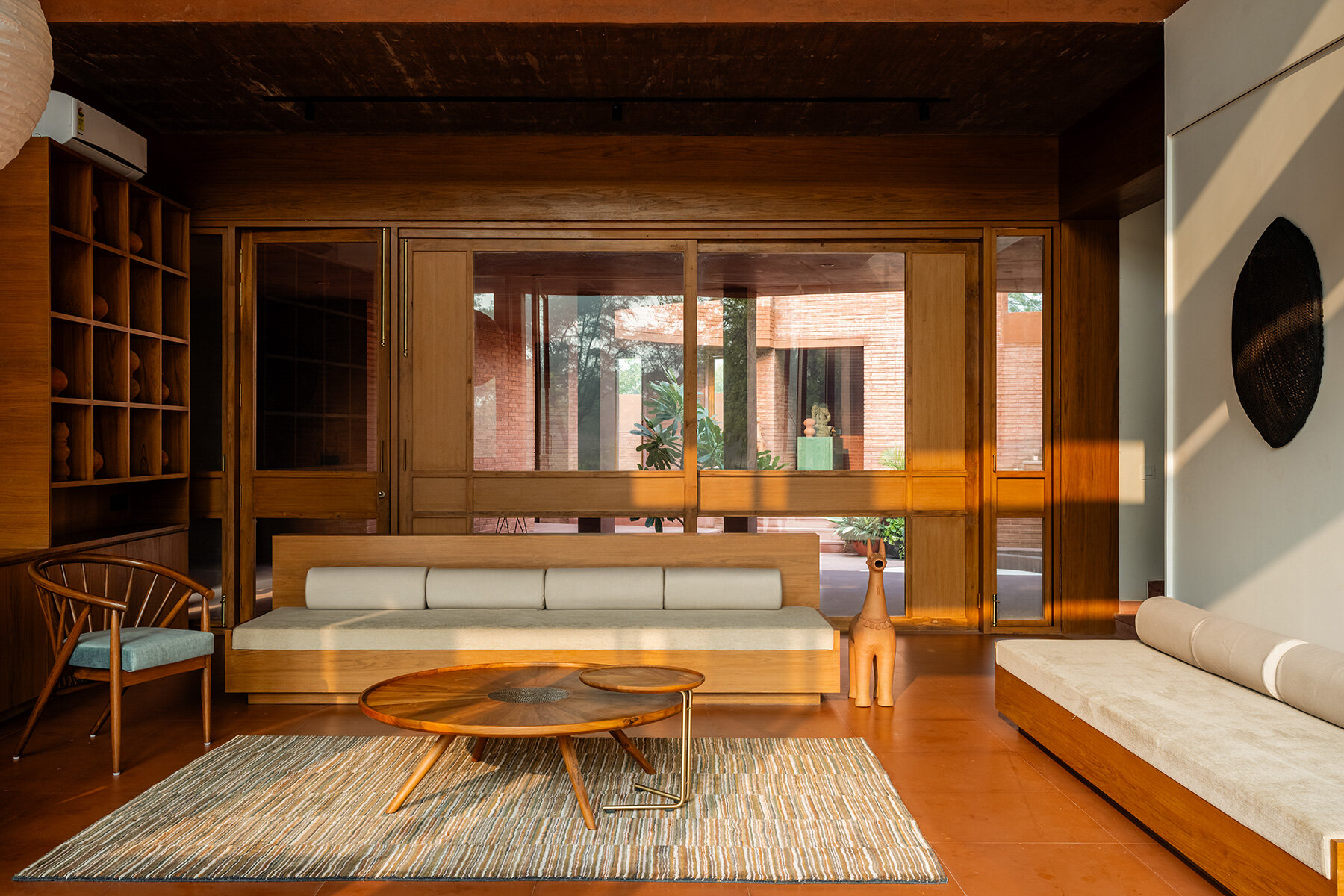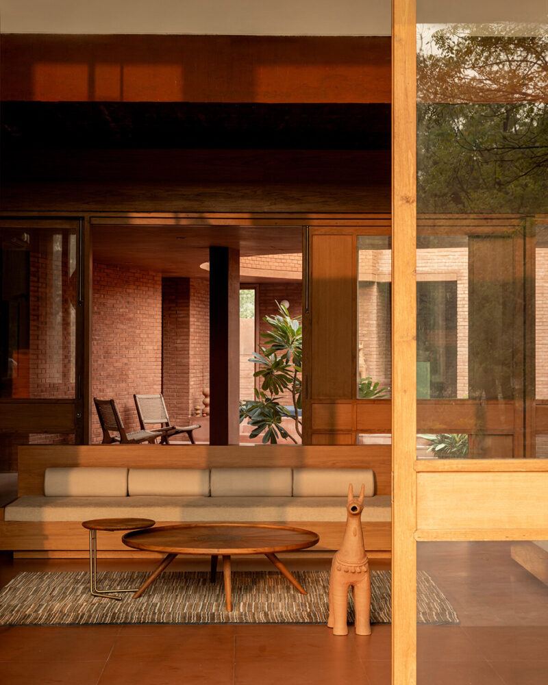 At the core of the brick and terracotta residence is a courtyard that both divides and anchors the interior spaces. The inner garden draws the horizon inward, reframing nature as a constant companion rather than a distant view. This spatial arrangement extends outward into a stepped terrace that spills into the surrounding terrain, intended to host everything from quiet evenings under the sky to informal performances. Studio Sangath’s design orients the home to receive the landscape with open arms, dissolving barriers between shelter and scenery.