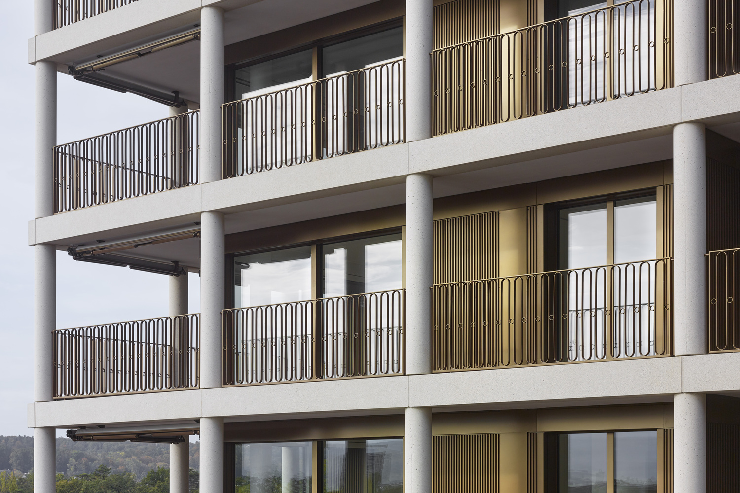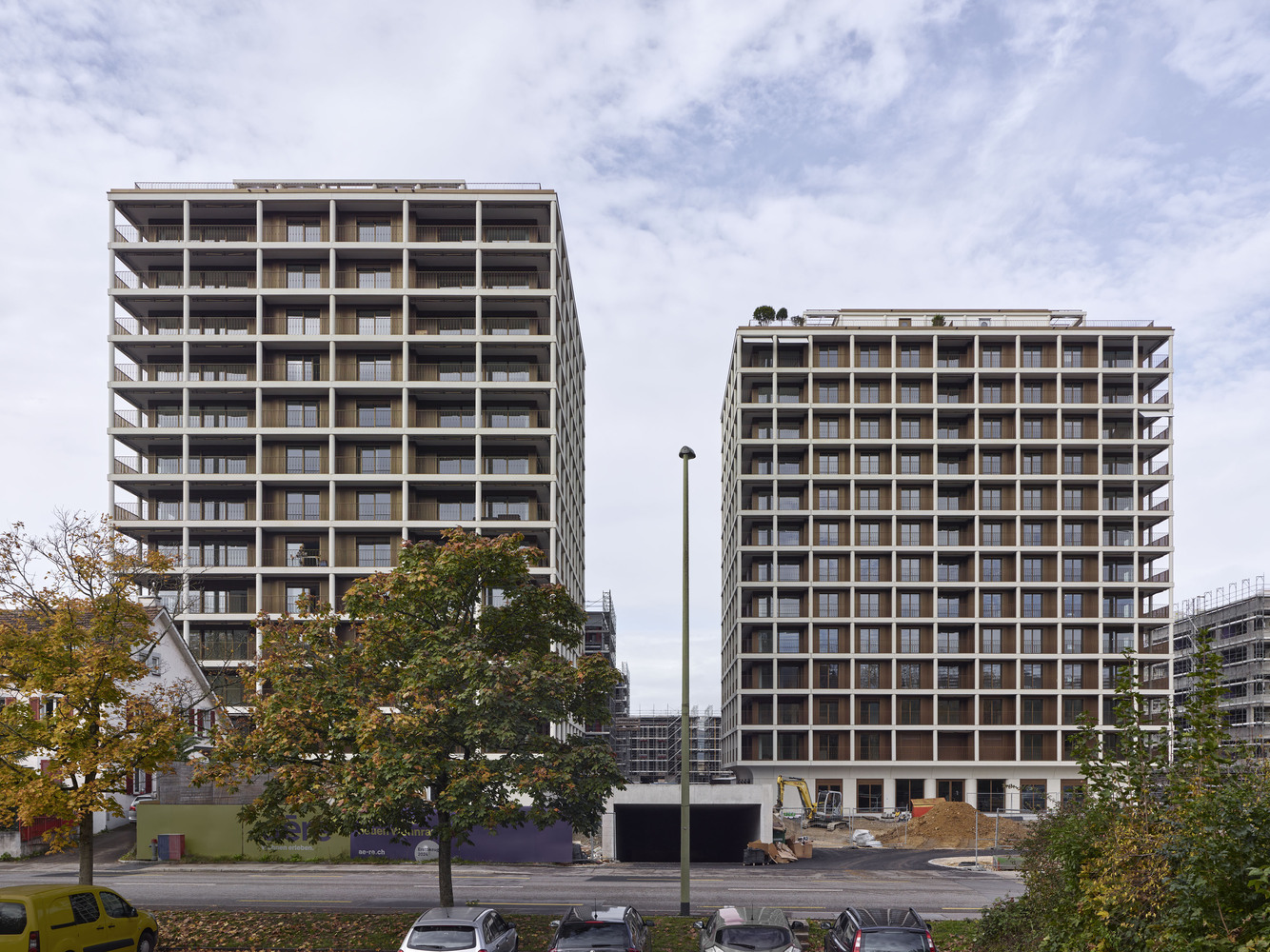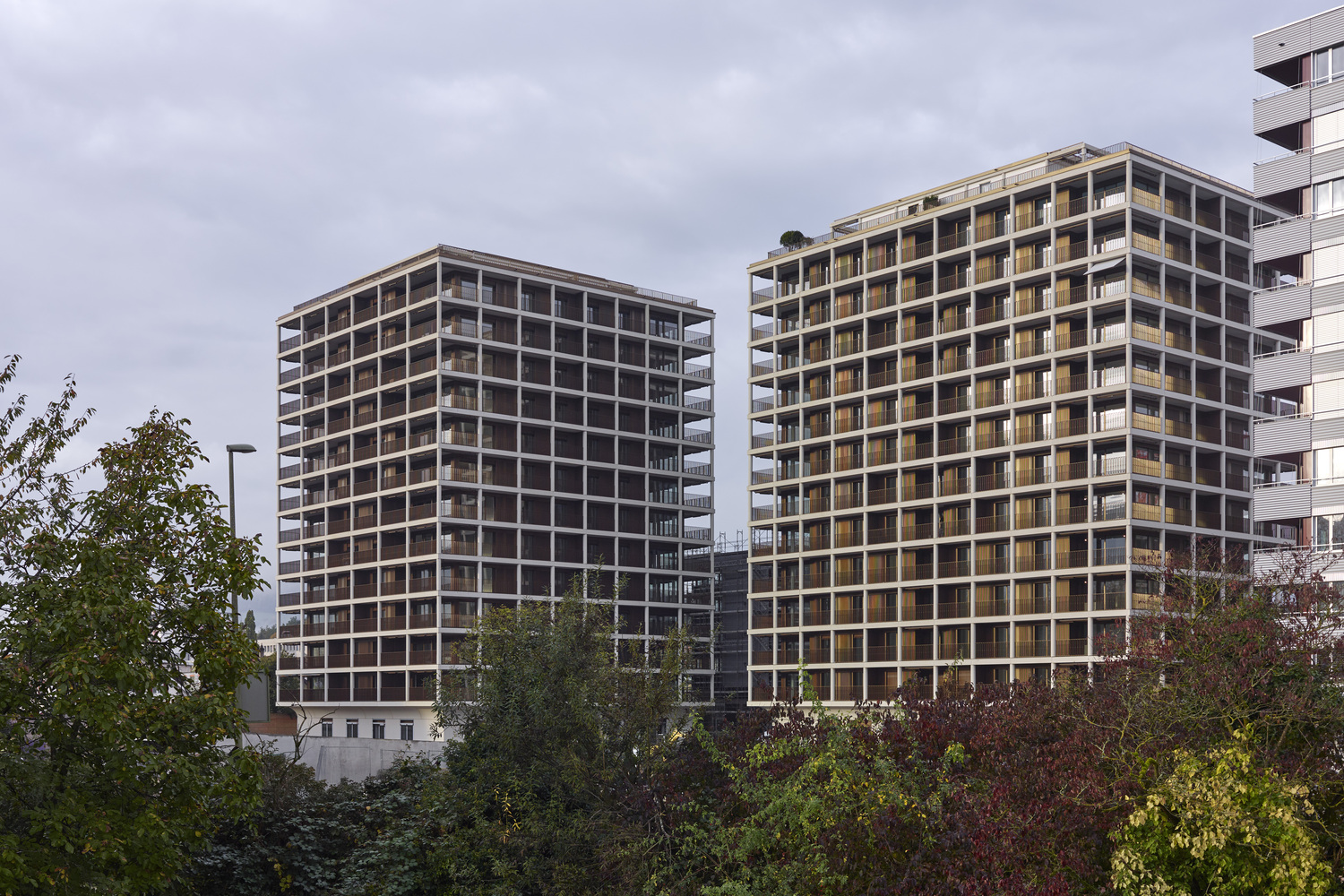 The two Max Towers are the centerpiece of the residential and commercial quarter Aere, taking shape in the former industrial district of Stöcklin, which spreads between Reinach and Aesch south of Basel. The tower volumes, roughly 40 meters high, are striking for the continuous balconies that surround each level over a recessed ground floor. The girdle of balconies merges the urban flair of high rise living with the qualities of generous garden space associated with a family house.