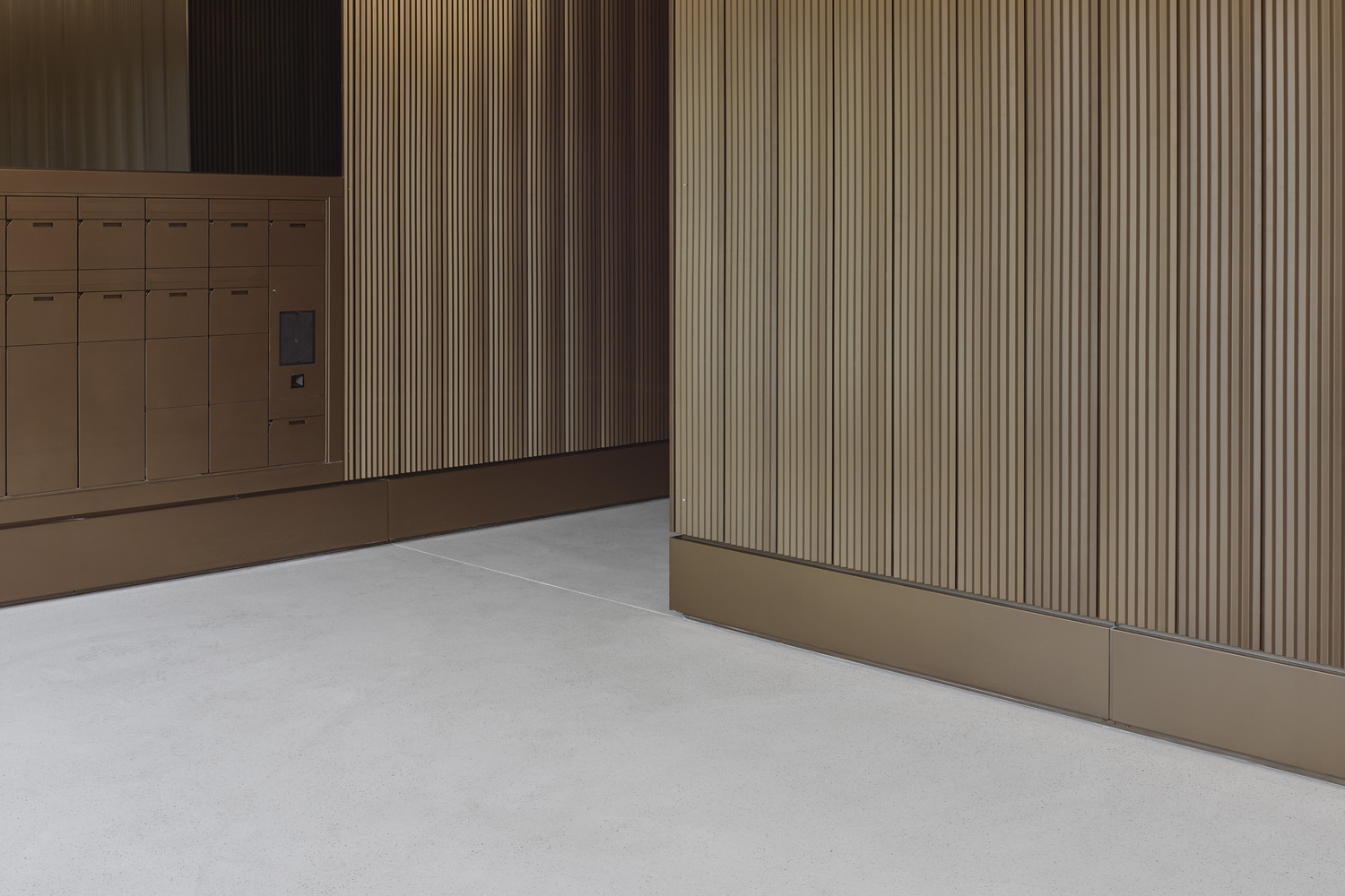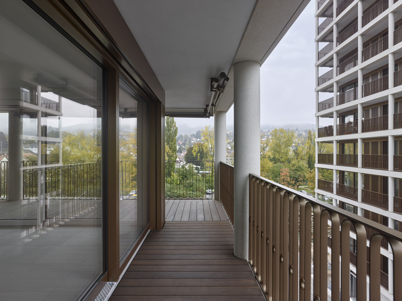 특히 목재 바닥재와 황동색 금속 난간의 조합은 차가울 수 있는 콘크리트 구조물에 따뜻함과 인간적 스케일을 부여한다. 이러한 소재의 선택은 막스 두들러 특유의 섬세한 디테일 감각을 보여주는 대목이다.