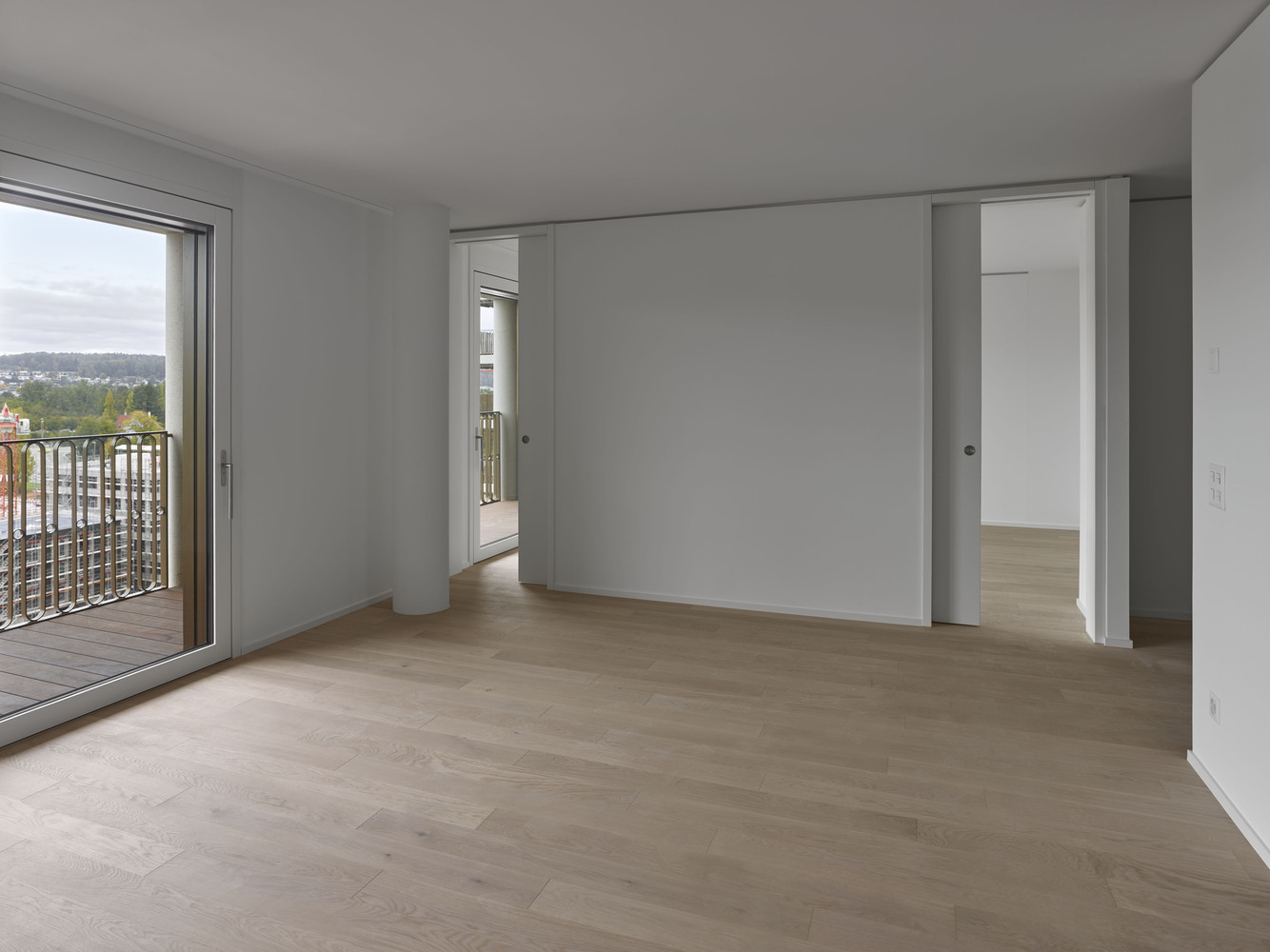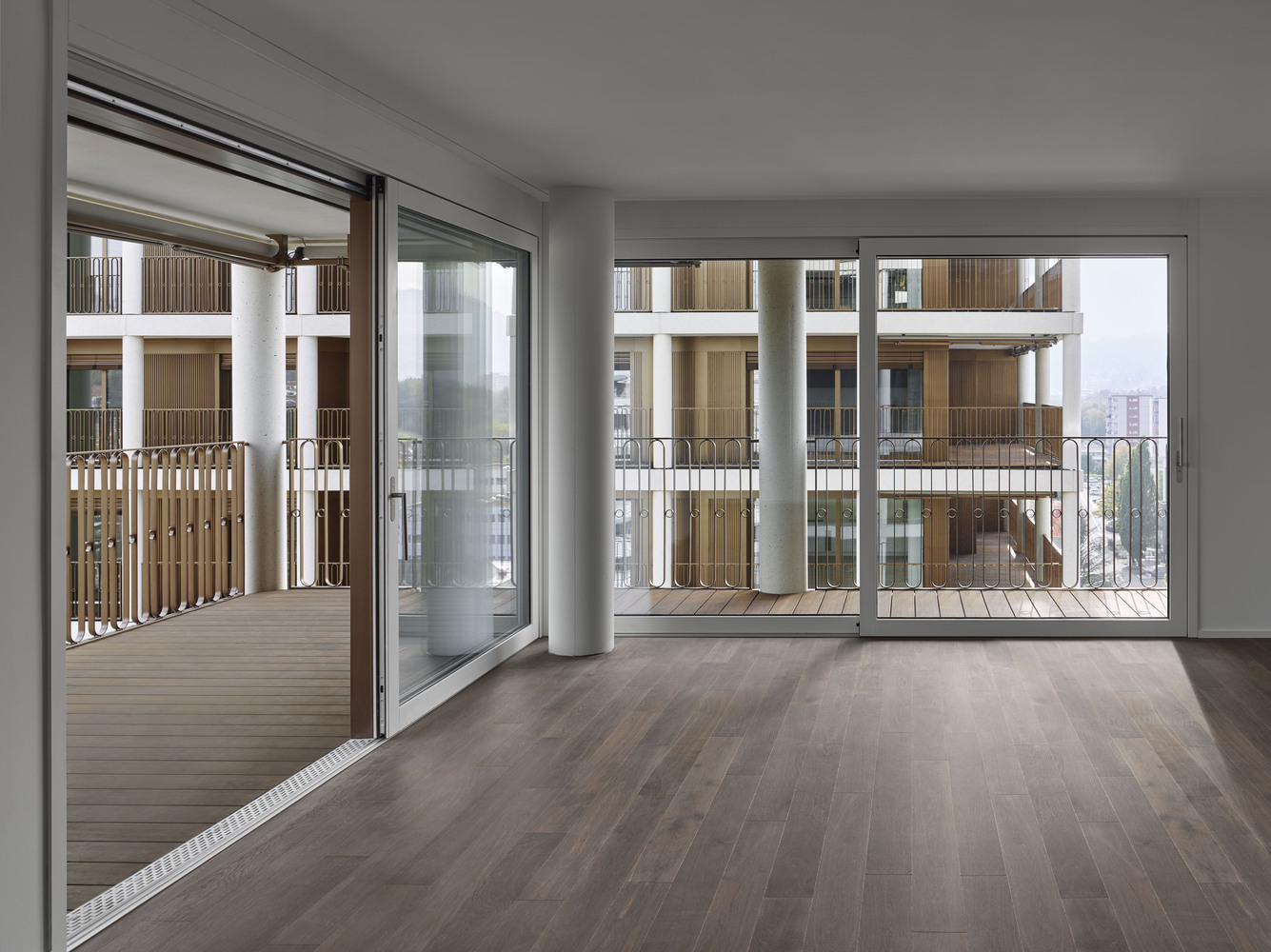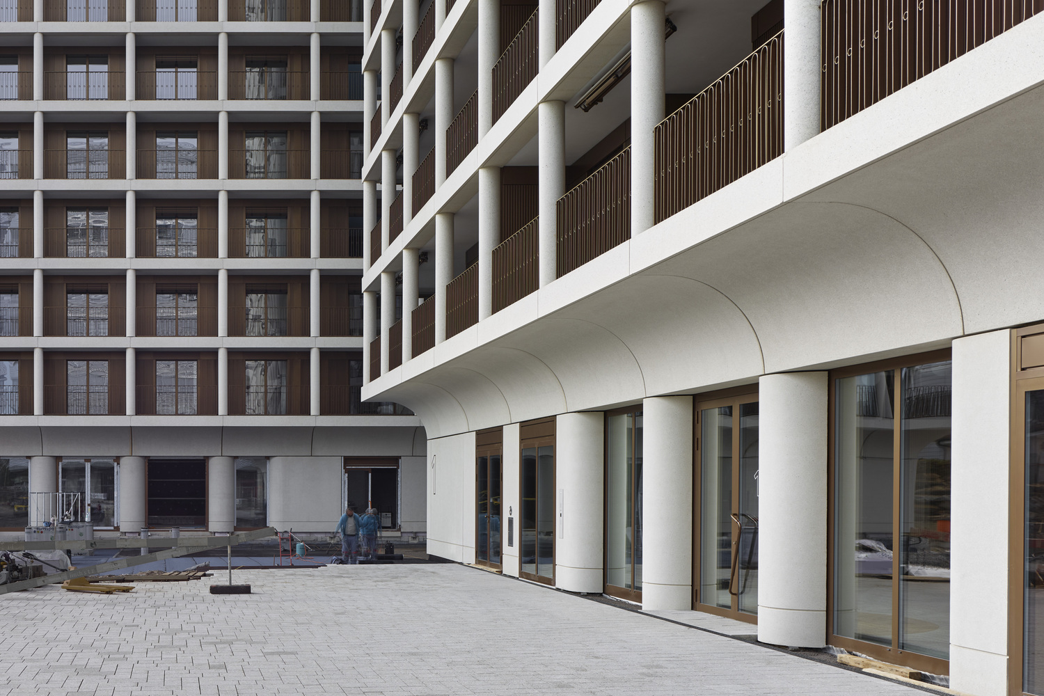The tectonic arrangement is completed on the outside by a mantle of solid columns with cornices integrated into monolithic ceilings. The inner façade behind these constitutes a second skin, benefiting from greater liberty as it steps forward and back to generate an efficient footprint. This meandering balcony zone enlivens the relationship between indoors and outdoors while serving as a filter and as a layer of flexible space.